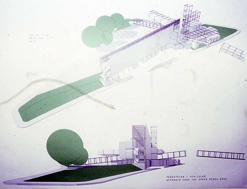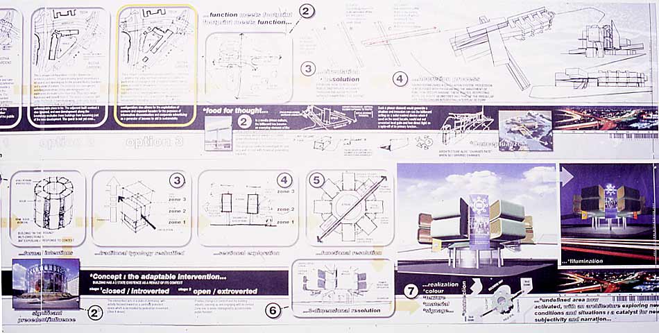 Fragments: A place for architecture Part 2 Project 2002 David Louis University of KwaZulu-Natal Durban | South Africa "Fragments - A place for Architecture" is a manifesto for new urban conditions to accommodate architectural interventions within the "fragments" that exist in our city. The city produces its own wastelands: sites, residual urban structures and ill-defined links severed from the traditional centre by railway lines, motorways and fly-overs. These unresolved spaces within our city create a confusing yet potentially liberating situation. For it is here in-between, in the absence of existing precedents to develop and codify these areas, that traditional planning authority and their methods have become obsolete. This fuels an architectural ambition intended to fully benefit from the latent potential of these "derelict" sites, drawing inspiration from the poetic beauty of the seemingly "artless", "empty" and "mundane". With a design philosophy deeply rooted in an optimistic attitude towards the potential of our contemporary (D)urban landscape, it is the intention that these quasi-programmed spaces can and will be colonised at will by an emerging architecture. This dissertation seeks to devise a powerful building typology attuned to these landscapes hence..."Fragments - A place for architecture"The intended architectures are essentially catalytic interventions at strategic, geometric points of "loss" in the city where an exciting opportunistic architecture emerges, moulded by the events that take place on the local site whilst still contained within the overall geometry of the city. Site and space will acquire new dimensions that will constantly put the traditional sense of scale and proportion and movement to the test. They show a multiplicity of possibilities both formally and functionally: this acts as a stimulant for architectural mobility, experimentation and freedom.In addition consumers society's dependence on road infrastructure and the easy access they provide to passing or marginal zones makes for highly visible, unutilised parcels, the potential of which is begging to be exploited.Collectively these architectures will become a system of architecture, an "urban acupuncture"; nodal urban stimulation in the interest of promoting overall (D)urban well-being.In this context, the intended programme for the (D)urban fragments aims to reconcile site, culture and personal urban experience, through creating an architecture devoid of preconceived (D)urban notions. The design project entitled "Fragments - A Place for Architecture" has expanded the conventional boundaries of the Design Project. In scope, this proposal demonstrates the ability of successfully addressing a range of adaptable solutions in any number of locations. The author has identified the universal preponderance of urban leftover space and cleverly sets about addressing appropriate interventions suited to the individual needs and contexts of these "wastelands". In the milieu of the African City, and in this particular instance, that of Durban, the functional needs of the city are skillfully addressed in a case by case study, resulting in a kit of well-resolved and technically sound components that may be readily assembled in a range of configurations. The author proceeds to test these configurations within a number of contexts, and, it his felt, has achieved commendable success within these applications. The result: an appealing structure of adaptable form addressing appropriate functional requirements, while creating relevance and meaning to an otherwise disregarded fragment of space.The project has been rigorously documented and is of the highest standard in terms of architectural exploration, presentation, computer graphics and choice of visual material. The submission is deemed to be meritorious in its entirety.