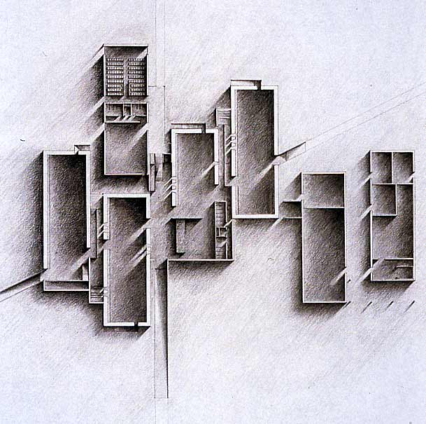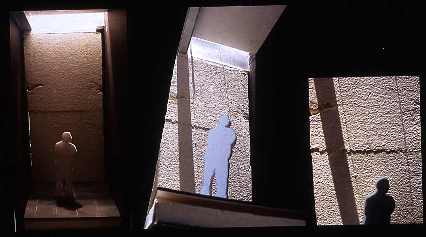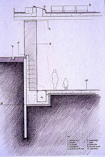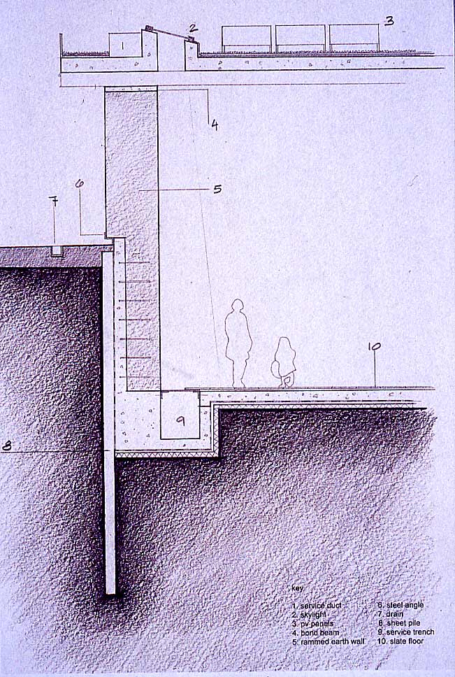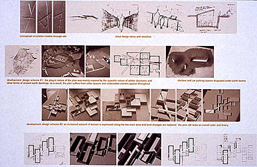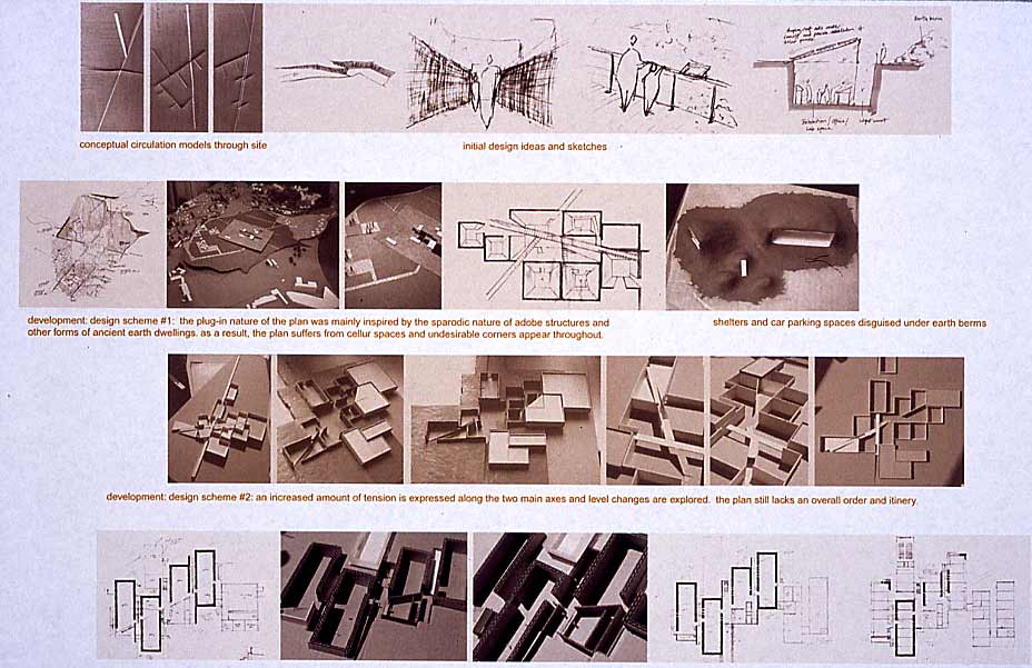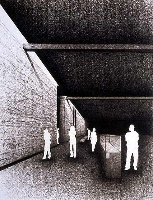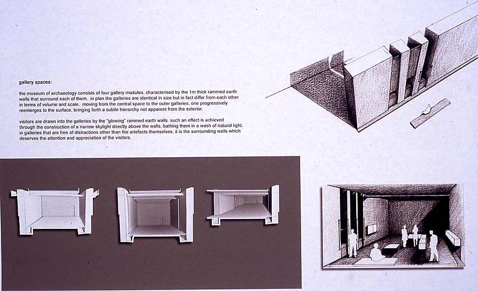 Museum of Archaeology-Translating the process of excavation into architecture Part 1 Project 2002 Charis Chi Man Tsang University of Hong Kong | China Set in the midst of a Janus-like landscape of lush topography to the south and on-going archaeological excavation to the north, the museum’s central location was determined by two sources significant to the site’s recent history: the Sha-Kok-Mei Village and the now demolished temporary housing blocks. Visitors enter the museum conscious of its subterranean disposition as they gradually make their way down the ramp. The massive rammed earth walls define the galleries as the museum’s most important entities. To add a tactile dimension to the museum experience, skylights constructed directly above the walls bathe shafts of natural light down them, further enhancing the beauty of the walls' texture and layers. Rammed earth construction is chosen for its ability to resolve the dilemma of on-site excavation waste as well as offering a non-pretentious solution to evoking the stratification of the ground in section. The sparseness of the interiors and integrated display methods allow visitors to contemplate the stratified elegance of the earth walls, and thus appreciate the very root of archaeology.The four gallery modules, though equal in area, differ in volume and scale. Moving from the central space to the outer galleries, one progressively reemerges to the surface, bringing forth a subtle hierarchy not apparent from the exterior. Narrow embrasures punctuate sections of the walls, increasing visual interaction between those inside the galleries and those in the interstitial zones. These incisions help reiterate the thickness of the walls and provide alternative areas of display. At a time when edifices tend to veer towards the overt and abstract, this museum’s design is considerably muted in the extravagances one often sees in its contemporaries. With a clear absence of the ubiquitous steel and glass, this scheme focuses on translating the process of excavation into architecture In the first instance, this project maintained a particular focus on issues of sustainability, in both the present as well as an archaeological tense of the word. It was, and it still is, important to the designer to retain a tactile engagement with the site and its architecture by reinforcing the design ideas of this museum through a complex layering of ideas, motifs, vistas with a sensitive manipulation of building materials; and methods in construction. The design of this museum is to be experienced from every surface and every vista, from both horizontal as well as vertical dimensions. Light is the omnipresent element by which these museum spaces are measured. With the sharp slivers of light into these exhibition spaces, pitched against hewed surfaces rendered by rammed earth and concrete, the reality of archaeology is both maintained and embraced. This project is well illustrated with both rendered drawings & sketches as well as forced perspective models that highlight individual spaces