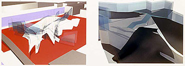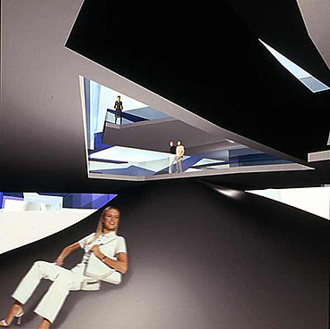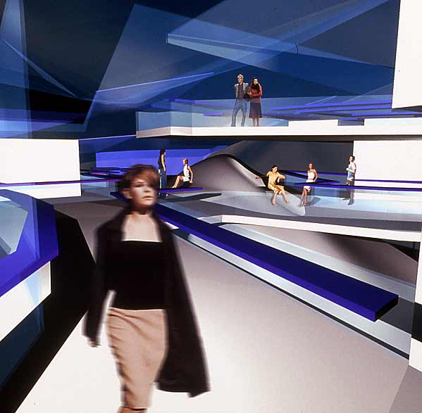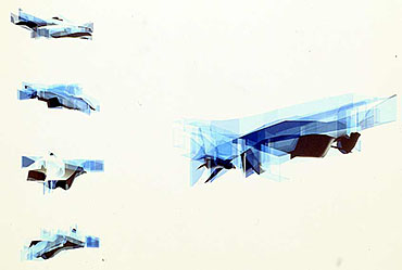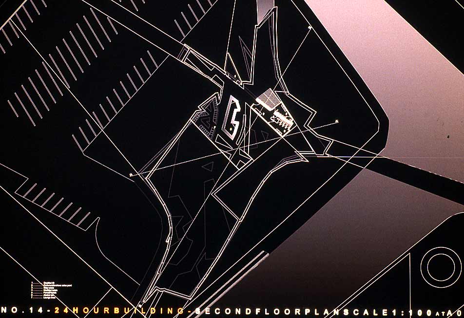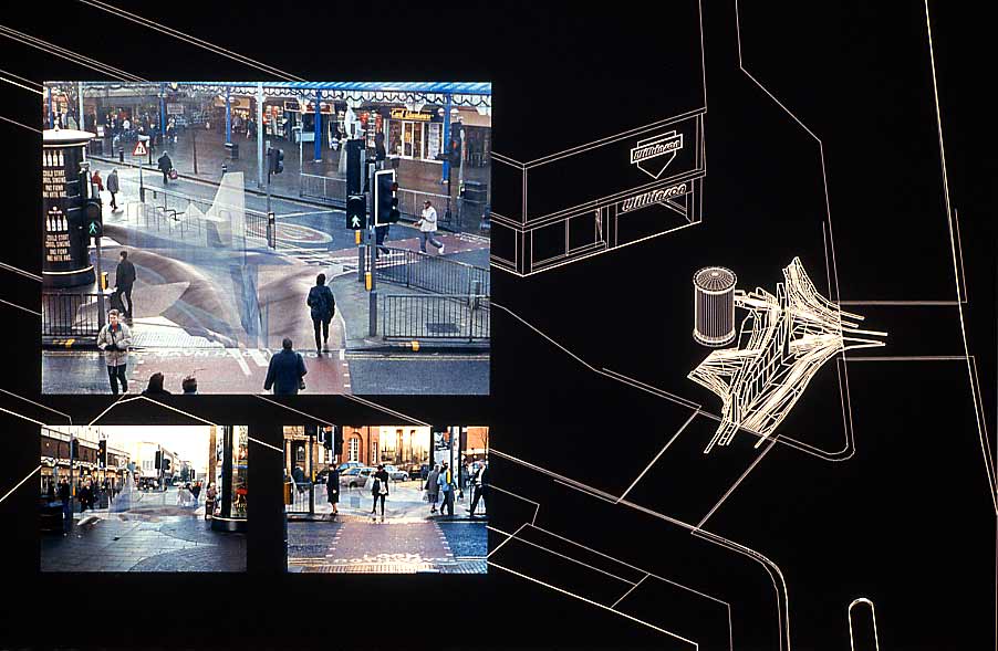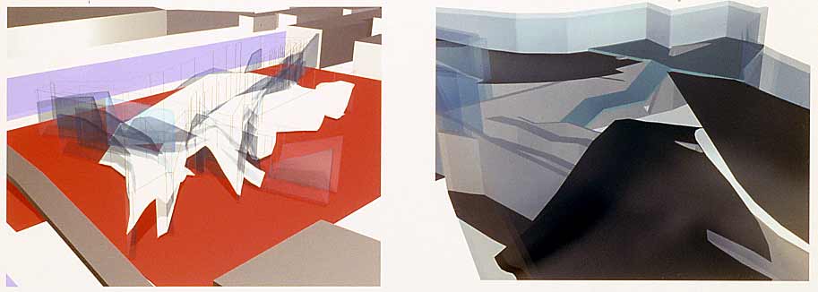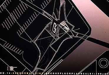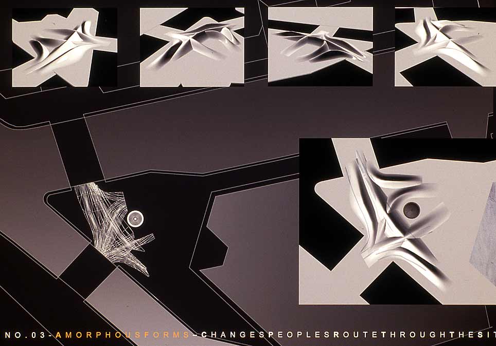 24HOUR BUILDING Part 1 Project 2002 Russell Everton University of Lincoln Lincoln | UK This project began as an investigation into the movements of people through an arbitrary site in the city centre of Hull. Using video footage of the site (slide 1 and flick book) peoples movements and choices of route with plotted (2). The space and forms that we created by these paths and the forms between them were interpreted into a computer model (2). Another study of the site was about the relationship not only between people and others, but their routes on the most efficient path (3), the combination of the two studies lead to an interesting juxtaposition between both amorphous and linear forms. These forms were used to design a physical installation, a landscape for the site, dealing with issues of; rights of passage, courtesy and use of efficient routes (4 and 5). The virtual installation is the collection of forms in an unaltered state.This is a three-dimensional architectonic-language from which the main building was designed (6). A site in the city centre of Birmingham was selected. Roads, footpaths, a canal and a disused rail track, all surround the site. Due to the presence of the canal and road the site is part of a fragmented area (7). The main notion of the brief was to use the building as a public passageway, a hub that connects all of these areas. Having in mind a manifesto of creating public routes through a private building a brief was contrived to cater for 24 hour opening with a use befitting of the area. Around the theme of relaxation and invigoration, a gymnasium with sauna, steam rooms, etc and a series of bars including oxygen, water, coffee and alcohol (12,13 and14). The language was inserted, scaled and orientated so that four of the original paths were used to create new fixed routes. The external form was fragmented by gridlines then angulated, these angels were informed by changes in acceleration in the original movements. Russel's project began as an examination of the spatial traces left by pedestrians in a street, using time-lapse video. He then embarked on a journey of exploration into video installation and computer imaging that seamlessly developed into a architectonic language. Along the way he explored ideas involving virtual and real installations, materials and materiality, constantly testing these ideas in virtual and real sites and non-site environments. He concluded his work with the formation of an exuberant collection of forms, spaces and programme that he called 24-hour building.