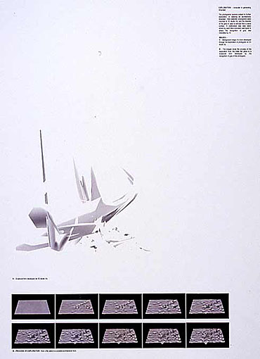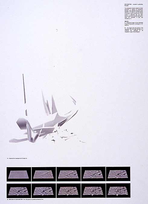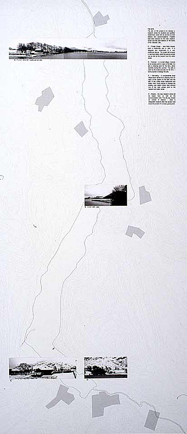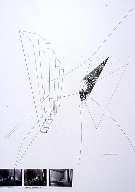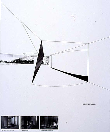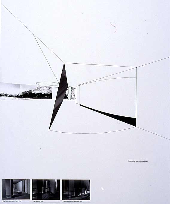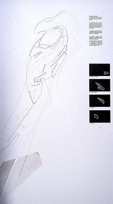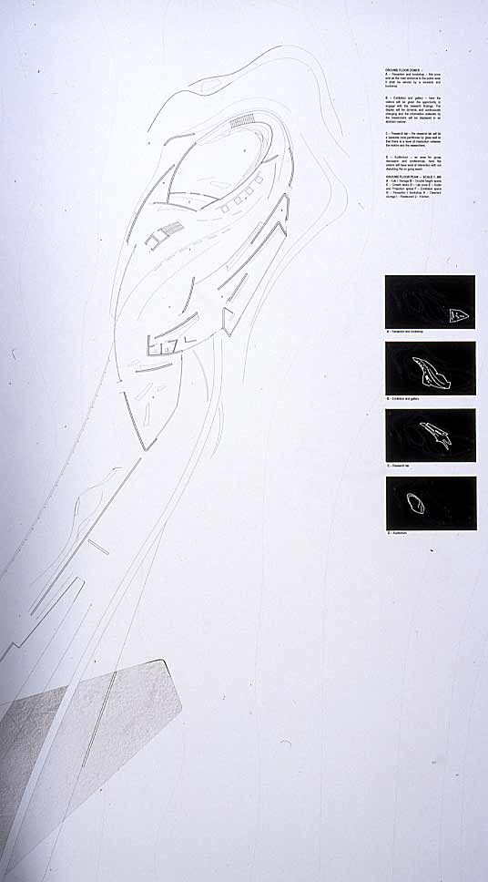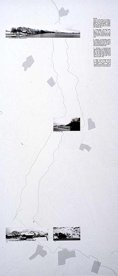 Geological Research Center Part 1 Project 2002 Saleem Al-Mennan University of Lincoln Lincoln | UK ‘What would you see if your vision could encompass an expanse of one billion light years? Or if you could peer inside the microscopic realm of the atom?’‘The powers of Ten’- (Charles and Ray Eames) became the catalyst for the project. The project begun by exploring the non-tangible and the ephemeral qualities of Ulswater, Lake District. The research method inspired by the power of ten, looked at the site in its wider context, it looked at the site at different scale of magnification zooming to the human scale, each time revealing qualities not visible to the human scale. From this stage samples of elements were taken from the site. These elements were studied and recorded under microscope at different scale and condition. The information was translated both metaphorically and literally into mesh and wire models, these models became subject of further exploration, recorded via photograms with different contextual constraints and site conditions. My architectural proposition of a ‘geological research center’ morphed out of the exploration of selected photograms. The exploration used varied mediums ranging from computer to 3D models to generate an architectonic form and spatial poetics, influenced by the research and program. The building is a juxtaposition of layers of information collected from the domain of Geography, Biology and Chemistry . It is where the human scale meets the microscopic scale, informed by the research and the study of ‘Powers of Ten’ where it illustrated events of different scale, which existed in one moment of time. Here I have taken this idea where by the main research/visitor center was generated by the study of the microscopic elements from the site this was juxtaposed with units of accommodation and landscaping, informed by events and structure traceable at the human scale. The dotted lines on the plan are taken from trajectories of points of interest (the mountains around Ullswater). This is an event of the human scale which informed the formation of the landscape that connects the accommodation units, (main elements of which has been informed by the scenic views, topography and local materials) with the main research/visitor center. Saleem's project, a geological research centre, demonstrates an intrepid journey in search for the possibilities that may reside within an architectural language. Initially inspired by the Eames film, Power of 10, he passed seamlessly onto growing bacterial fungi in petri dishes and examining these under the light microscope,eventually developing his landscape and building proposals folowing a process of translation from 2-D TO 3-D models using photograms and computers. Throughout, his energetic and copious work he has been guided by meticulous methodology, exquisite execution and never-ending commitment.