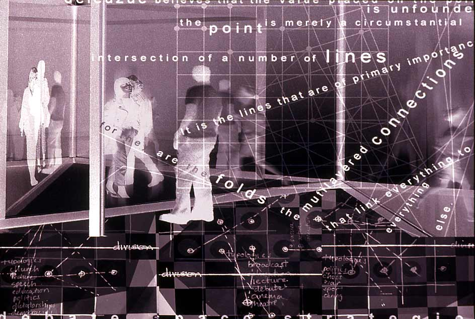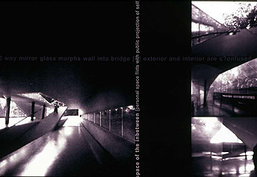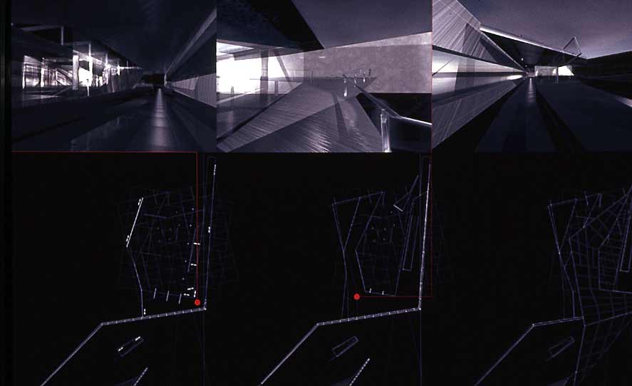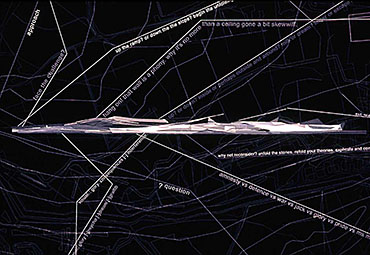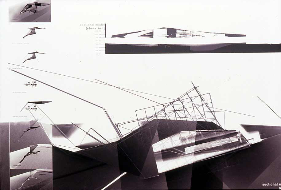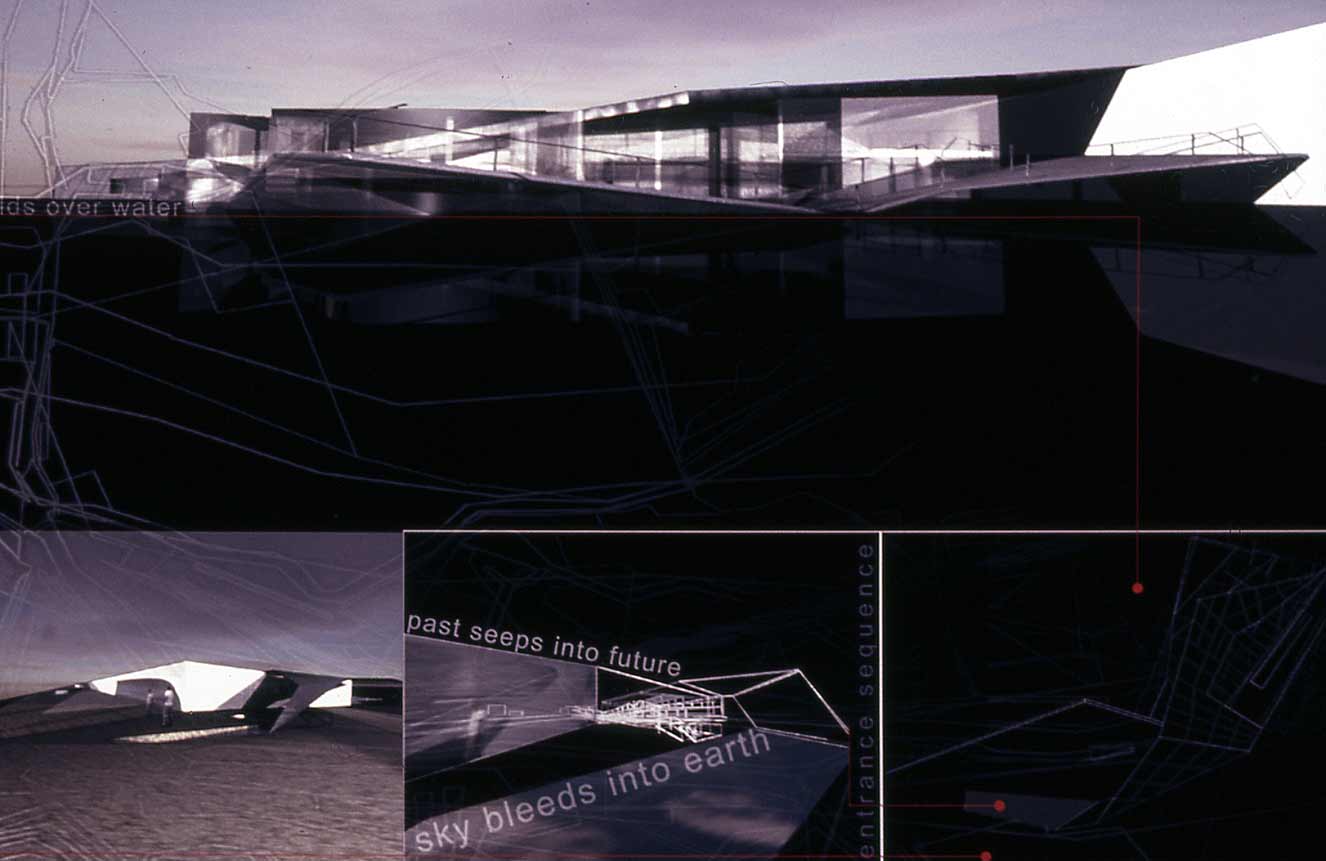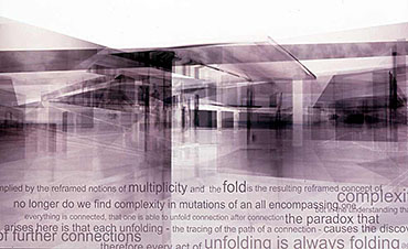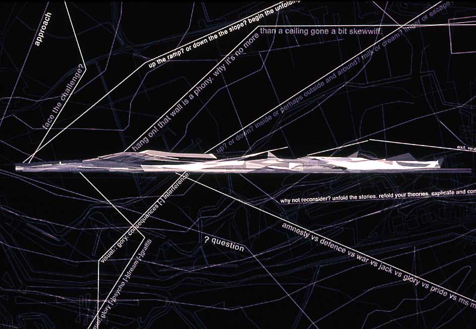 folding un]folding re]folding Part 1 Project 2002 Richa Mukhia University of Westminster London | UK The theoretical basis of the project is grounded in the work of Deleuze and his writings on the fold, complexity and the multiple. It responds to Le Pli with an architecture that attempts to overflow the frame of the perception of the user, with an experience that constantly incites uncertainty by inviting each guest with its antonym. The host is thus required to reassess accepted concepts.A picturesque ramble in the secluded woodlands of the Waltham Abbey Gunpowder Mills is disturbed by the violence of distorted promenades through the landscape. Like Ts’ui Pen's ‘Forking Paths’, a labyrinth of possible divergences unfolds. Projections supply propaganda from Amnesty International, war museums, governments and individuals. Unfolding inconsistencies, and refolding opinions. Conceptual unfolding is echoed by the warping form, the vertical wall fractures into the sky overhead whilst the horizontal ramp responds by twisting into the earth. Every fold in the architecture presents the user with yet another possible route, another angle on the landscape. Apathy is not an option. The muted acceptance of vertical, horizontal, point and node is superseded by the clashing spectacle of the multiple, of divergence and of connections.The culmination lies in a space of debate and reflections, a space that basks in the inbetween. A maze of two way mirror glass walls morph into metaphorical bridges that confuse exterior and interior, landscape and structure, future and past. The dissolution of such fundamental boundaries anticipates a break from the accepted territorial and antagonistic debate, to one that revels in the opportunity to create new associations. A glorified hall of mirrors where users can freely share space with distant strangers, debate, listen, observe or hide, where multiple readings of depth, perception and self are [re]connected. The site; Waltham Abbey Royal Gunpowder Mills. Recently opened to the public for the first time after 300 years of secrecy, a secluded woodland and an architectural wonderland where much of Britain's explosives were produced. A place where danger and explosion risk turned normal architectural and planning conventions upside-down.The brief; • to understand and convey architecturally, the global significance of the place and its unique social history, • to re-connect the Mills with Waltham Abbey town, with architecture and landscape uninhibited by heritage preciousness,• to learn from the unselfconscious inventiveness of those who built this unique garden of experiments, in order to resuscitate it.The proposal;Richa’s sequence of enclosing architectural promenades - through dense alder plantations, past derelict nitroglycerine hills - warp and distort ones perceptions and culminate in a space for debate and reflection. From theoretical interests in Deleuze’s writings on the fold, complexity and the multiple, and Le Pli, to 1;20 sections and 1:5s, Richa’s architecture juxtaposes space for Amnesty International and a linear war museum. She enfolds landscape, history, memories and sky in her architecture - with a skill her External Examiner felt worthy of an Architect with 20 years experience. Take cover!