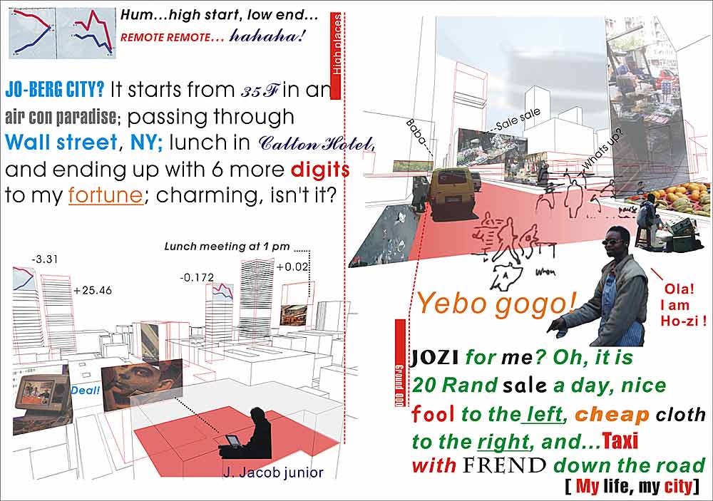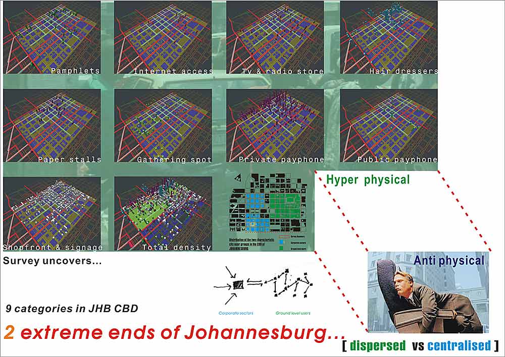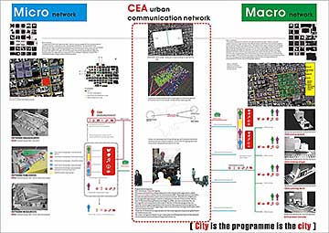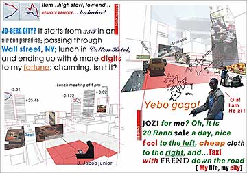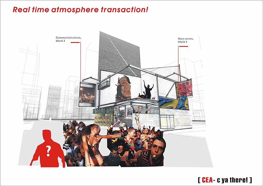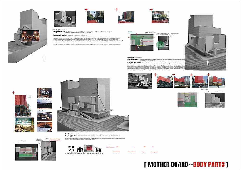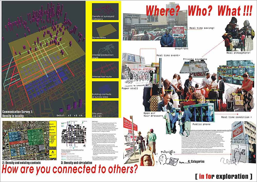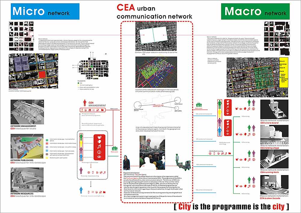 Infoband - City Event Agency Part 2 Project 2003 Pin Wei Dylan Kuo University of the Witwatersrand Johannesburg | South Africa Looking at city as collages of personalised experiences, this project is investigating the potentials to energise the city of Johannesburg, by expanding the variety of living experiences through info-networking different levels of urban community. An urban communication network- CEA, acting as urban event developer, operating to promote public events as median to integrate different social levels within Johannesburg. This approach leads to the design of info-communication installations at varies scale, which are capable to deliver information, record and broadcast live scenes to be infiltrated into different social levels, stimulating real time social exchange across different communities. The point of departure for this thesis project was the problematisation of the city as an intense web of overlapping information and communication circuits. The student devised ways of mapping these, from the most local (cardboard placards advertising hairdressing salons in the upper stories of buildings, leaflets offering urban services etc.) to circuits of more global reach (telephone pay stations, internet cafes etc.). The design component of the project was a “motherboard”, a City Event Agency, through which these circuits could be augmented and amplified, and creating a new public space in the city, as an element of urban renewal. Satellite, parasitic electronic notice boards were located throughout the city, giving access to its information.