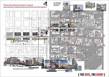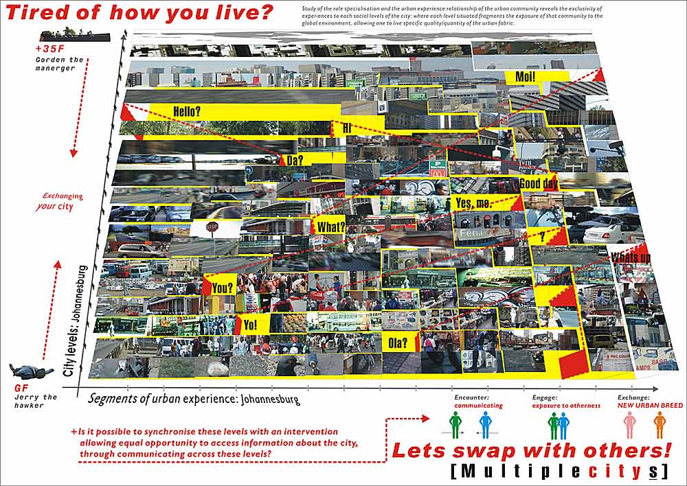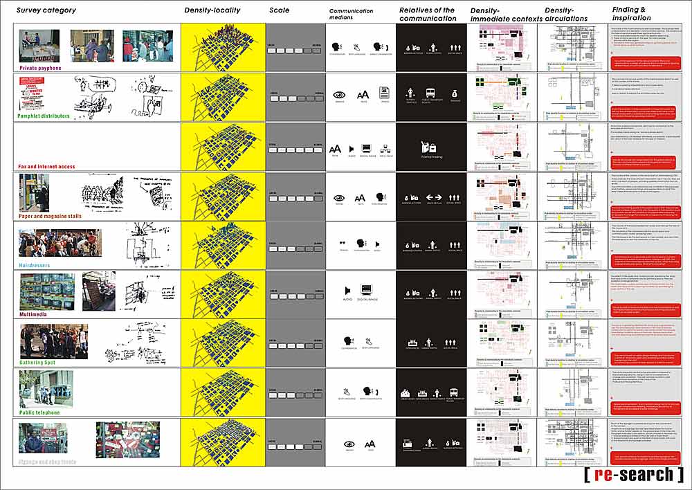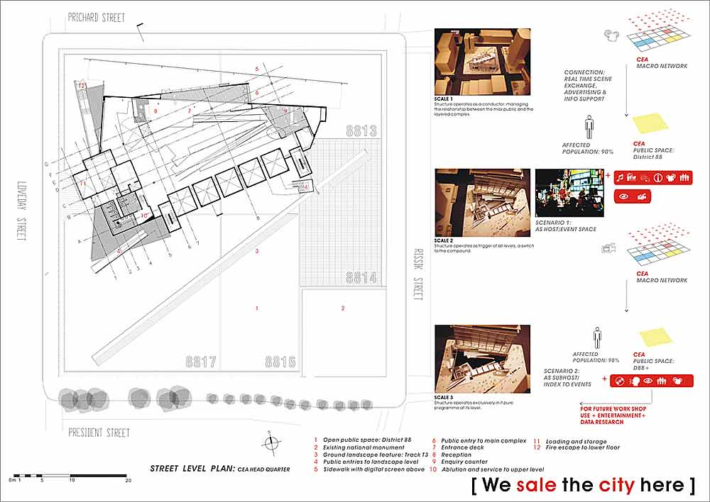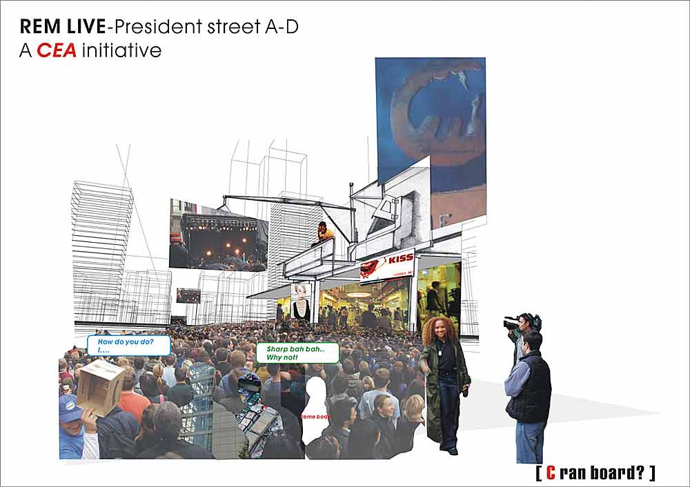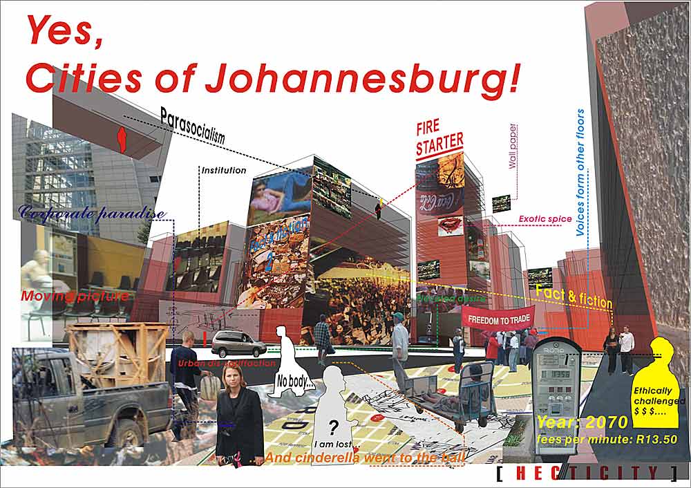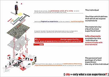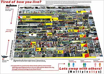 Infoband - City Event Agency Part 2 Project 2003 Pin Wei Dylan Kuo University of the Witwatersrand Johannesburg | South Africa Looking at city as collages of personalised experiences, this project is investigating the potentials to energise the city of Johannesburg, by expanding the variety of living experiences through info-networking different levels of urban community. An urban communication network- CEA, acting as urban event developer, operating to promote public events as median to integrate different social levels within Johannesburg. This approach leads to the design of info-communication installations at varies scale, which are capable to deliver information, record and broadcast live scenes to be infiltrated into different social levels, stimulating real time social exchange across different communities. The point of departure for this thesis project was the problematisation of the city as an intense web of overlapping information and communication circuits. The student devised ways of mapping these, from the most local (cardboard placards advertising hairdressing salons in the upper stories of buildings, leaflets offering urban services etc.) to circuits of more global reach (telephone pay stations, internet cafes etc.). The design component of the project was a “motherboard”, a City Event Agency, through which these circuits could be augmented and amplified, and creating a new public space in the city, as an element of urban renewal. Satellite, parasitic electronic notice boards were located throughout the city, giving access to its information.