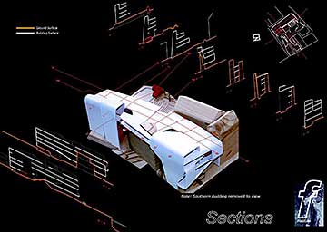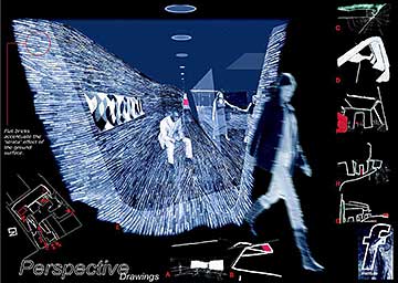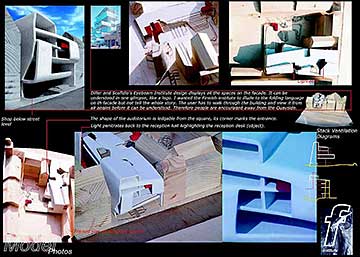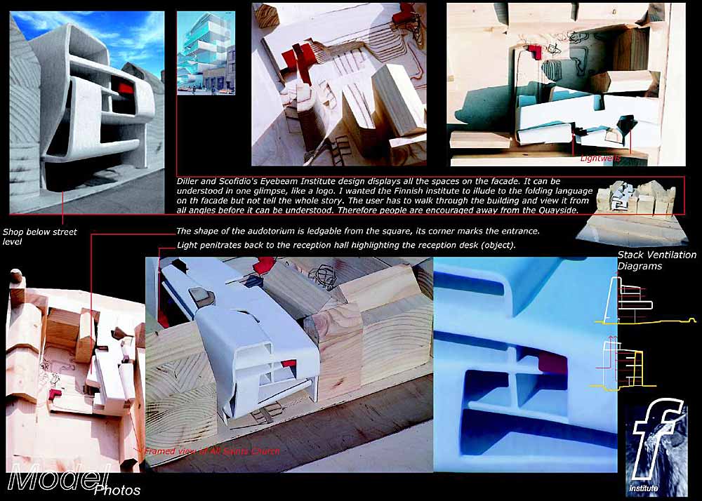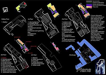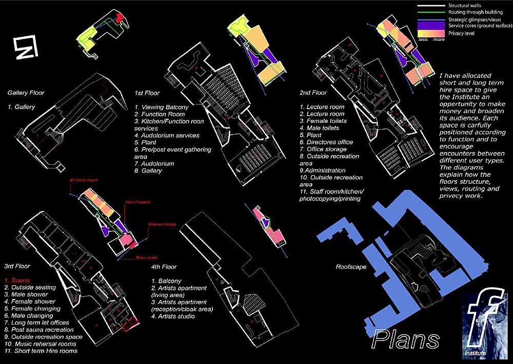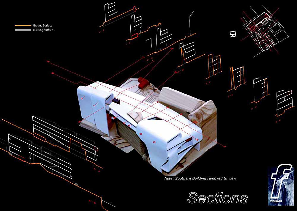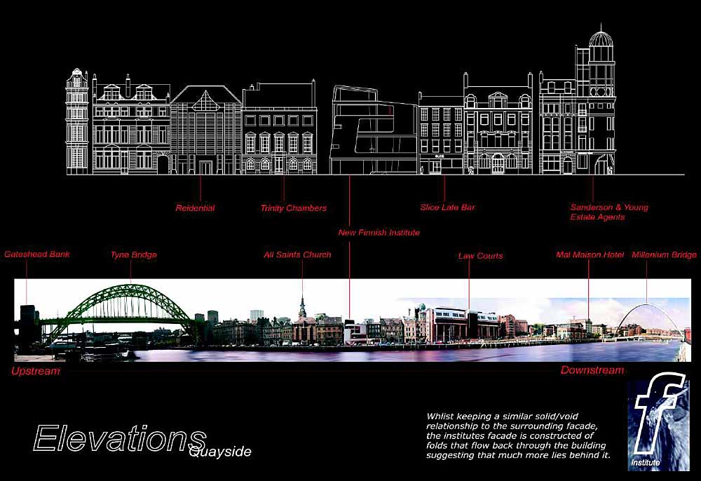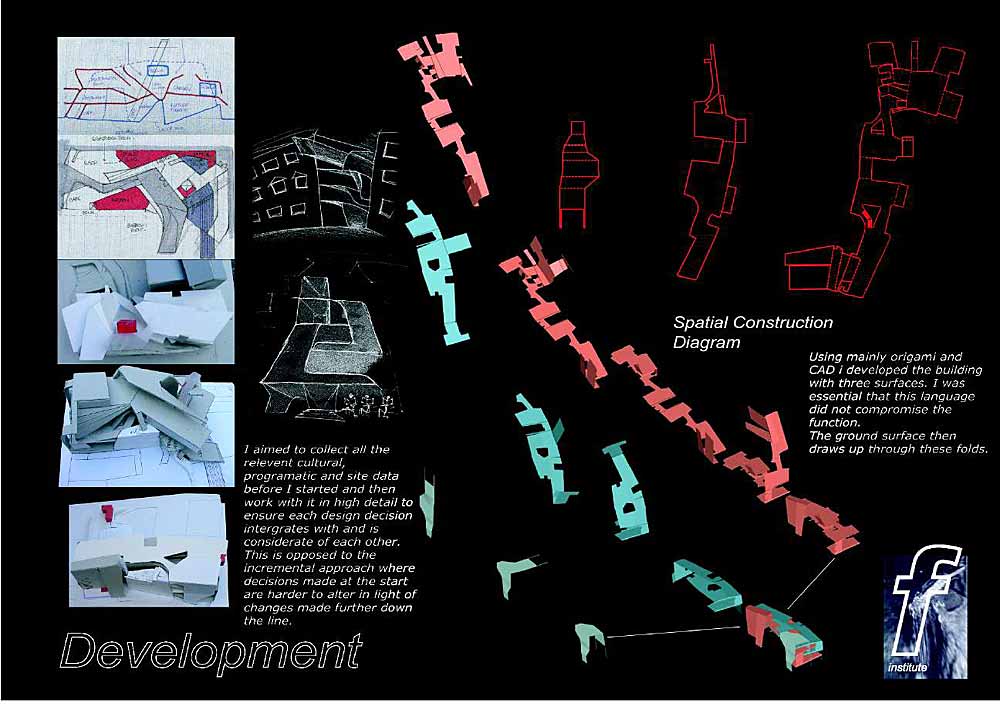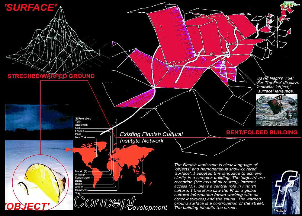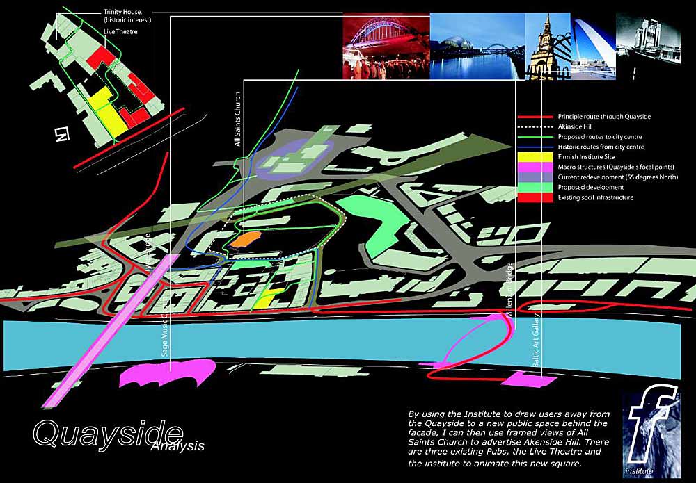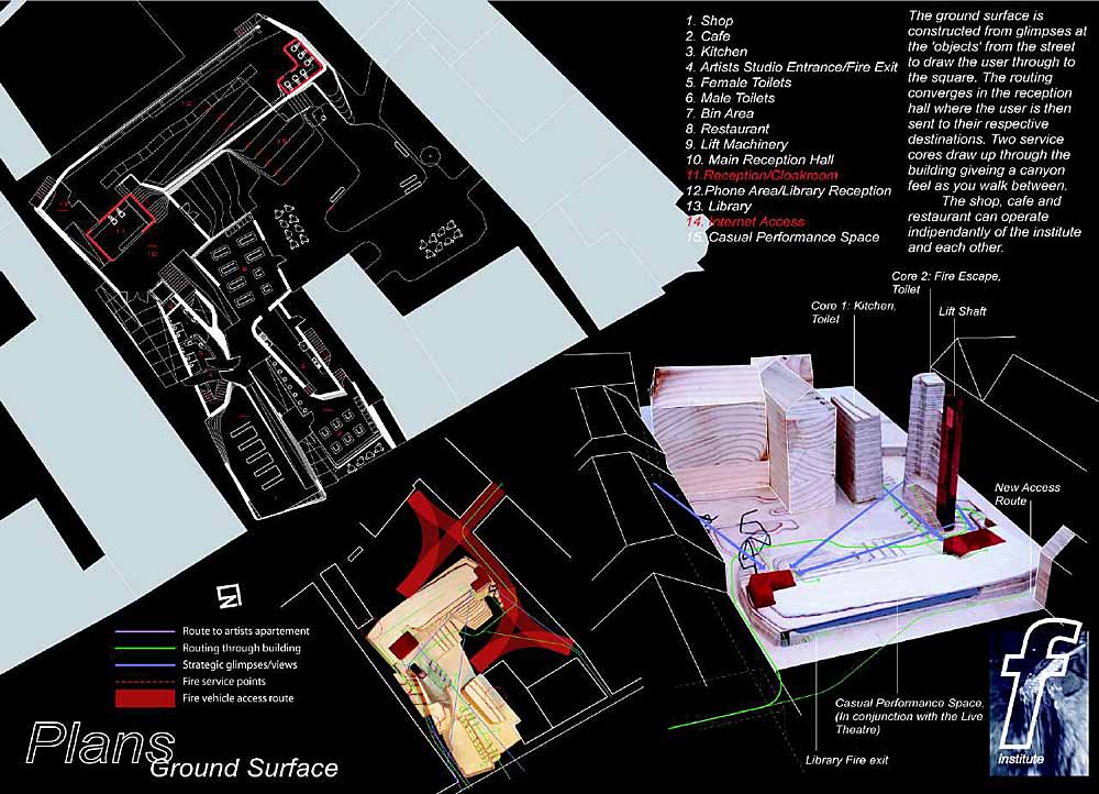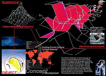 A Finnish Institute for Newcastle Part 1 Project 2003 Alex Jackson Newcastle University | UK The clarity of the Finnish landscape permeates through their culture influencing furniture to their direct manner of communication. I wanted to embrace this clarity within the institute. The Quayside’s complex topographic and historic layers required an intricate response to deal with the many facets of the site. Faced with apparent contradiction I developed a clear language (derived from the Finnish landscape) of ‘objects’ (places of significance used to navigate the building) and ‘surfaces’ (a warped/stretched ground surface and 3 bent/folded building surfaces.The Quayside is an inevitability so I concentrated on engaging the institute with a new square to draw the user through the façade and publicise the Akenside Hill, an area strangled by motorway. This compliments current development. Alex's project drew inspiration from the Finnish landscape. This he reinterpreted by developing a language of surface and object in which the latter is defined by function (a la Hadid), connecting with traditional route patterns in the historic Newcastle Quayside setting. We were impressed by the bold concept, the consistency and imagination with this theme was pursued. The student created an intriguing object that straddles the boundary between landscape and urban fabric, invites exploration while making opportunities for cultural encounters - all without neglecting the functional requirements of the brief. The use of daylight is evocative, the materials are uncompromisingly 'hard', but appropriate to achieving the landscape 'folds'; the solid/void and proportional relationships anchors the façade in the streetscape.