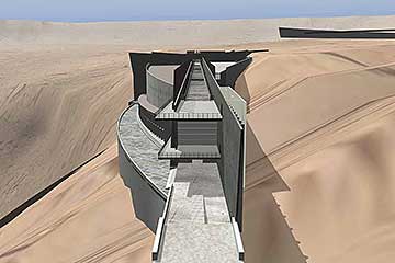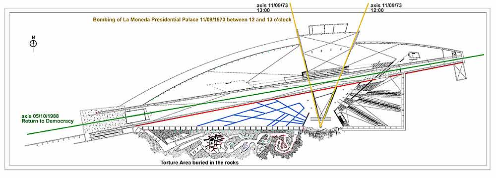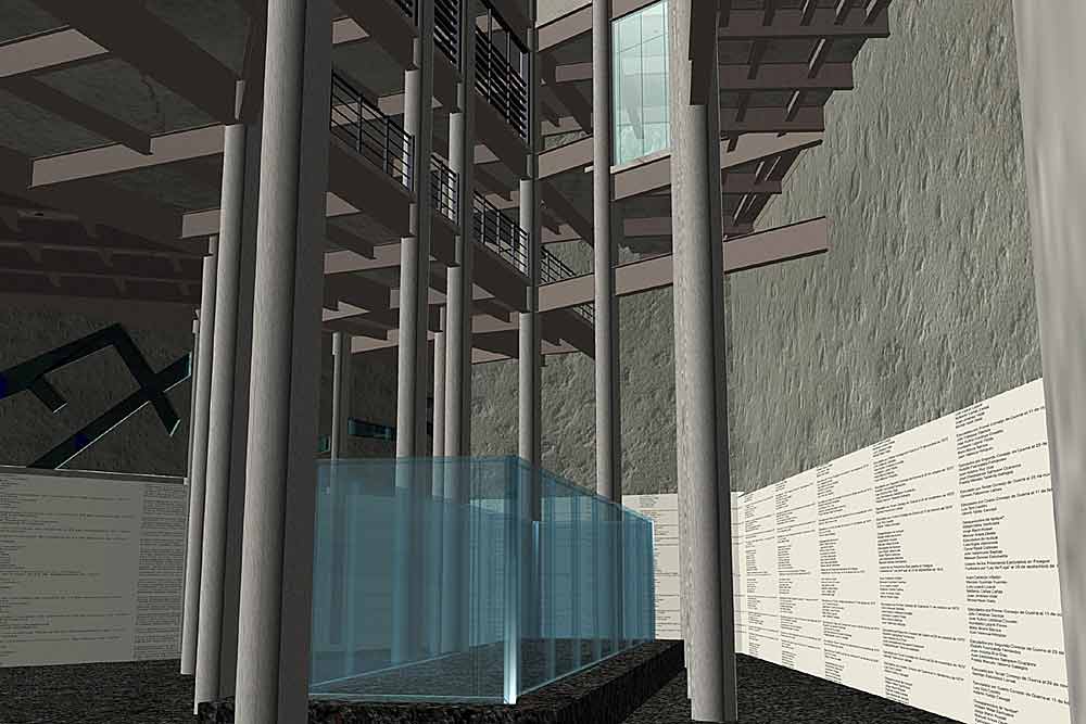Memorial Museum of the Military Dictatorship in Chile Part 2 Project 2003 Cristian Mauricio Vergara Sanhueza University of the Bio Bio | Chile Remember and reconstruct the forgotten memory of 17 years of dictatorship in Chile is the objective of the MMMD, situated in Pisagua, ex-prisoners camp.It's design reflects the ‘Unheimlich’ (Freud, 1953); "That class of the terrifying which leads back to something long known, once very familiar, but now hidden, in the shades". That is why the geometry and formality of the MMMD is based on the solar map of 11/09/1973. The visit is structured along the human rights that were violated here. This sensorial and physical experience creates a conscious memory so that this history never repeats itself. This project offers a strong architectural response to the necesity of our country to face it’s past in order to evolve towards the future. The dictatorship has never before been tackled as an architectural project in Chile. The MMMD is excepcional among this year’s projects for its very firm fundament both in a filosofical as in a sensorial way. The challenge to insert this design in the desert and the use of a very proper and particular language of evocation, physical experiences and dreams, enhances it’s guiding and poetic character that stirs the body and the mind.