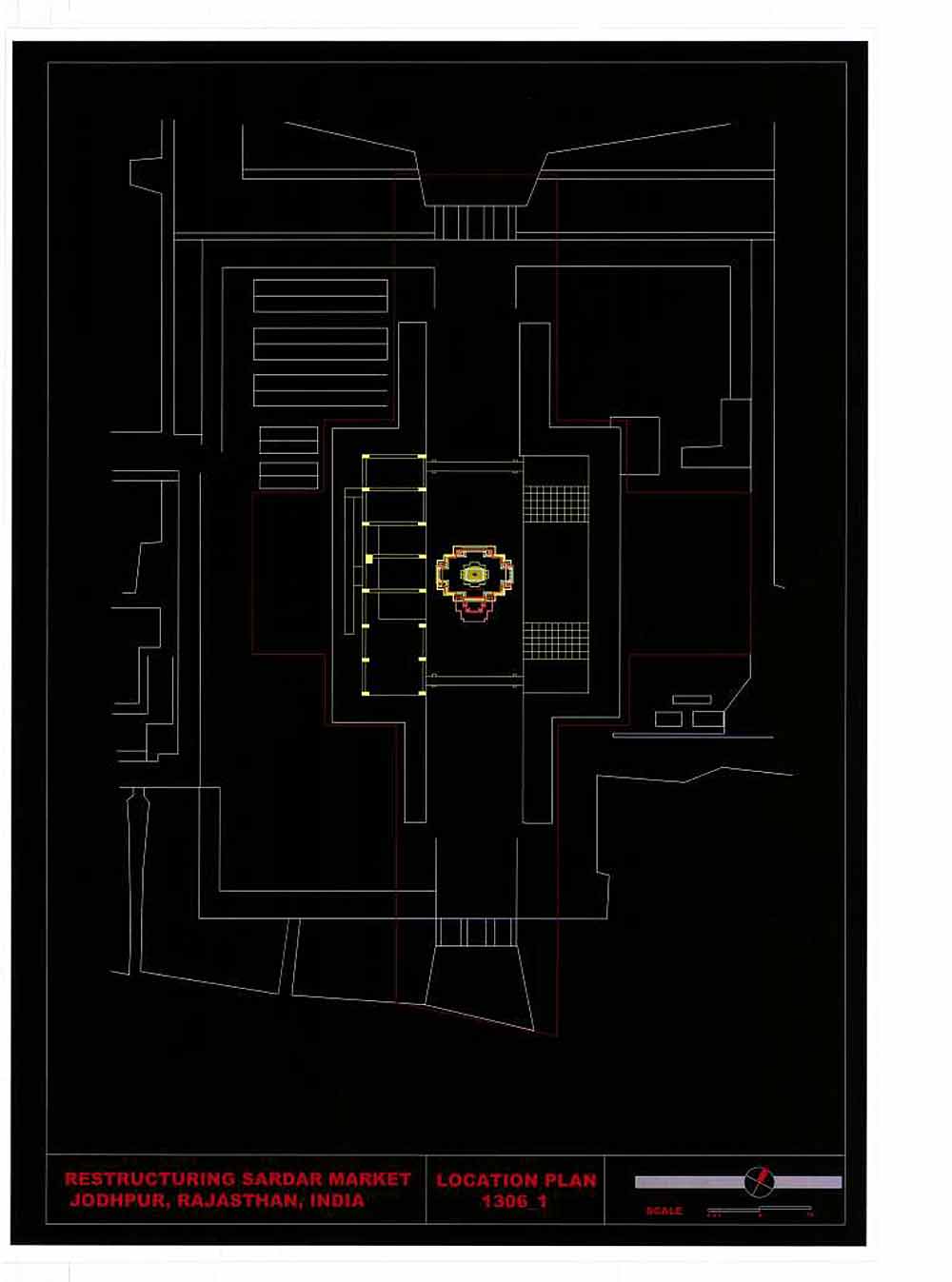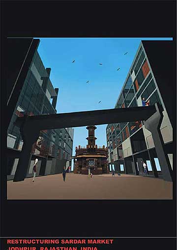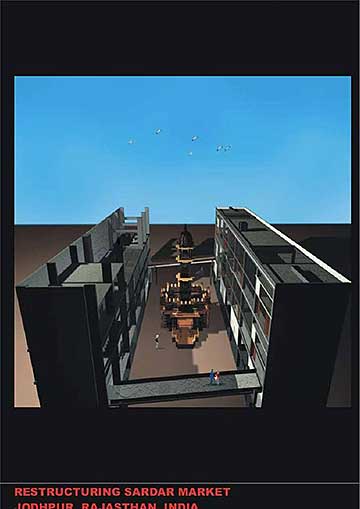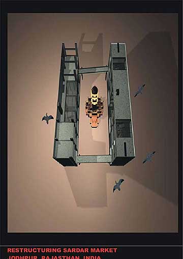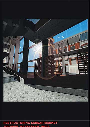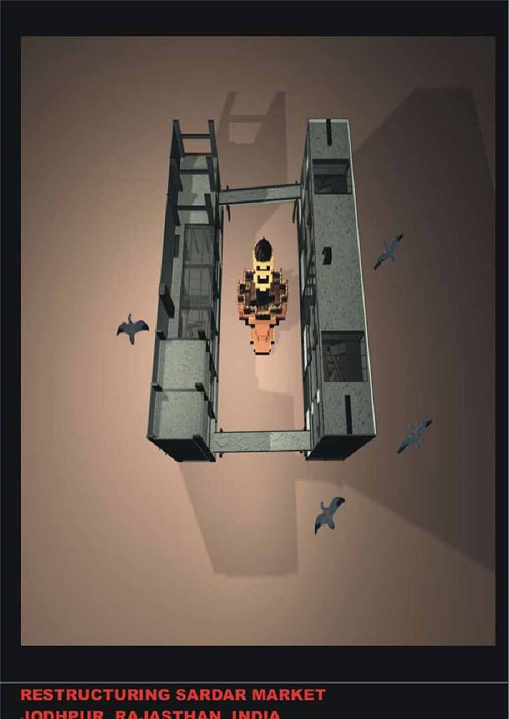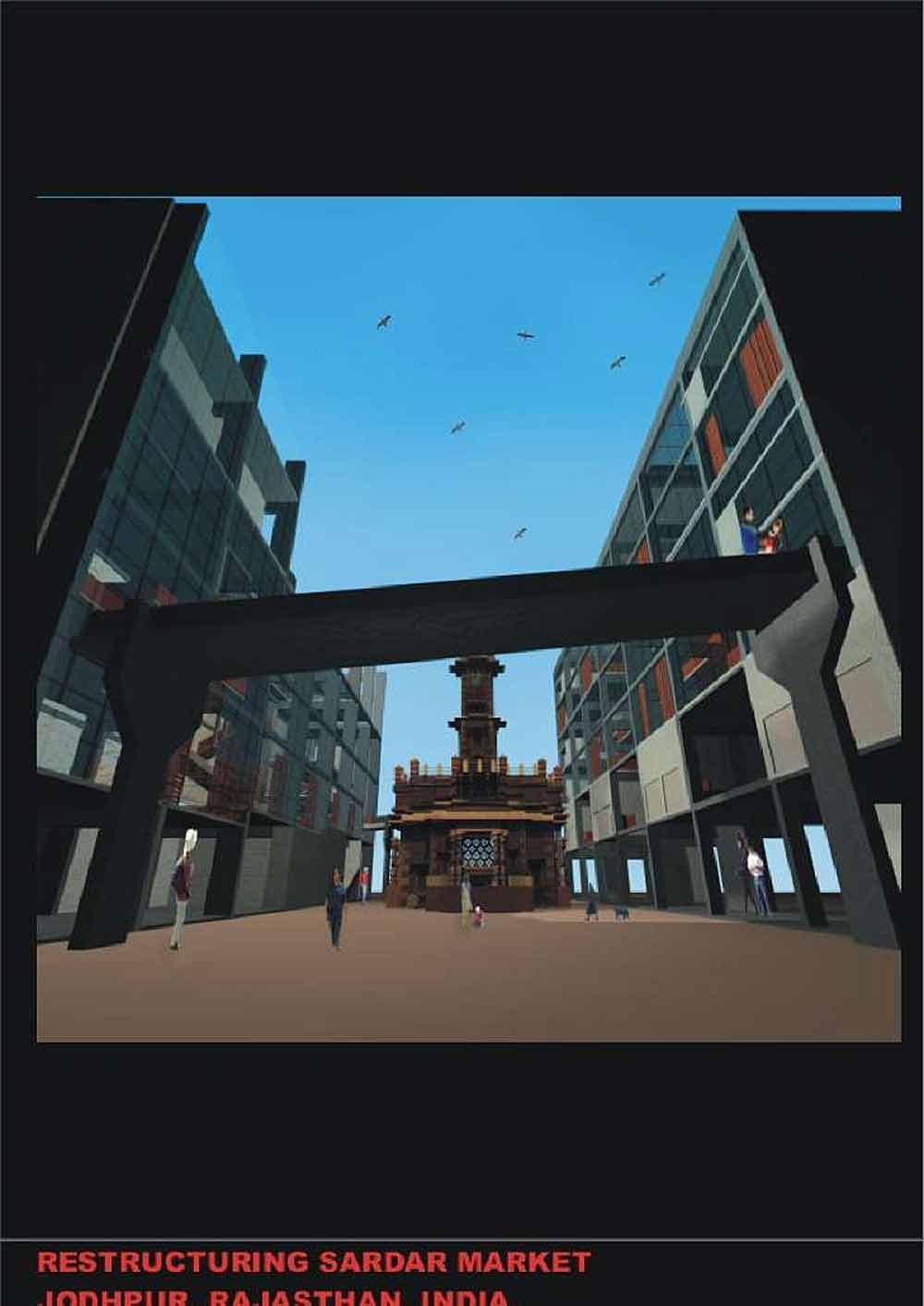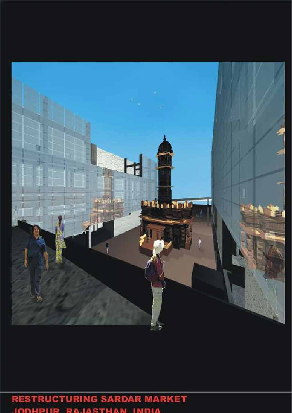 Urban Intervention in Jodhpur, India Part 1 Project 2003 Avni Davda Kamla Raheja Vidyanidhi Institute Mumbai | India PROJECT- URBAN INTERVENTION IN JODHPUR, INDIASTUDENT STATEMENT- MS AVNI DAVDADuring our visit to the market, the imposing structure (Clock Tower) was not even felt, it was almost negligible; while the chaos and motion in market area was more overwhelming. As one experienced the square, their senses went into an overdrive. Vibrant colours of brilliant tactile quality in the form of textiles and handicraft wares. There was a spicy aroma lingering in the air of the market, which was a result of the spices displayed by vendors. One could almost say that the whole of Jodhpur could be summed up in this market. It clearly spoke of the culture and traditions of the place. This market also leads to the fort. The market not only displays trade activities, but also served as a place where information and knowledge were shared. The older people invariably sit around such squares to watch the world pass by. Children play here; festivals like holi etc are celebrated here. The square was a place for everyone to congregate, community-gathering place. This square made by the British was congested (in terms of space) and hustled and bustled with activities, where the Clock Tower failed to make its presence felt. In my intervention I have made an attempt to envelop the Clock Tower, in terms of height and the length (along the axis). At the same time increasing the size of the square, there by letting the activities continue at the lower level; also placing of activities like the performance area on the ground level (square area) will definitely enhance the functioning of the square in the same manner. While at the upper levels it is connected to the Clock Tower.Keeping these in mind the, Clock Tower remains untouched because of the heritage value associated with it. It has now been given a visual function. The focus was to enable the viewers to have a closer view of the Clock Tower whilst engaging in their routine activities. It is taken as central piece of exhibit, in the midst of the entire structure; which in turn acts like a gallery where all the activities take place at different levels. The elements used are Skylights, Glazing and Levels. Skylights and glazing have been used for ventilation while Levels enhance the visual connectivity that the visitors have with the Clock TowerSince the square forms such an integral part, the structure has been raised in a manner that does not interrupt its normal activity as well as continues to serve as a market place. Also provides a shaded area in the already harsh weather. However this (market) now happens vertically around the Clock Tower (programme). The square has been traditionally used as an informal gathering space for children and senior citizens alike.The primary reason people would come to this square is to visit the market. The fort is a significant attraction as well. For this, reason an accentuated vertical axis and a closed horizontal axis (done by adding blocks). The project explores the concept of “an urban mask”. The colonial square accentuated by the centrality of the clock tower sited amidst the pre-dominant “courtyard, street” typology of the surrounding urban fabric of Jodhpur en-route to the historic fort makes interesting reading. The square, housing the clock tower is swallowed by the market activities and events that unfold within its physical, psychological confines. The project “masks” the clock tower on two sides, releasing the visual axis enroute to the fort. This walled insertion allows for a series of vantage points framing the clock tower throughout the almost ritualistic circulatory core of the project. The ground plane is released for the existing market activity to unfold trough-varied timeframes, seasonal as well. The ground allows for a series of existing performances such as puppet shows, festivals, gatherings, traditional folklore, sale of handicrafts etc.At a formal level the dichotomy of solidity and transparency makes interesting reading. The transformation of this three-dimensional mask from a monolithic exterior face, to releasing this solidity of its austerity through a layering of transparency, positions this project an attempt to use tradition as a springboard to dive into the future.--Nuru Karim