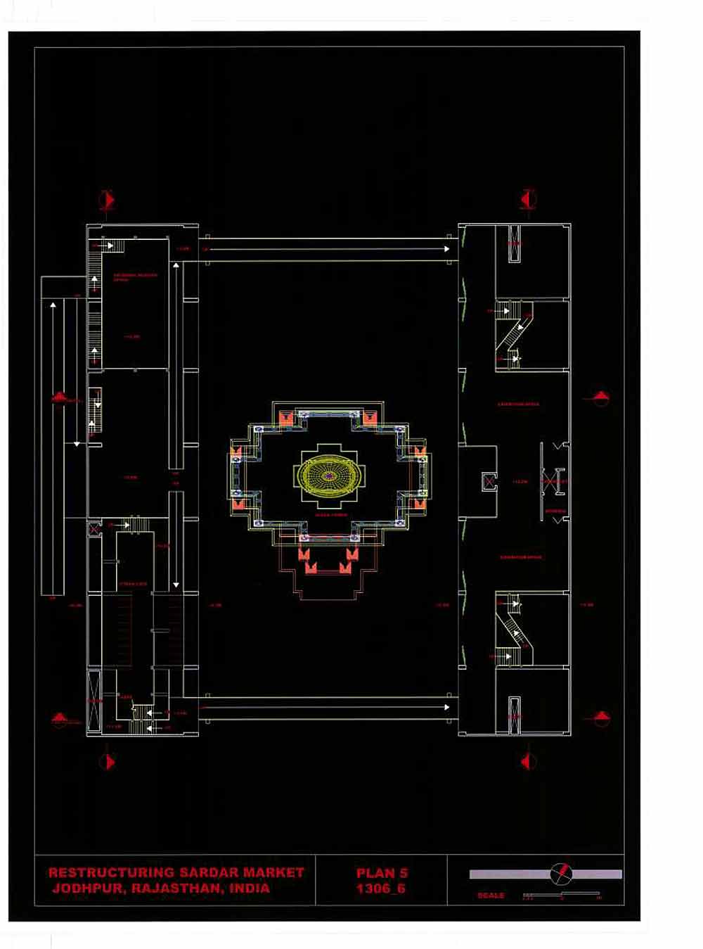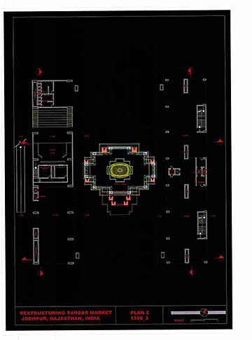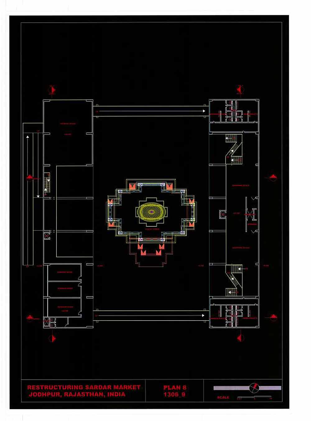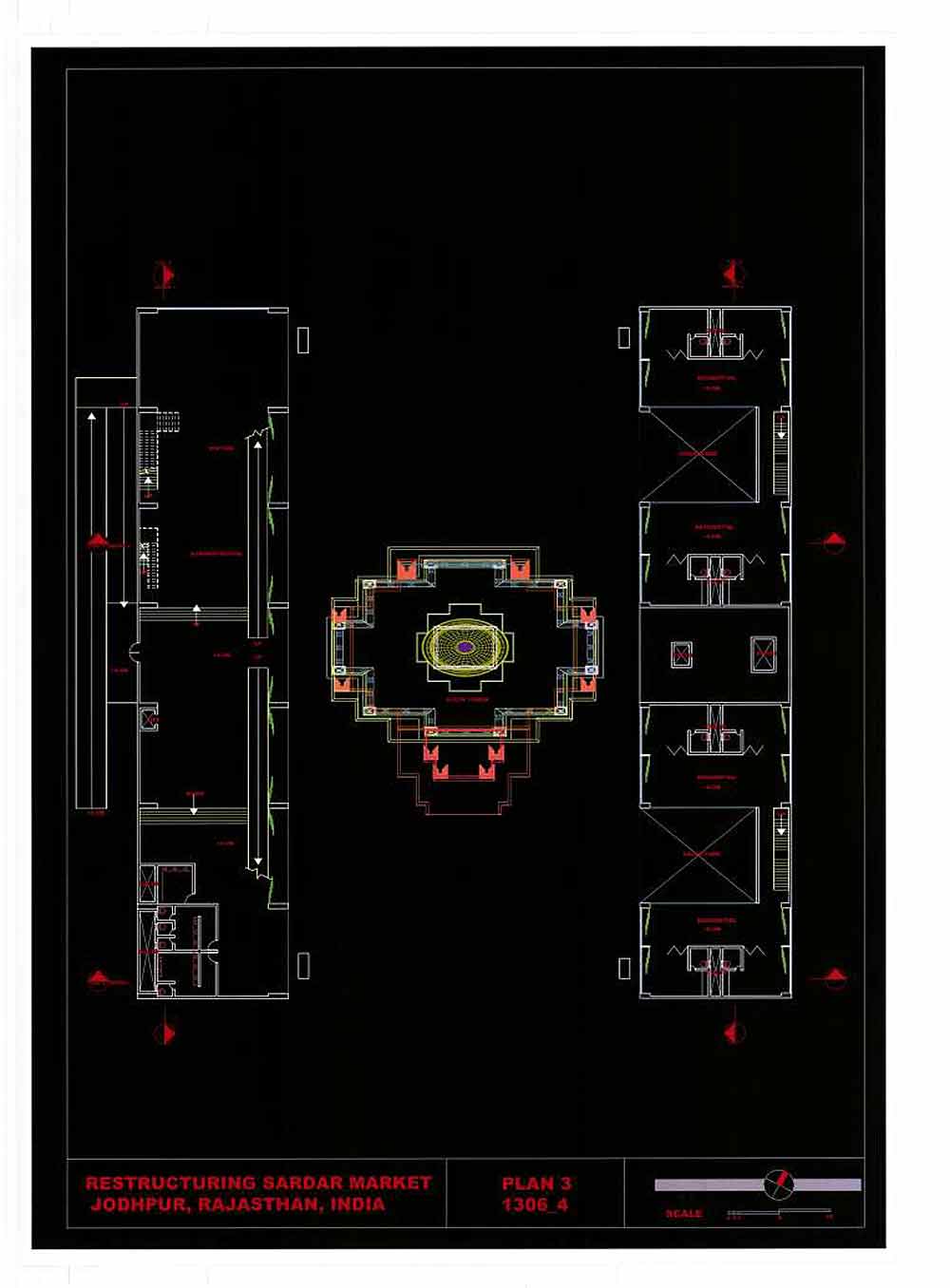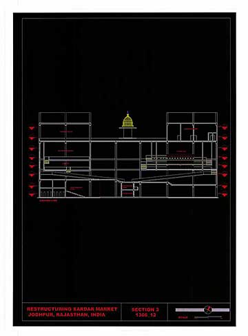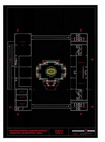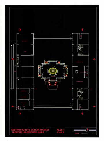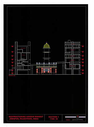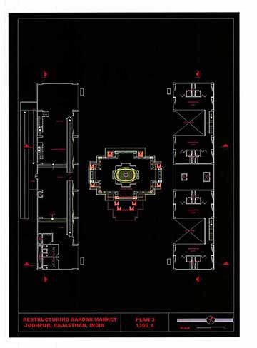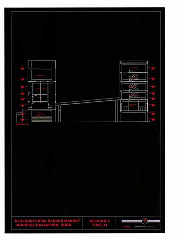 Urban Intervention in Jodhpur, India Part 1 Project 2003 Avni Davda Kamla Raheja Vidyanidhi Institute Mumbai | India PROJECT- URBAN INTERVENTION IN JODHPUR, INDIASTUDENT STATEMENT- MS AVNI DAVDADuring our visit to the market, the imposing structure (Clock Tower) was not even felt, it was almost negligible; while the chaos and motion in market area was more overwhelming. As one experienced the square, their senses went into an overdrive. Vibrant colours of brilliant tactile quality in the form of textiles and handicraft wares. There was a spicy aroma lingering in the air of the market, which was a result of the spices displayed by vendors. One could almost say that the whole of Jodhpur could be summed up in this market. It clearly spoke of the culture and traditions of the place. This market also leads to the fort. The market not only displays trade activities, but also served as a place where information and knowledge were shared. The older people invariably sit around such squares to watch the world pass by. Children play here; festivals like holi etc are celebrated here. The square was a place for everyone to congregate, community-gathering place. This square made by the British was congested (in terms of space) and hustled and bustled with activities, where the Clock Tower failed to make its presence felt. In my intervention I have made an attempt to envelop the Clock Tower, in terms of height and the length (along the axis). At the same time increasing the size of the square, there by letting the activities continue at the lower level; also placing of activities like the performance area on the ground level (square area) will definitely enhance the functioning of the square in the same manner. While at the upper levels it is connected to the Clock Tower.Keeping these in mind the, Clock Tower remains untouched because of the heritage value associated with it. It has now been given a visual function. The focus was to enable the viewers to have a closer view of the Clock Tower whilst engaging in their routine activities. It is taken as central piece of exhibit, in the midst of the entire structure; which in turn acts like a gallery where all the activities take place at different levels. The elements used are Skylights, Glazing and Levels. Skylights and glazing have been used for ventilation while Levels enhance the visual connectivity that the visitors have with the Clock TowerSince the square forms such an integral part, the structure has been raised in a manner that does not interrupt its normal activity as well as continues to serve as a market place. Also provides a shaded area in the already harsh weather. However this (market) now happens vertically around the Clock Tower (programme). The square has been traditionally used as an informal gathering space for children and senior citizens alike.The primary reason people would come to this square is to visit the market. The fort is a significant attraction as well. For this, reason an accentuated vertical axis and a closed horizontal axis (done by adding blocks). The project explores the concept of “an urban mask”. The colonial square accentuated by the centrality of the clock tower sited amidst the pre-dominant “courtyard, street” typology of the surrounding urban fabric of Jodhpur en-route to the historic fort makes interesting reading. The square, housing the clock tower is swallowed by the market activities and events that unfold within its physical, psychological confines. The project “masks” the clock tower on two sides, releasing the visual axis enroute to the fort. This walled insertion allows for a series of vantage points framing the clock tower throughout the almost ritualistic circulatory core of the project. The ground plane is released for the existing market activity to unfold trough-varied timeframes, seasonal as well. The ground allows for a series of existing performances such as puppet shows, festivals, gatherings, traditional folklore, sale of handicrafts etc.At a formal level the dichotomy of solidity and transparency makes interesting reading. The transformation of this three-dimensional mask from a monolithic exterior face, to releasing this solidity of its austerity through a layering of transparency, positions this project an attempt to use tradition as a springboard to dive into the future.--Nuru Karim