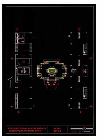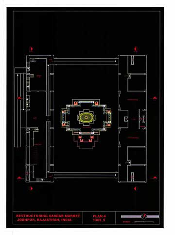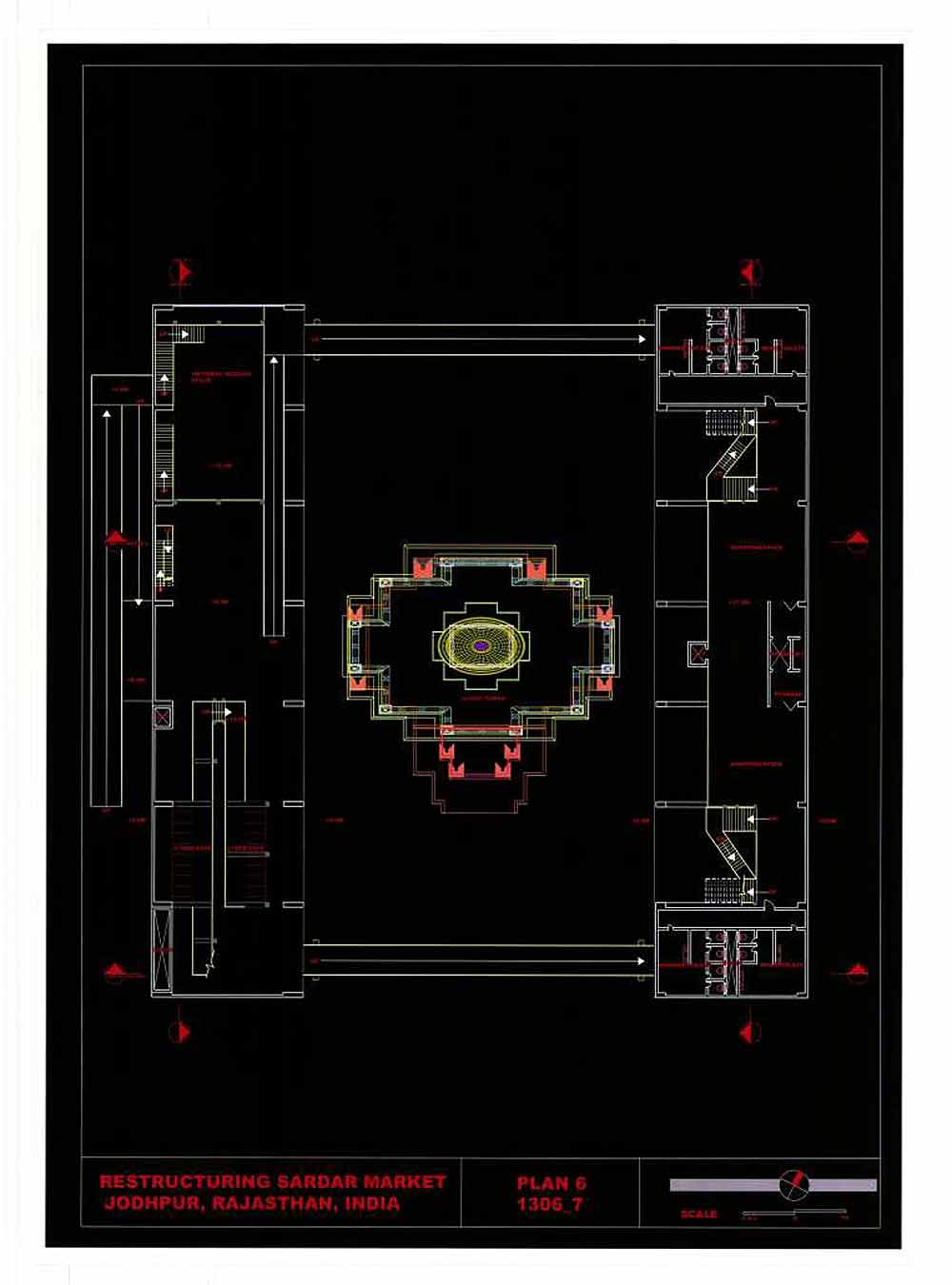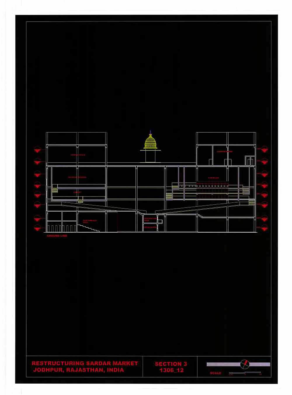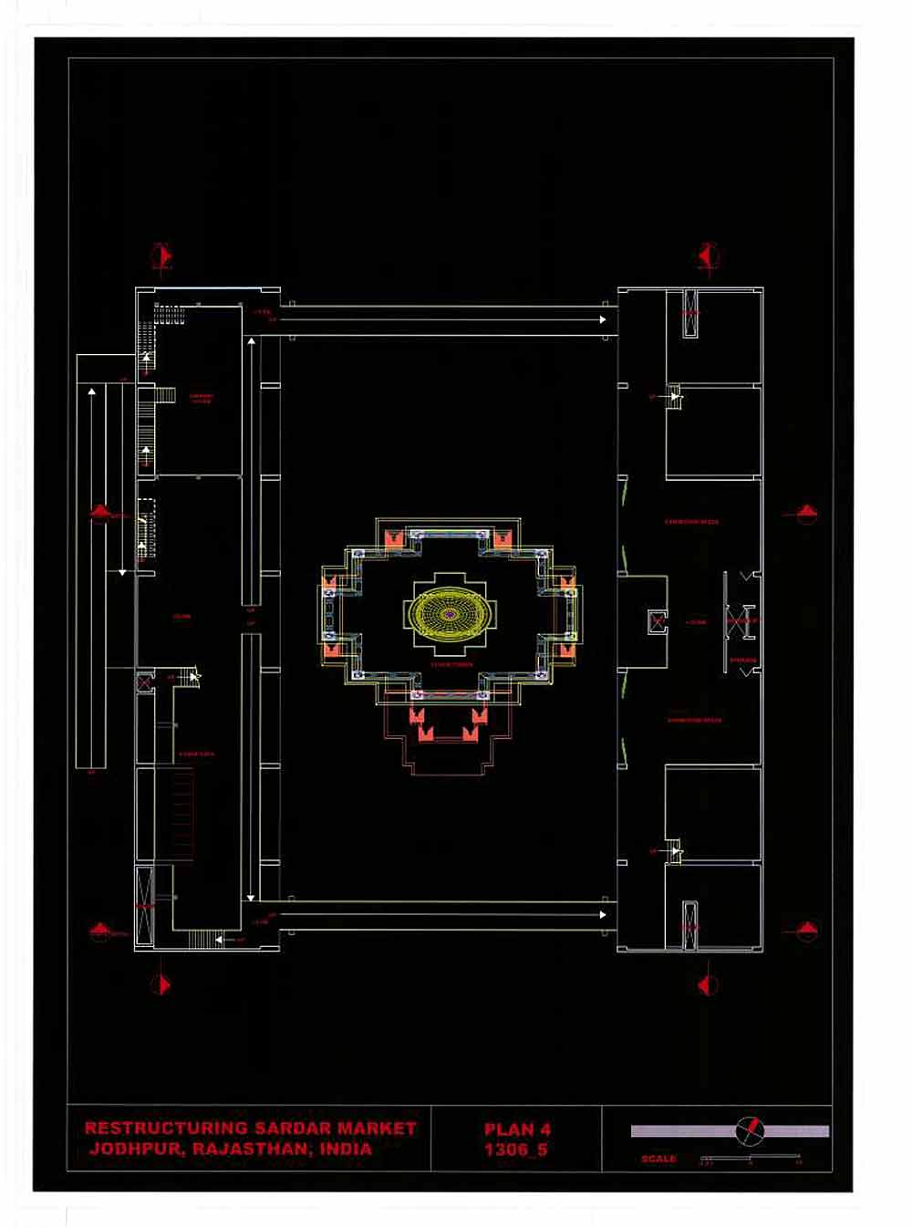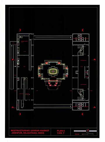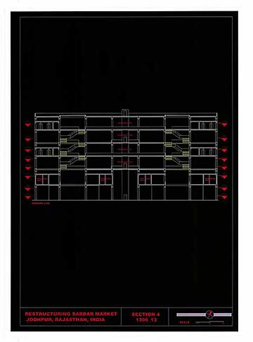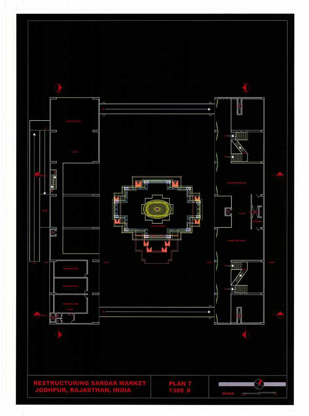 Urban Intervention in Jodhpur, India Part 1 Project 2003 Avni Davda Kamla Raheja Vidyanidhi Institute Mumbai | India PROJECT- URBAN INTERVENTION IN JODHPUR, INDIASTUDENT STATEMENT- MS AVNI DAVDADuring our visit to the market, the imposing structure (Clock Tower) was not even felt, it was almost negligible; while the chaos and motion in market area was more overwhelming. As one experienced the square, their senses went into an overdrive. Vibrant colours of brilliant tactile quality in the form of textiles and handicraft wares. There was a spicy aroma lingering in the air of the market, which was a result of the spices displayed by vendors. One could almost say that the whole of Jodhpur could be summed up in this market. It clearly spoke of the culture and traditions of the place. This market also leads to the fort. The market not only displays trade activities, but also served as a place where information and knowledge were shared. The older people invariably sit around such squares to watch the world pass by. Children play here; festivals like holi etc are celebrated here. The square was a place for everyone to congregate, community-gathering place. This square made by the British was congested (in terms of space) and hustled and bustled with activities, where the Clock Tower failed to make its presence felt. In my intervention I have made an attempt to envelop the Clock Tower, in terms of height and the length (along the axis). At the same time increasing the size of the square, there by letting the activities continue at the lower level; also placing of activities like the performance area on the ground level (square area) will definitely enhance the functioning of the square in the same manner. While at the upper levels it is connected to the Clock Tower.Keeping these in mind the, Clock Tower remains untouched because of the heritage value associated with it. It has now been given a visual function. The focus was to enable the viewers to have a closer view of the Clock Tower whilst engaging in their routine activities. It is taken as central piece of exhibit, in the midst of the entire structure; which in turn acts like a gallery where all the activities take place at different levels. The elements used are Skylights, Glazing and Levels. Skylights and glazing have been used for ventilation while Levels enhance the visual connectivity that the visitors have with the Clock TowerSince the square forms such an integral part, the structure has been raised in a manner that does not interrupt its normal activity as well as continues to serve as a market place. Also provides a shaded area in the already harsh weather. However this (market) now happens vertically around the Clock Tower (programme). The square has been traditionally used as an informal gathering space for children and senior citizens alike.The primary reason people would come to this square is to visit the market. The fort is a significant attraction as well. For this, reason an accentuated vertical axis and a closed horizontal axis (done by adding blocks). The project explores the concept of “an urban mask”. The colonial square accentuated by the centrality of the clock tower sited amidst the pre-dominant “courtyard, street” typology of the surrounding urban fabric of Jodhpur en-route to the historic fort makes interesting reading. The square, housing the clock tower is swallowed by the market activities and events that unfold within its physical, psychological confines. The project “masks” the clock tower on two sides, releasing the visual axis enroute to the fort. This walled insertion allows for a series of vantage points framing the clock tower throughout the almost ritualistic circulatory core of the project. The ground plane is released for the existing market activity to unfold trough-varied timeframes, seasonal as well. The ground allows for a series of existing performances such as puppet shows, festivals, gatherings, traditional folklore, sale of handicrafts etc.At a formal level the dichotomy of solidity and transparency makes interesting reading. The transformation of this three-dimensional mask from a monolithic exterior face, to releasing this solidity of its austerity through a layering of transparency, positions this project an attempt to use tradition as a springboard to dive into the future.--Nuru Karim