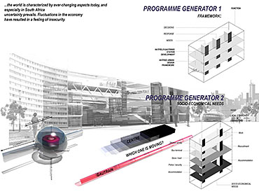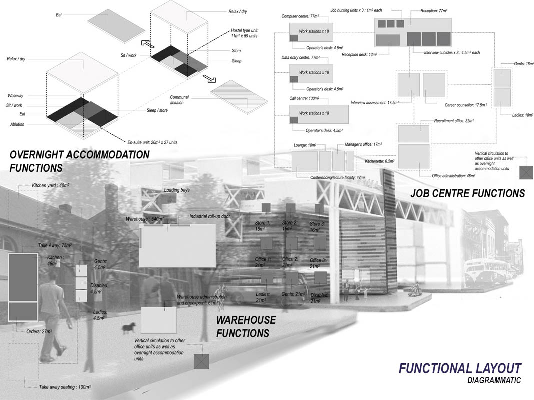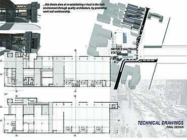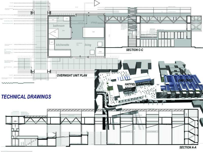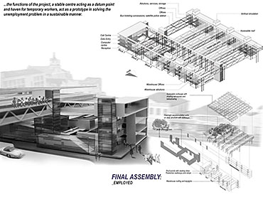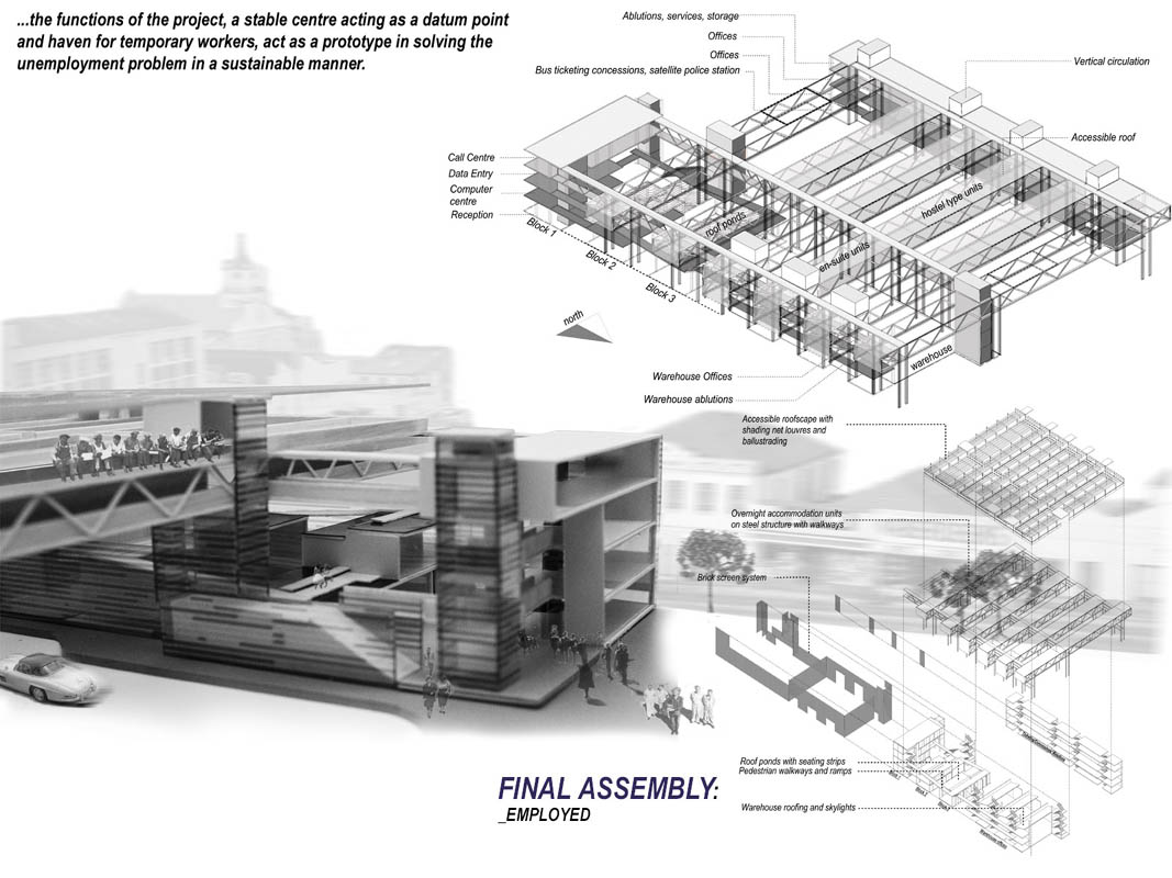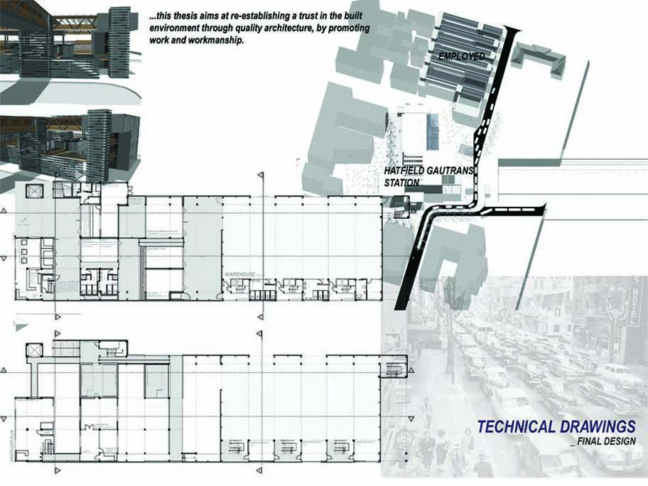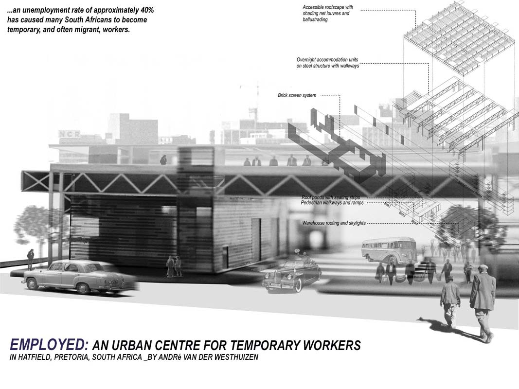 EMPLOYED: An Urban Centre for Temporary Workers Part 2 Project 2004 André van der Westhuizen University of Pretoria | South Africa An unemployment rate of approximately 40% has forced many South Africans to become temporary, and often migrant, workers. Uncertainty, caused by a fluctuating economy, reflects in the built environment, which have become "temporary", displaying a lack of workmanship. This project is a result of intensive planning on the site, in collaboration with the proposed Hatfield Gautrans Station. The functions of the project, a stable centre acting as a datum point and haven for temporary workers, resulted out of this planning process. This thesis aims at re-establishing a trust in the built environment through quality architecture, by promoting work and workmanship. The design is based on a rigorous investigation of the issues informing the design process. It addresses aspects reflecting local conditions and universal concerns. It effectively defines the guiding themes of work and labour and the relationship between production and fabrication contextualized within a society where job creation is paramount. This is successfully translated into design principles resulting in a product of architecture reflecting both necessity and artifice. The merit of the work resides in the author’s ability to manipulate and apply the theoretical concerns in the design process from the conceptual phase to the meticulous resolution of tectonic detail.