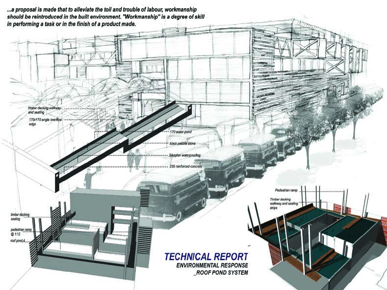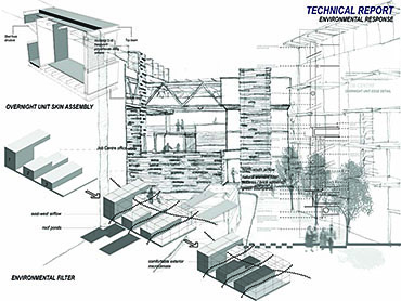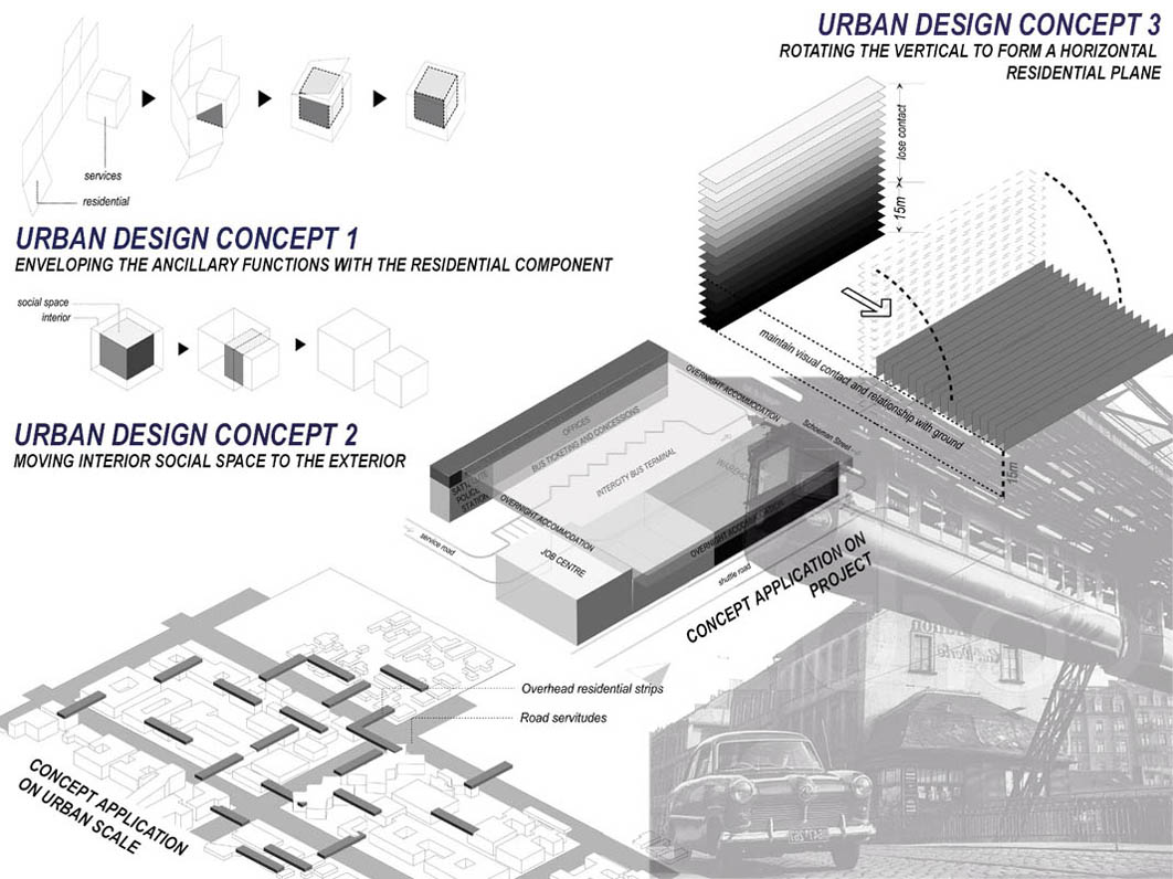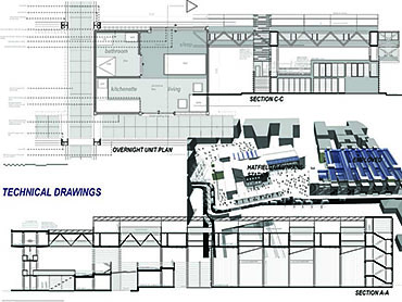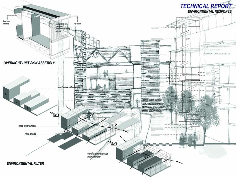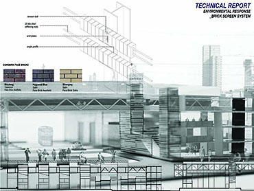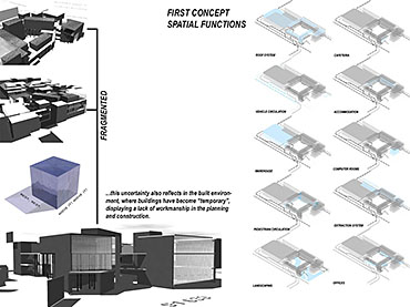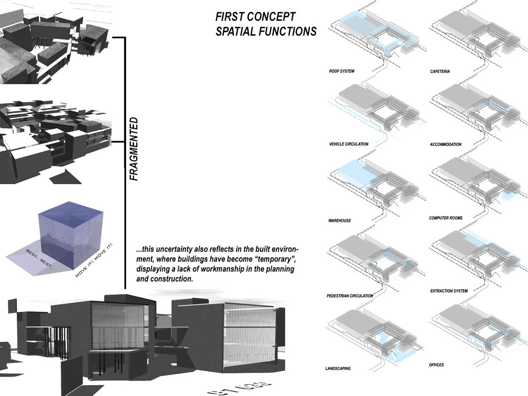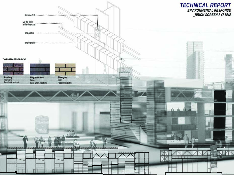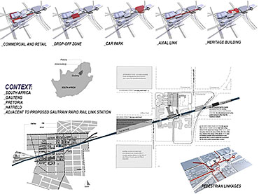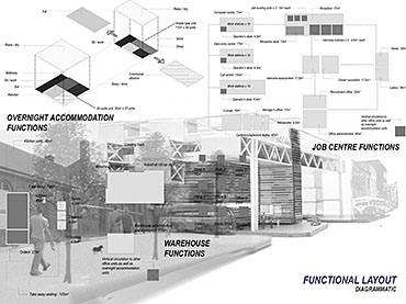 EMPLOYED: An Urban Centre for Temporary Workers Part 2 Project 2004 André van der Westhuizen University of Pretoria | South Africa An unemployment rate of approximately 40% has forced many South Africans to become temporary, and often migrant, workers. Uncertainty, caused by a fluctuating economy, reflects in the built environment, which have become "temporary", displaying a lack of workmanship. This project is a result of intensive planning on the site, in collaboration with the proposed Hatfield Gautrans Station. The functions of the project, a stable centre acting as a datum point and haven for temporary workers, resulted out of this planning process. This thesis aims at re-establishing a trust in the built environment through quality architecture, by promoting work and workmanship. The design is based on a rigorous investigation of the issues informing the design process. It addresses aspects reflecting local conditions and universal concerns. It effectively defines the guiding themes of work and labour and the relationship between production and fabrication contextualized within a society where job creation is paramount. This is successfully translated into design principles resulting in a product of architecture reflecting both necessity and artifice. The merit of the work resides in the author’s ability to manipulate and apply the theoretical concerns in the design process from the conceptual phase to the meticulous resolution of tectonic detail.