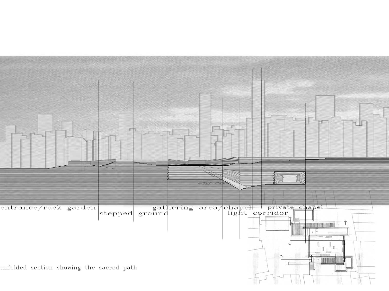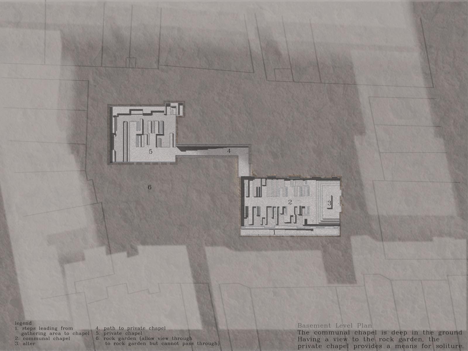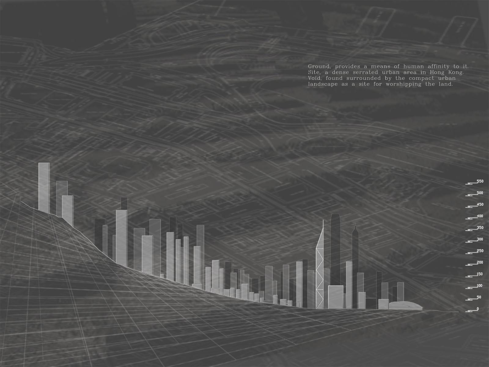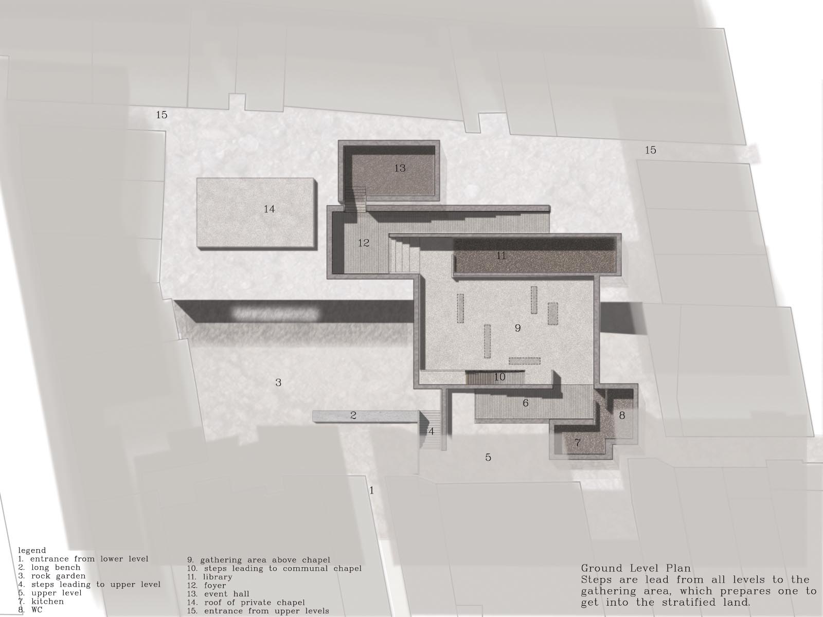 Worship: The Stratified Land Part 1 Project 2004 Anna T K Chow Chinese University of Hong Kong | China The hilly landscape icon on the Hong Kong Island provides a means of human affinity to the ground. The serrated ground introduces space for human activities while the neighbourhood stores bring in their own serrated form that harmonizes with the natural landscape, thus the definition of the ground becomes ambiguous and patchy. The project was triggered by the basis of the stepped ground. The void area surrounded by compact urban landscape climbing uphill make it an ideal setting for celebrating the ground. The stratified ground is celebrated as terraced landscape, where the earth will be experienced through movement along the sacred path to reach for the womb of the ground. The sacredness of the womb is through the act of getting into the ground and to be part of it. The scheme looked at the complexity in building a Chapel which can inhabit 150 people within an high density urban site. The strategy focused on embracing the complexity of the site conditions, the constraint of natural light, density and diagonal topography. The project's sensitivity in articulating the ground as a palimpsest, dealing with the traces of the existing similarly to an archaeological site. What is achieved is a Chapel connected by a series of pathways weaving through a sequence of carved layered sunken spaces, with the Chapel being the most sacred and deepest. As a flip from large to small details, the vertical organization of spaces is reflected in the vertical surfaces through the use of stone layered vertically to simulate strata. The student achieved a poetic and sensitive design, in contrasting the difficulties faced in such a complex site.