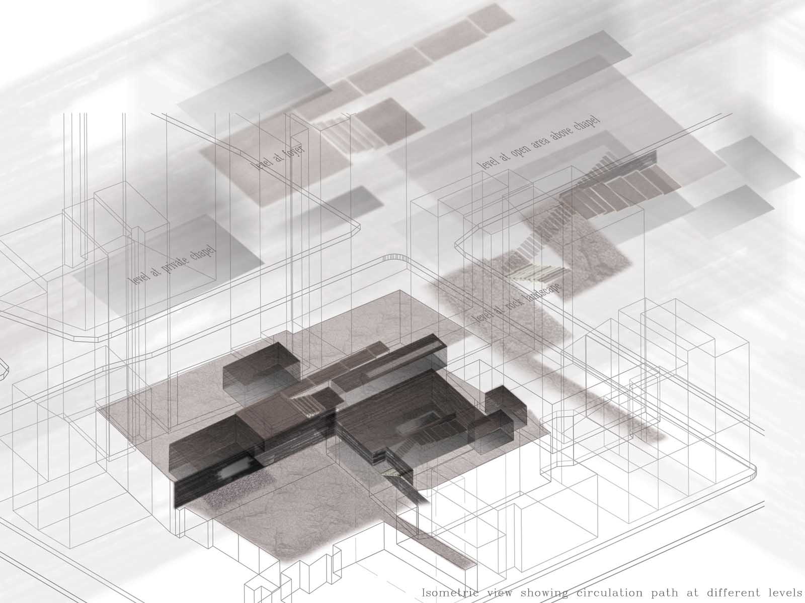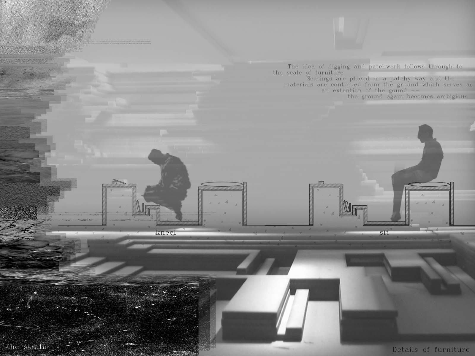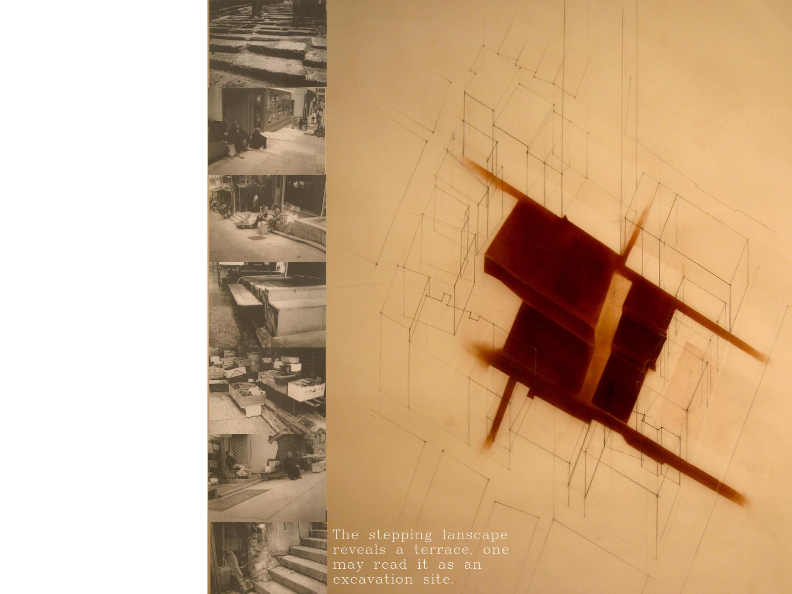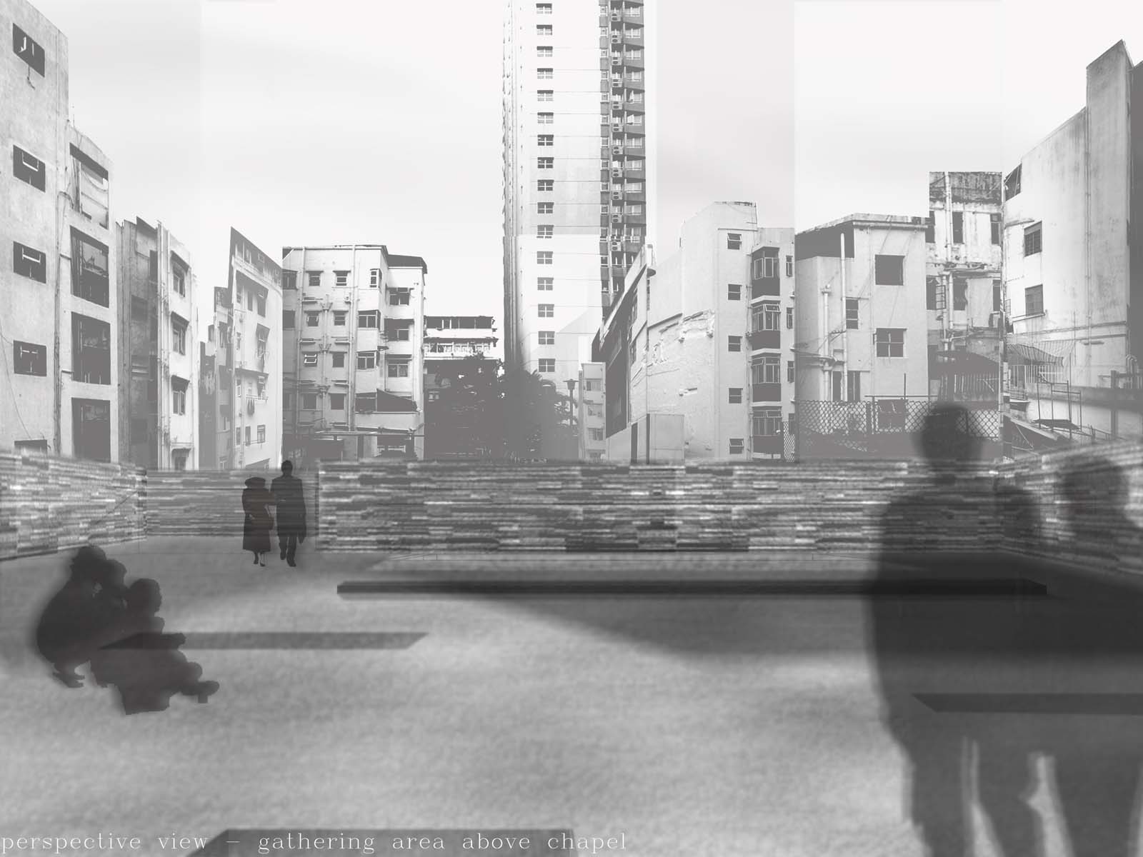 Worship: The Stratified Land Part 1 Project 2004 Anna T K Chow Chinese University of Hong Kong | China The hilly landscape icon on the Hong Kong Island provides a means of human affinity to the ground. The serrated ground introduces space for human activities while the neighbourhood stores bring in their own serrated form that harmonizes with the natural landscape, thus the definition of the ground becomes ambiguous and patchy. The project was triggered by the basis of the stepped ground. The void area surrounded by compact urban landscape climbing uphill make it an ideal setting for celebrating the ground. The stratified ground is celebrated as terraced landscape, where the earth will be experienced through movement along the sacred path to reach for the womb of the ground. The sacredness of the womb is through the act of getting into the ground and to be part of it. The scheme looked at the complexity in building a Chapel which can inhabit 150 people within an high density urban site. The strategy focused on embracing the complexity of the site conditions, the constraint of natural light, density and diagonal topography. The project's sensitivity in articulating the ground as a palimpsest, dealing with the traces of the existing similarly to an archaeological site. What is achieved is a Chapel connected by a series of pathways weaving through a sequence of carved layered sunken spaces, with the Chapel being the most sacred and deepest. As a flip from large to small details, the vertical organization of spaces is reflected in the vertical surfaces through the use of stone layered vertically to simulate strata. The student achieved a poetic and sensitive design, in contrasting the difficulties faced in such a complex site.