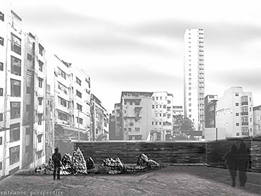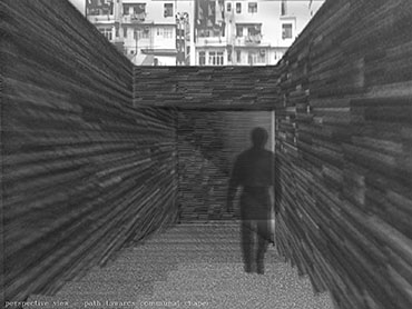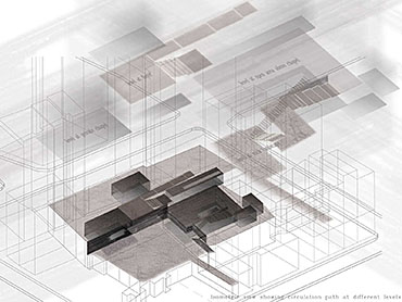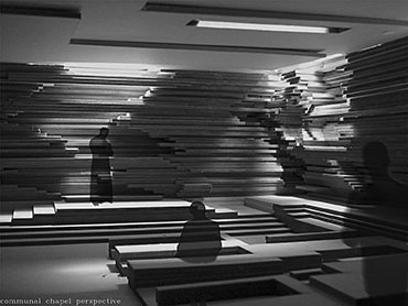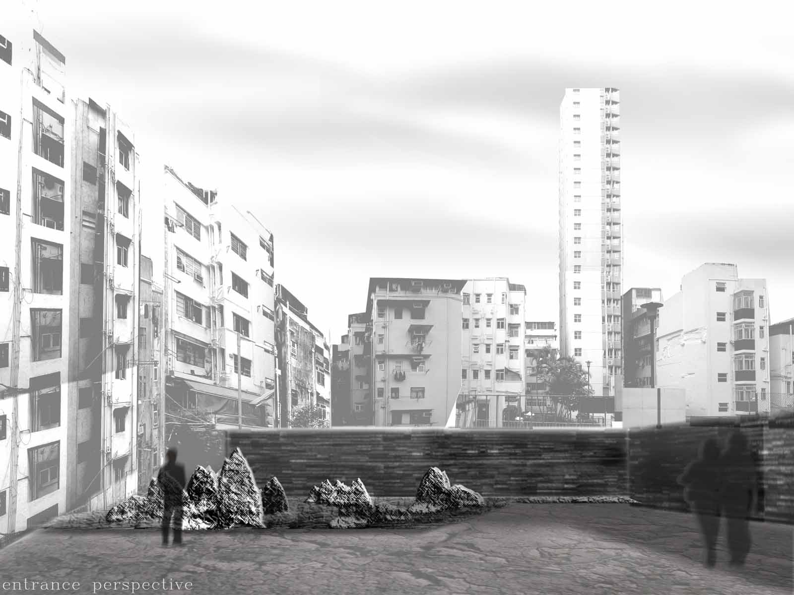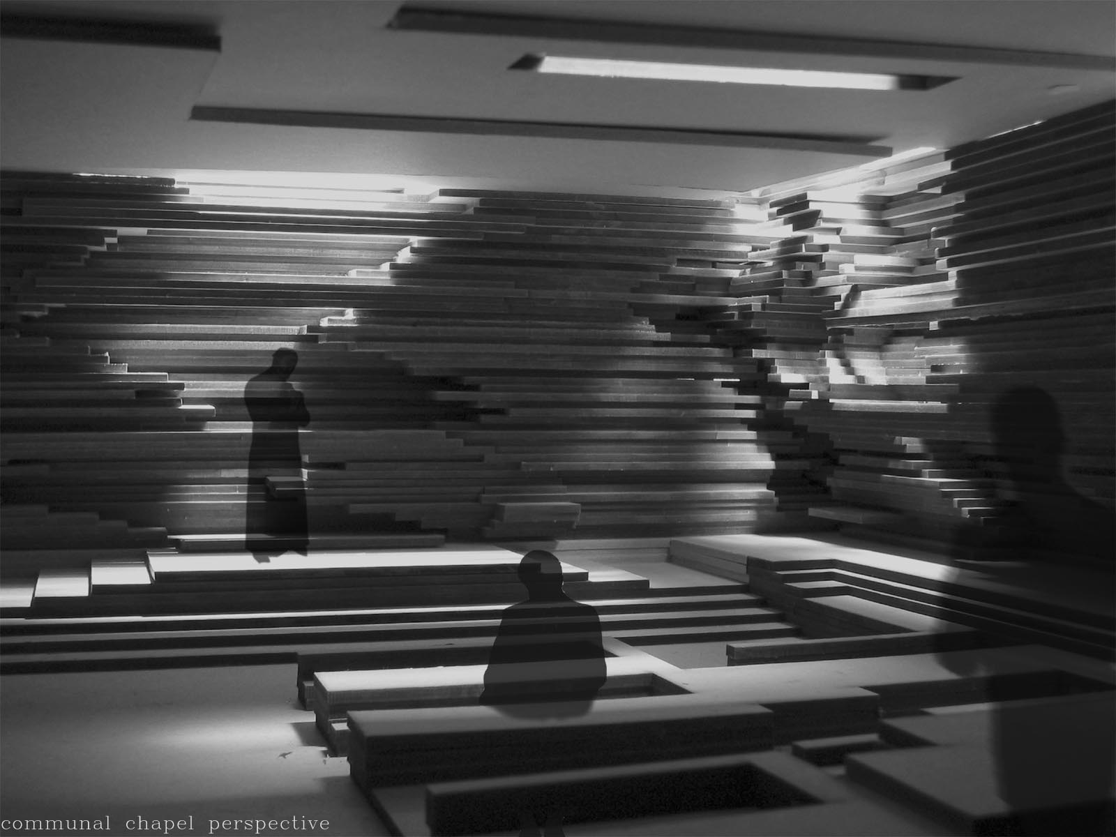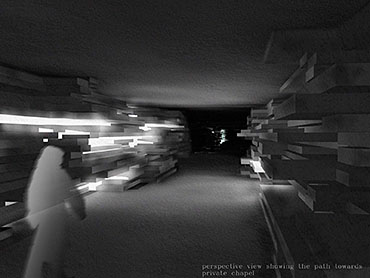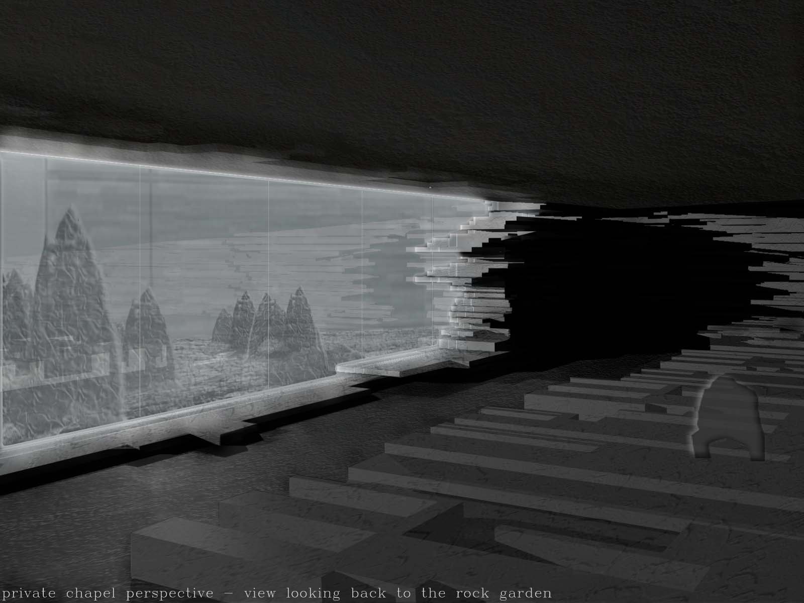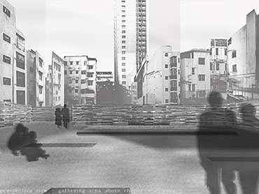 Worship: The Stratified Land Part 1 Project 2004 Anna T K Chow Chinese University of Hong Kong | China The hilly landscape icon on the Hong Kong Island provides a means of human affinity to the ground. The serrated ground introduces space for human activities while the neighbourhood stores bring in their own serrated form that harmonizes with the natural landscape, thus the definition of the ground becomes ambiguous and patchy. The project was triggered by the basis of the stepped ground. The void area surrounded by compact urban landscape climbing uphill make it an ideal setting for celebrating the ground. The stratified ground is celebrated as terraced landscape, where the earth will be experienced through movement along the sacred path to reach for the womb of the ground. The sacredness of the womb is through the act of getting into the ground and to be part of it. The scheme looked at the complexity in building a Chapel which can inhabit 150 people within an high density urban site. The strategy focused on embracing the complexity of the site conditions, the constraint of natural light, density and diagonal topography. The project's sensitivity in articulating the ground as a palimpsest, dealing with the traces of the existing similarly to an archaeological site. What is achieved is a Chapel connected by a series of pathways weaving through a sequence of carved layered sunken spaces, with the Chapel being the most sacred and deepest. As a flip from large to small details, the vertical organization of spaces is reflected in the vertical surfaces through the use of stone layered vertically to simulate strata. The student achieved a poetic and sensitive design, in contrasting the difficulties faced in such a complex site.