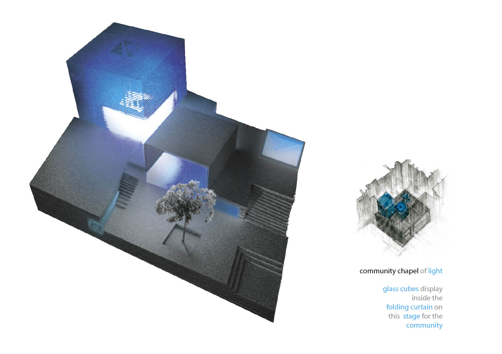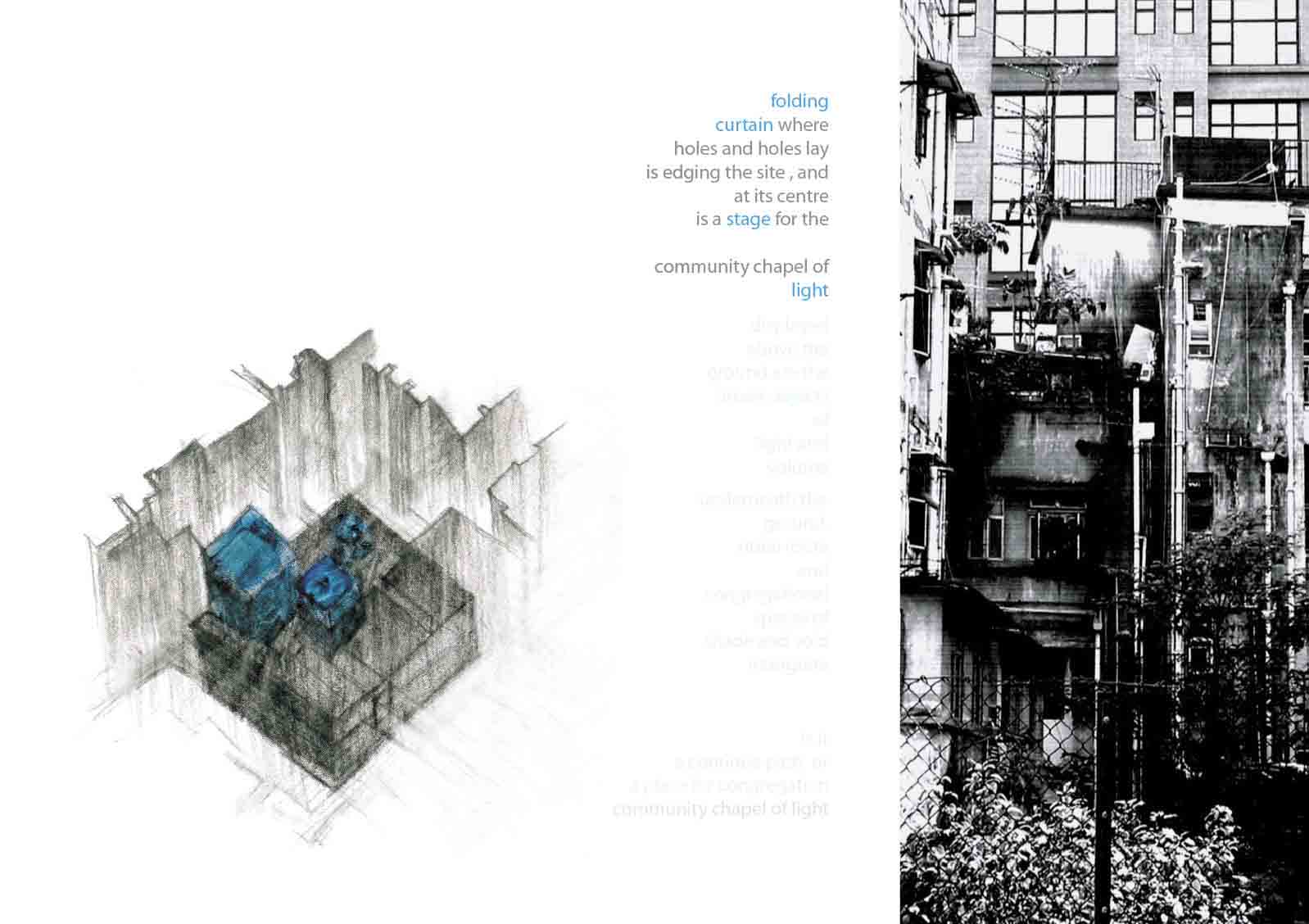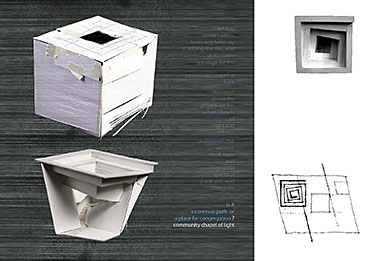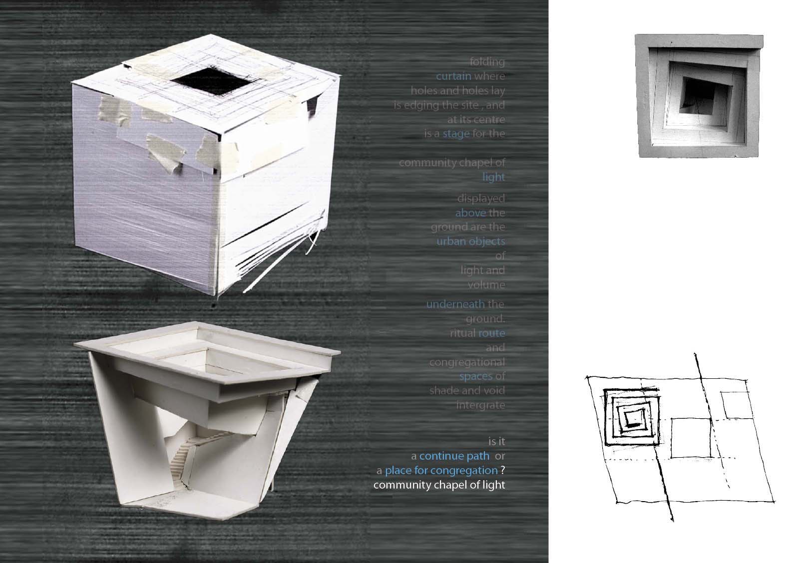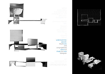 Community Chapel of Light Part 1 Project 2004 Hei-wai Cheung Chinese University of Hong Kong | China The experience of oscillating between the tangible and intangible is transcendental. Inspired by the art works of Mark Rothko and James Turrell, the oscillation of perceiving light as between tangible substance and sensation experience becomes the basic concept of this community chapel.Situated in an urban setting, a trapezoidal terrace site enclosed by walls of 6 to 7 stories blocks sets a clear stage for a display of urban objects. Above the ground the community chapel appeals as three light emitting boxes in pure geometry which either floats above, sits on, or sinks in the stage; underneath the ground the three boxes are entangled and interconnected. The main entrance is a descending tunnel into the underground event hall which is only glown up by the reflectant of the spiral ramps and seats of the chapel above it. Ascending the spiral ramps, one comes into and baths in the light-filled chapel which is the inside of the floating light box and, thus, complete the transcendental experience. Hei Wai’s project is about a place of worship. Her design revolves around path and volume, light and shade, trying to integrate the potential ritual route with the congregational spaces. Despite the tight urban site, Hei Wai manages to insert three delightful pavilions in an undulating landscape. One of these prominent pavilions is the central focus of worship which is essentially a glass cube containing a continuous path that also serves as seating for the congregation. The altar is suspended in the middle of the volume. The successful features in this scheme are the simplicity of the form and the clever manipulation of light and shade. The sense of the sacred is neatly integrated with the spirit of the community of the worshippers resulting in a holistic structure that is functional and inspiring.