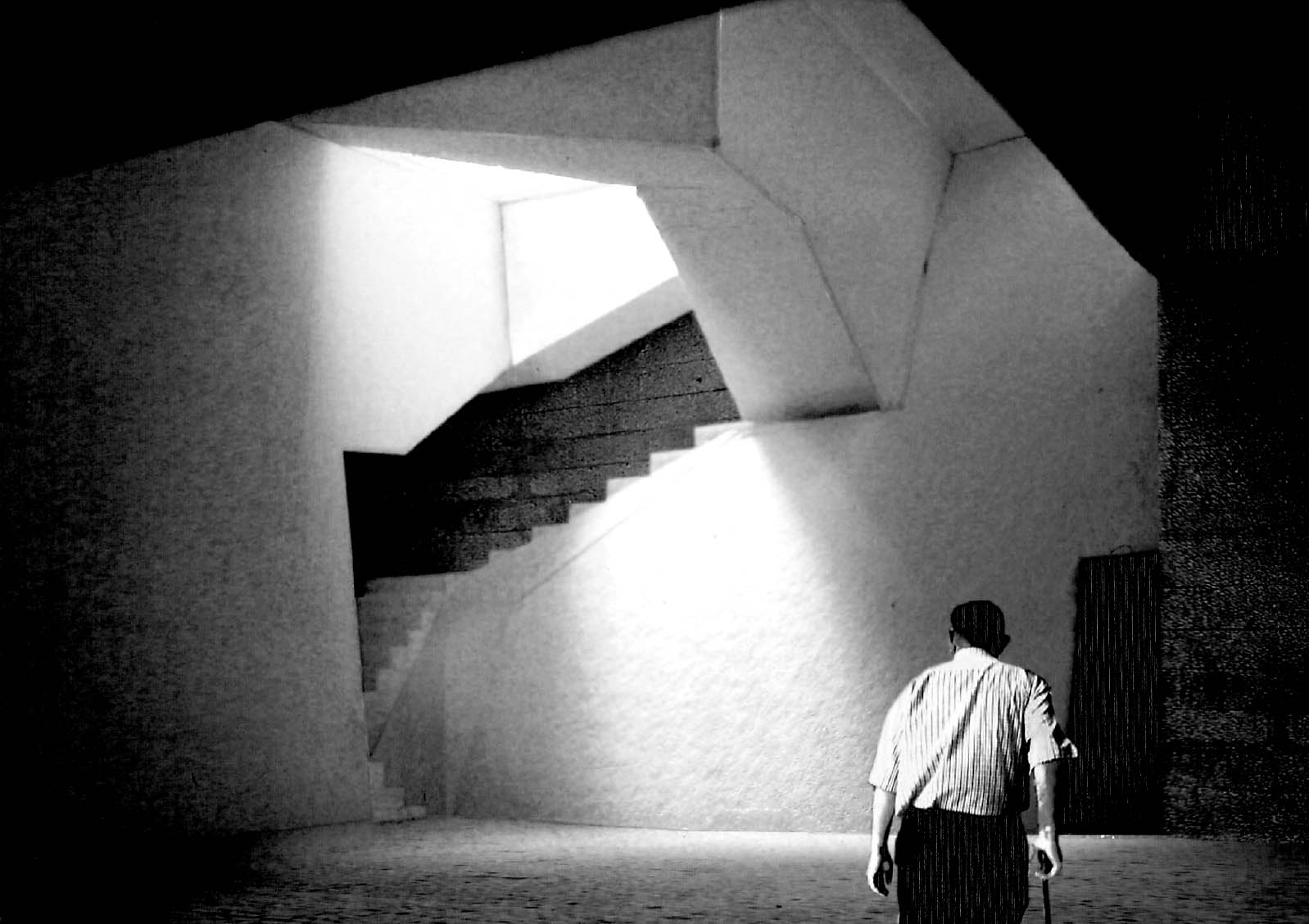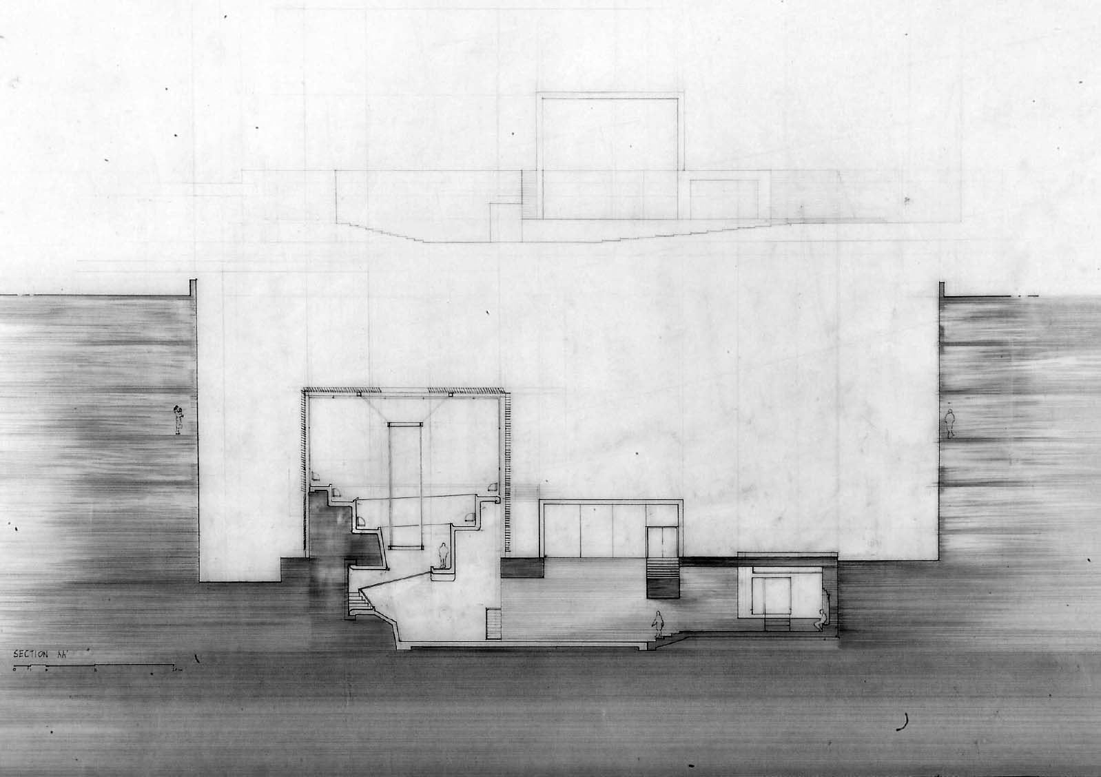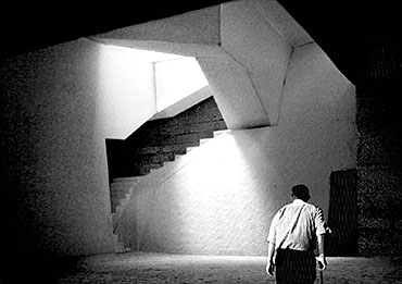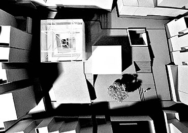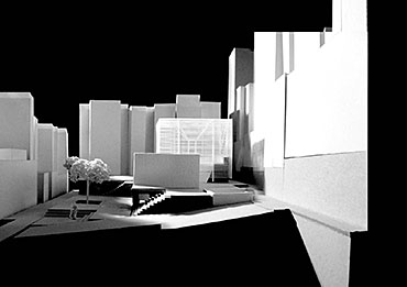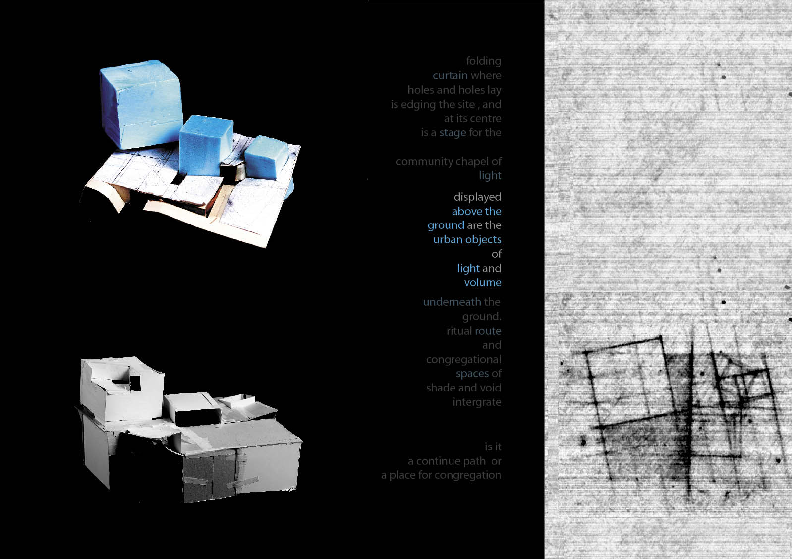 Community Chapel of Light Part 1 Project 2004 Hei-wai Cheung Chinese University of Hong Kong | China The experience of oscillating between the tangible and intangible is transcendental. Inspired by the art works of Mark Rothko and James Turrell, the oscillation of perceiving light as between tangible substance and sensation experience becomes the basic concept of this community chapel.Situated in an urban setting, a trapezoidal terrace site enclosed by walls of 6 to 7 stories blocks sets a clear stage for a display of urban objects. Above the ground the community chapel appeals as three light emitting boxes in pure geometry which either floats above, sits on, or sinks in the stage; underneath the ground the three boxes are entangled and interconnected. The main entrance is a descending tunnel into the underground event hall which is only glown up by the reflectant of the spiral ramps and seats of the chapel above it. Ascending the spiral ramps, one comes into and baths in the light-filled chapel which is the inside of the floating light box and, thus, complete the transcendental experience. Hei Wai’s project is about a place of worship. Her design revolves around path and volume, light and shade, trying to integrate the potential ritual route with the congregational spaces. Despite the tight urban site, Hei Wai manages to insert three delightful pavilions in an undulating landscape. One of these prominent pavilions is the central focus of worship which is essentially a glass cube containing a continuous path that also serves as seating for the congregation. The altar is suspended in the middle of the volume. The successful features in this scheme are the simplicity of the form and the clever manipulation of light and shade. The sense of the sacred is neatly integrated with the spirit of the community of the worshippers resulting in a holistic structure that is functional and inspiring.