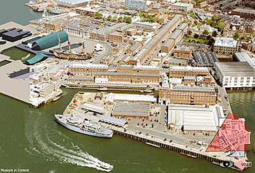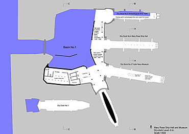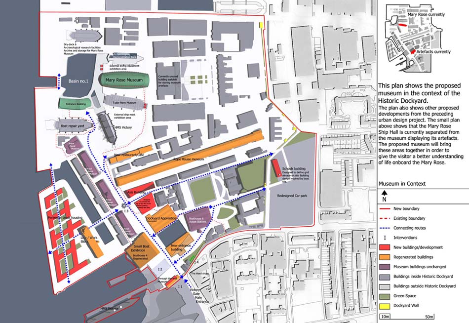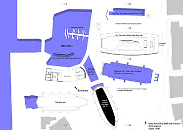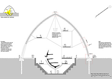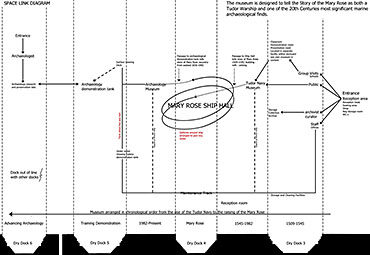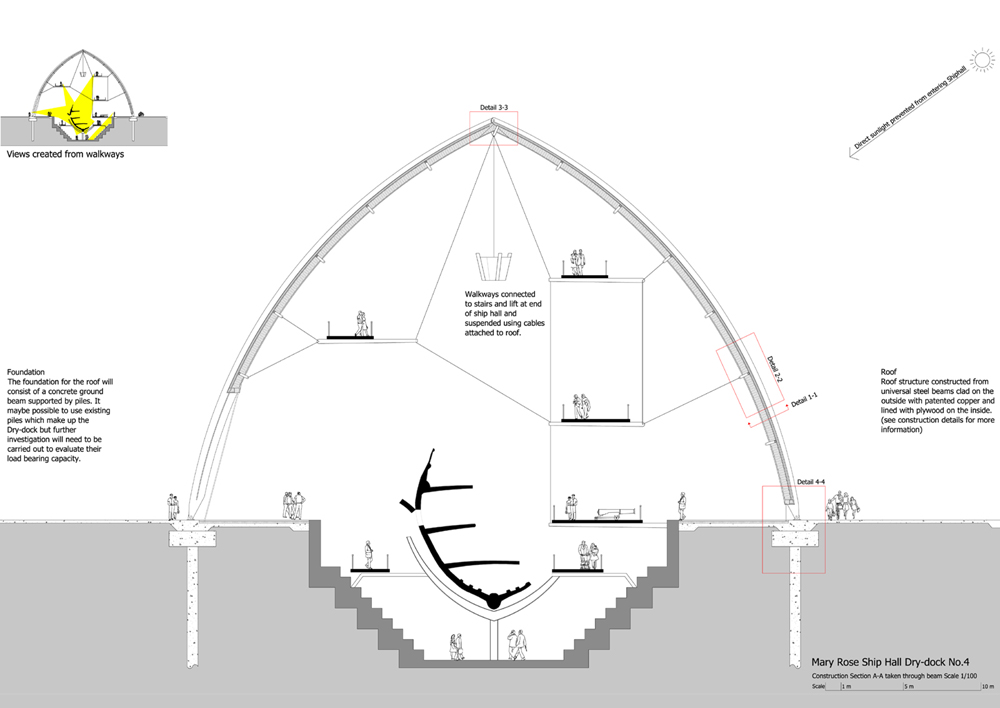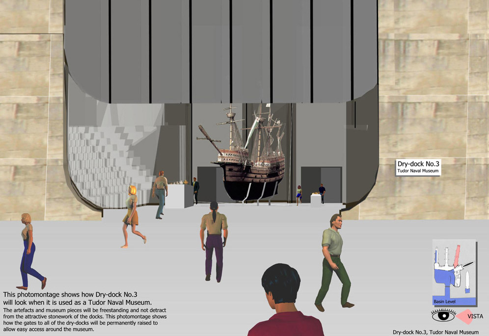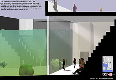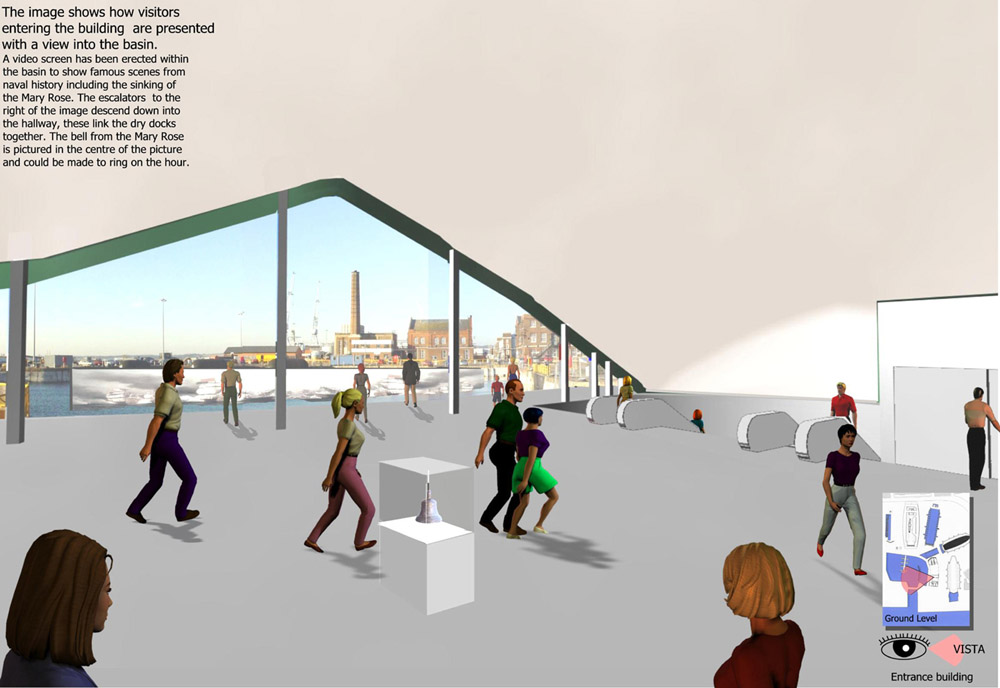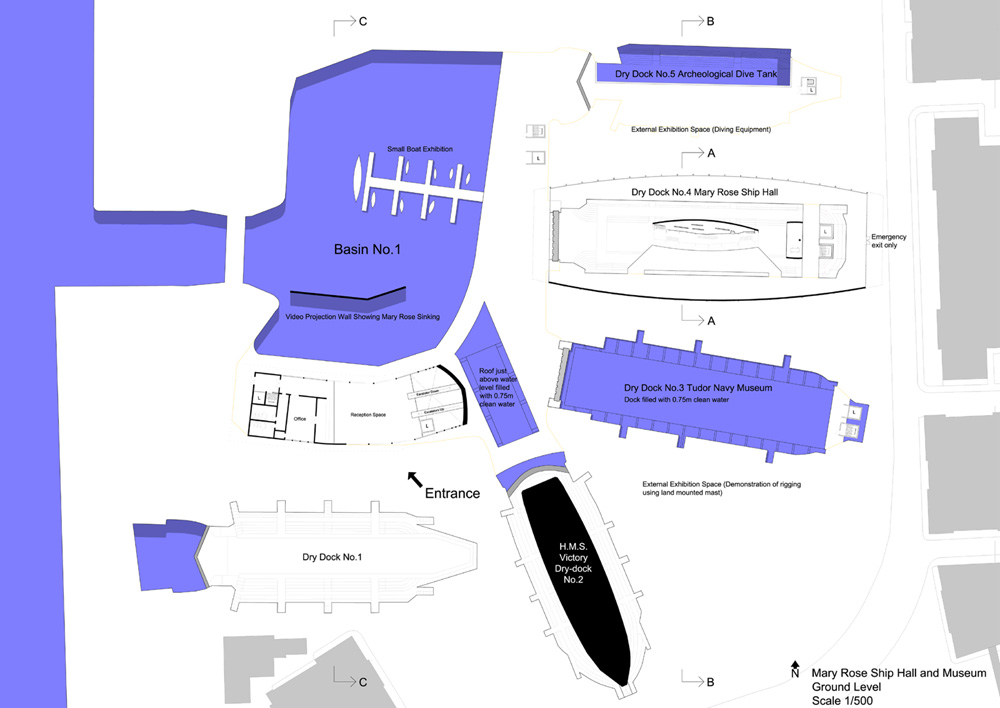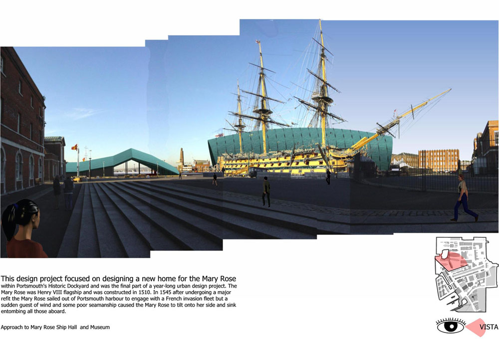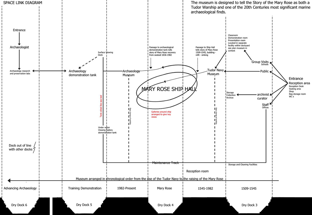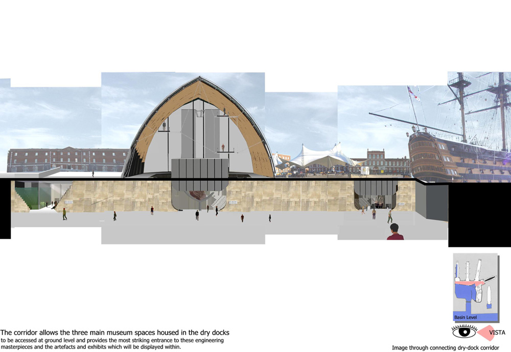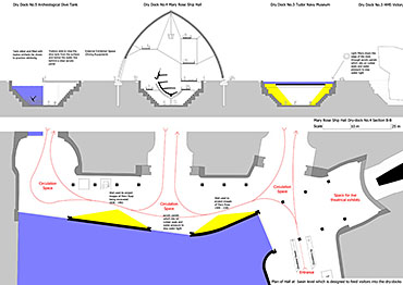 Mary Rose Museum Part 1 Project 2004 Matthew Hynam University of the West of England | UK The design aims to reinvent the Great Basin in Portsmouth’s Historic Dockyard the home of HMS Victory and to create a new setting for the recovered Tudor warship Mary Rose. An urban design strategy to regenerate the historic fabric of the dockyard (which includes the oldest group of docks in world) was established early in the year. My proposal is a series of interventions within thedry-docks themselves and in new subterranean passageways between them. The building only rises above the ground at the entrance and in the Ship Hall housing the carefully preserved hull of the Mary Rose. The final year studio of UWE’s Part One course combines urban design and the detailed design of a building in context. Two sites were offered – the historic dockyard in Portsmouth and the centre of Taunton, the emerging capital of England’s south-west region.Matt Hynam’s design for a new home for the Mary Rose is based on his insight that the dock installations, as much as the ships, are central to the city’s unique military heritage. Visitors experience the quality and power of the dock engineering close up – as well as the evocative remains of the rescued warship.