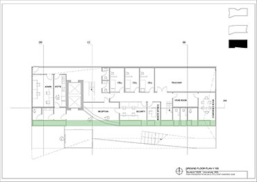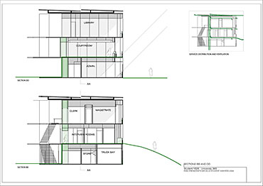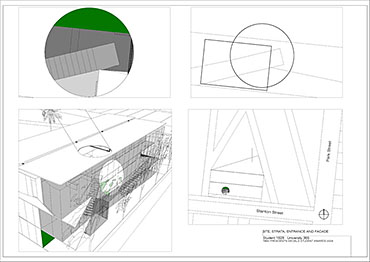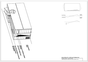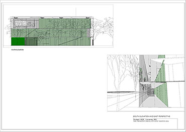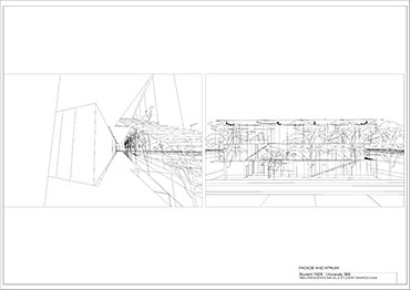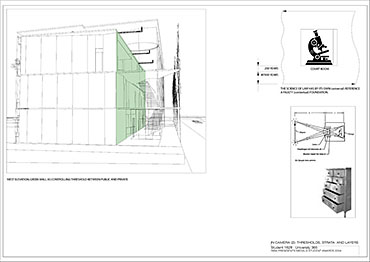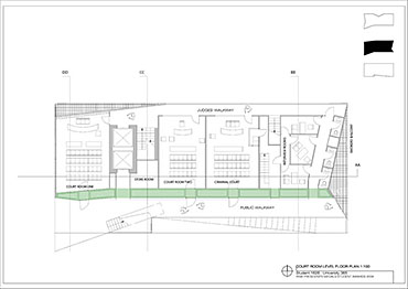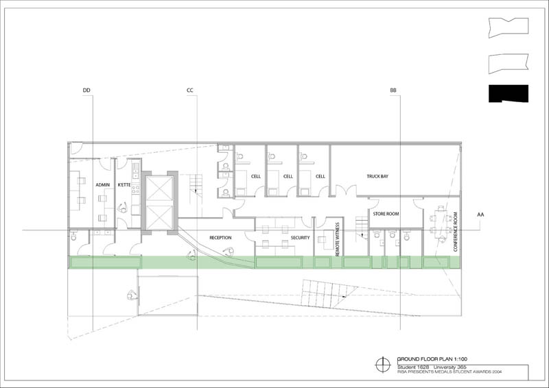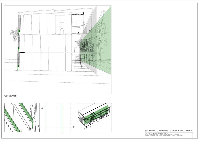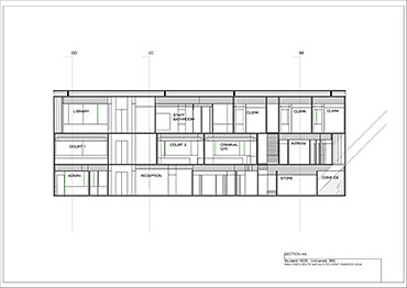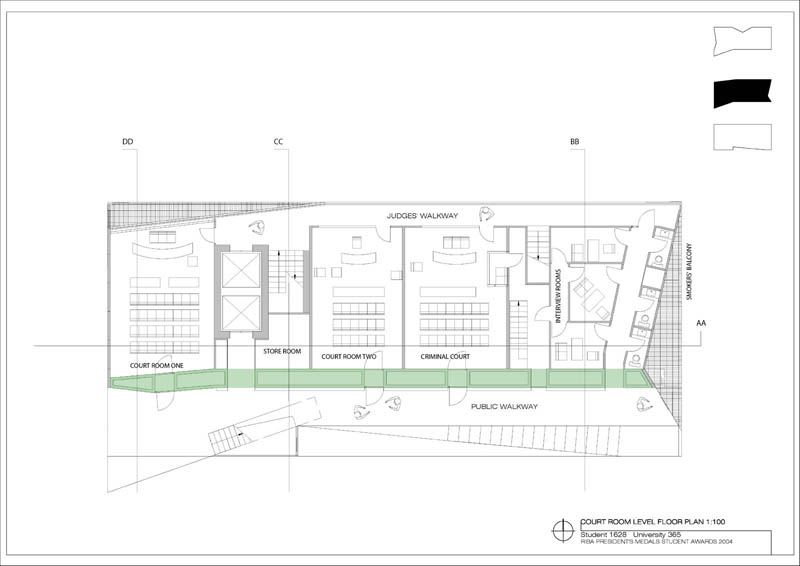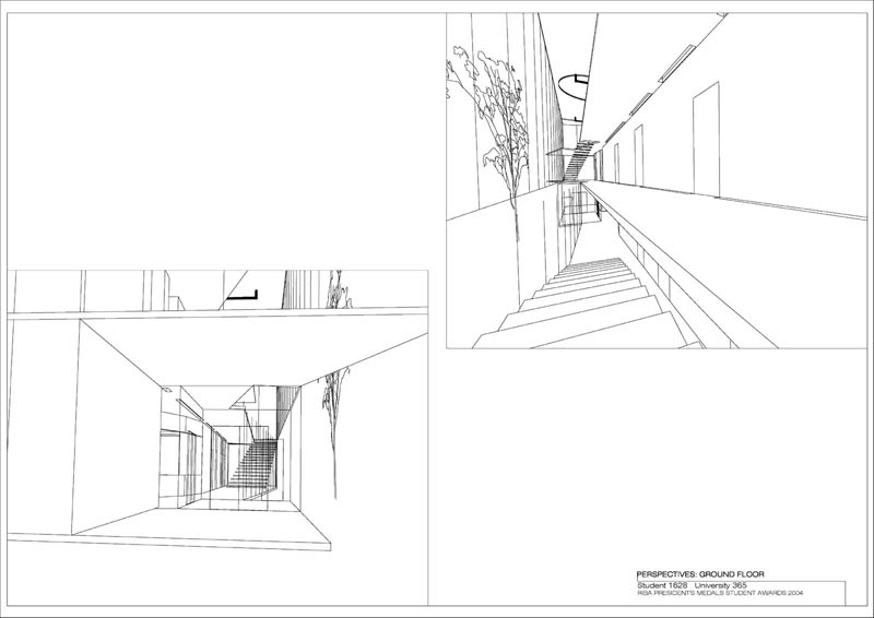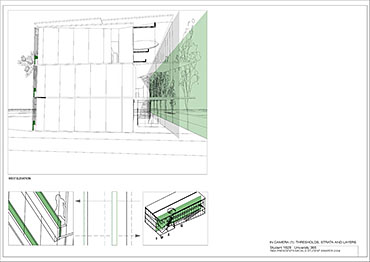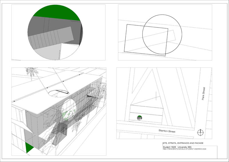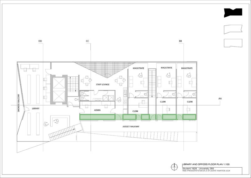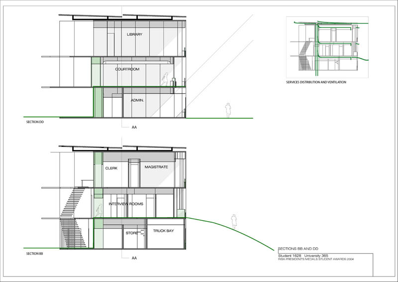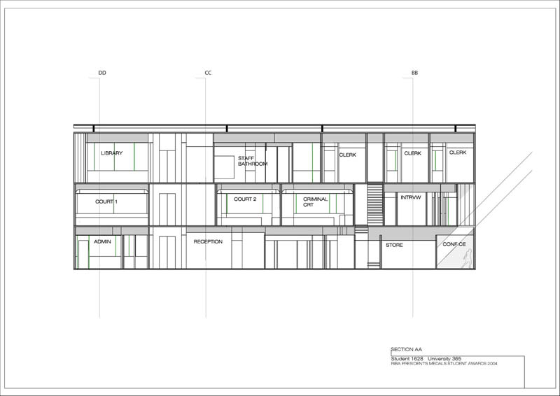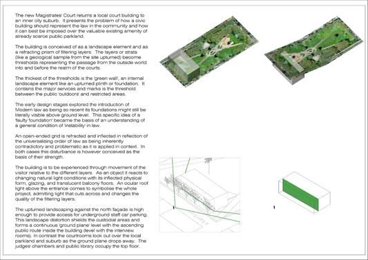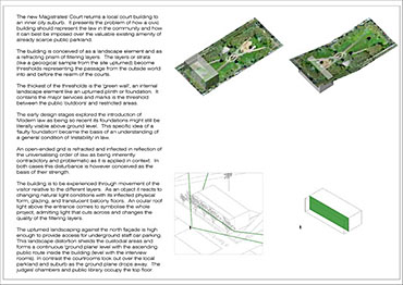 Local Magistrates Court Part 1 Project 2004 James Stephens University of Melbourne | Australia The new inner-city Magistrates’ Court faced the problem of how a civic building should represent the law in the community and how it can best be imposed over the valuable existing amenity of already scarce public parkland.The building is conceived of as a landscape element and as a refracting prism of filtering layers. The layers or strata (like a geological sample from the site upturned) become thresholds representing the passage from the outside world into and before the realm of the courts. Reacting to the visitor’s movement, it represents a universalising order inherently unstable relative to its context. The role of an institution as a unifying social element that is also sympathetic to the needs of the individual is translated in this case into a simple geometric form with fine scale detail at places of public interaction. A long narrow box with centrally located allows for functional and efficient court spaces, while subtle shifts of skin and circulation help direct the visitors attention to the parkland setting. The relation to nature is further enhanced by the oculus above the stair, with the trace of the sun connecting our mundane forms of justice to eternal cycles of time.