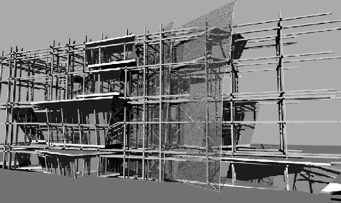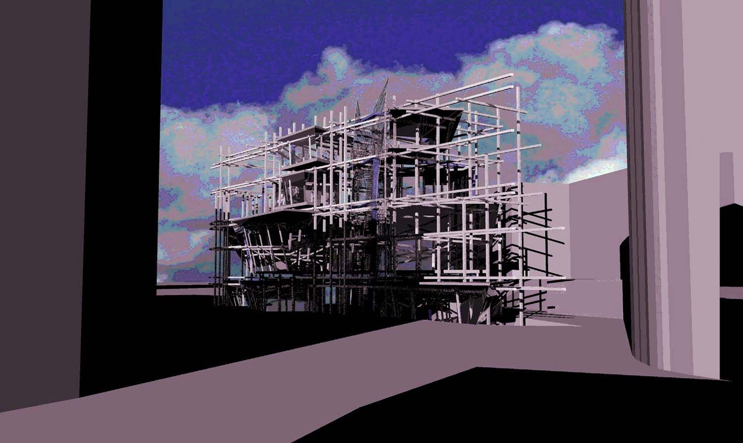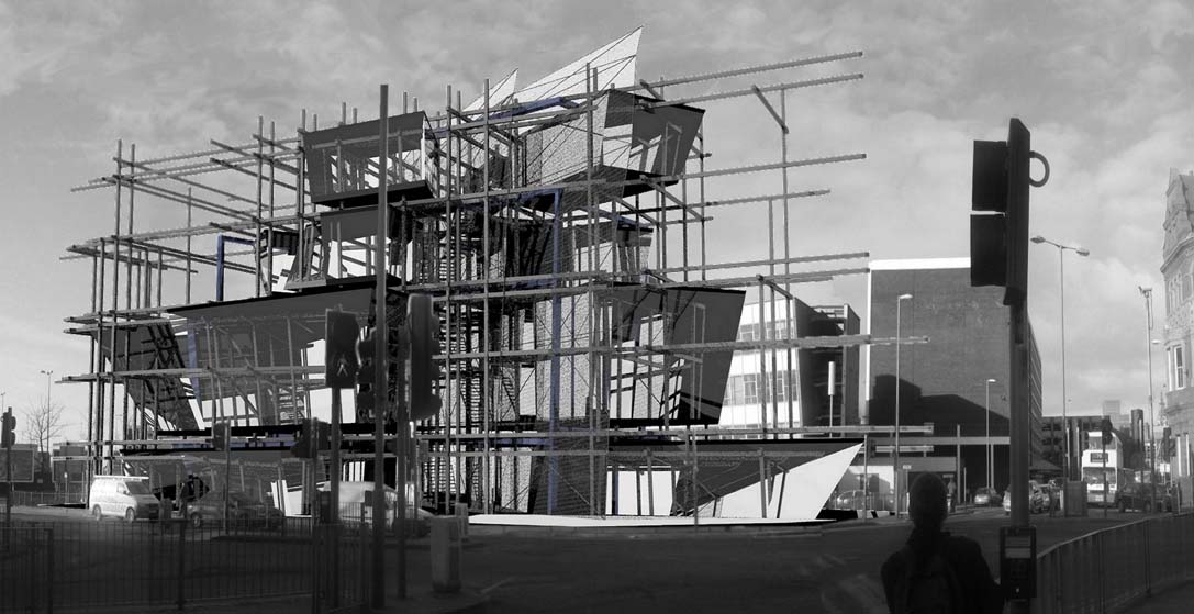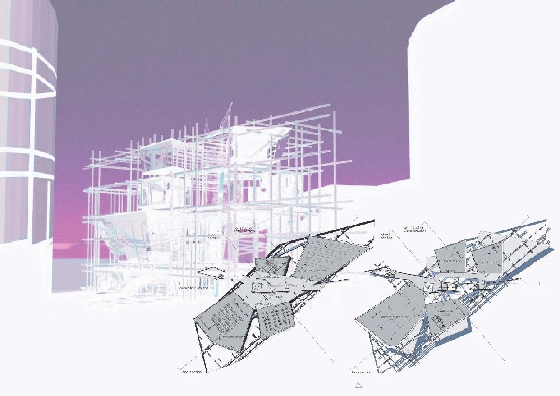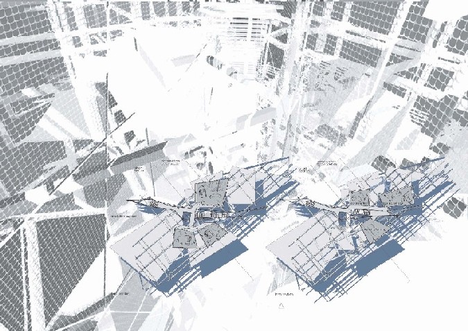 Liverpool Biennial Project Part 1 Project 2004 Neil Charlton University of Liverpool | UK The notion of the rhizome was taken as a metaphor to assemble a structure that acts as a point of connectability for different functions to be linked unhierarchically. The Biennial Centre is, thus, just one common point on an ephemeral network of thoughts, actions, memories, motives, changes and movements each following its own process of permanent becoming. Art, its creation and appreciation, were considered to be temporalities of a rhizomatic system in evolution.With this in mind, The Biennial Centre was conceived not a as the start or culmination of an experience, for these expressions imply beginnings and ends. The Centre is simply a waypoint from which individuals may be able to appreciate their position in the complex rhizomatic structure in which art, as well as themselves, are inscribed. According to the notion of the rhizome developed by Deleuze and Guattari, social structures do not exists in a vacuum but are always intertwined in complex ways. Thus, the purpose of this project, the building for the Liverpool Biennial, was to unsettle the experience of the biennial by displaying not only finalized art pieces created by internationally recognized artists but also unveiling the numerous other systems art is attached to: economics, politics and also architecture.For this reason, the architectural response is an unfinished and constantly changing structure where different elements, systems and functions meet and clash at the same time. Communication is permitted between the different components of the building —so as to allow for the building to fulfil its purpose—, yet it does not try to reconcile the differences between systems. On the contrary, architecture appears as a tool to reveal the complex reality of art institutions such as the biennial.