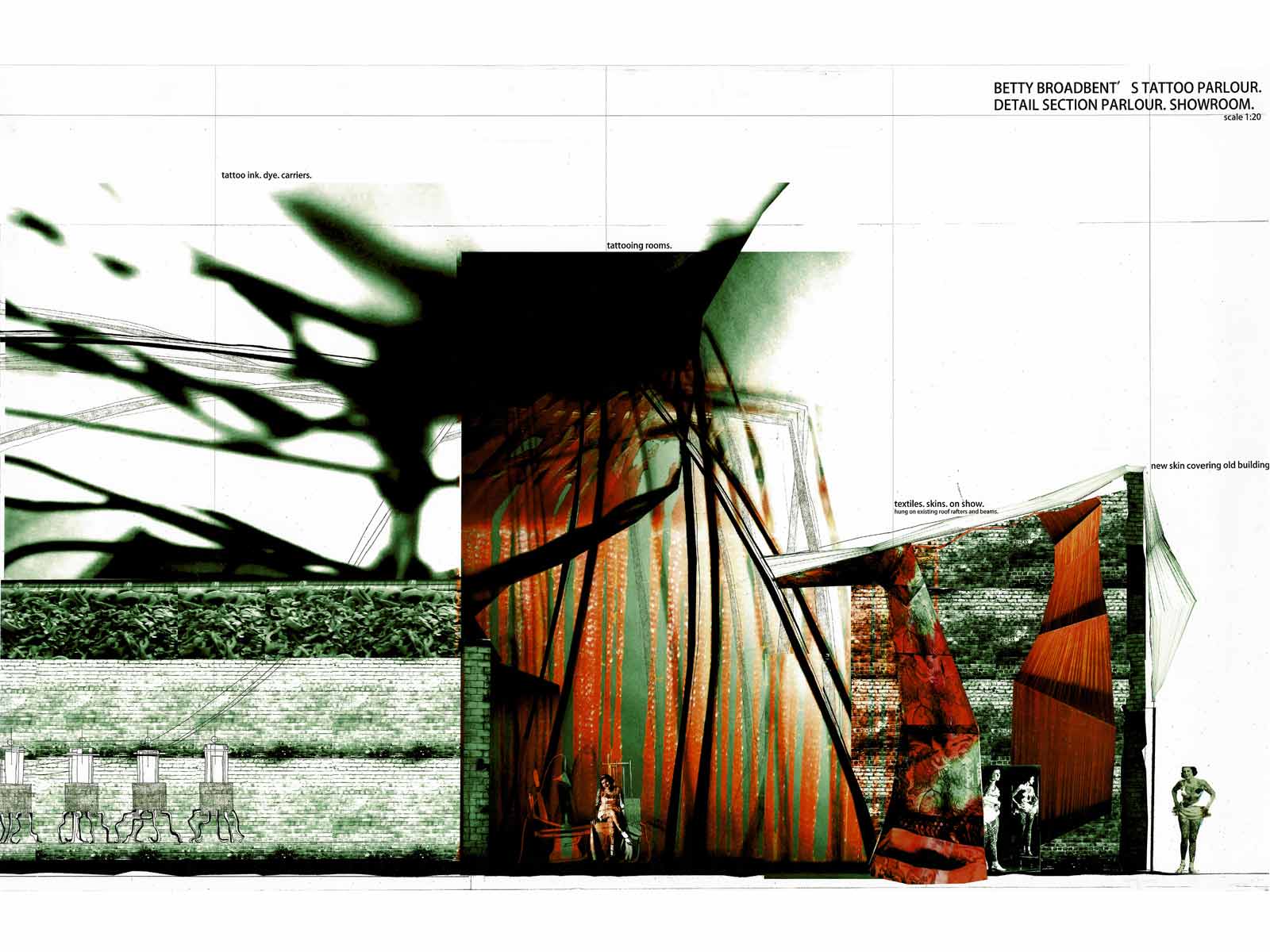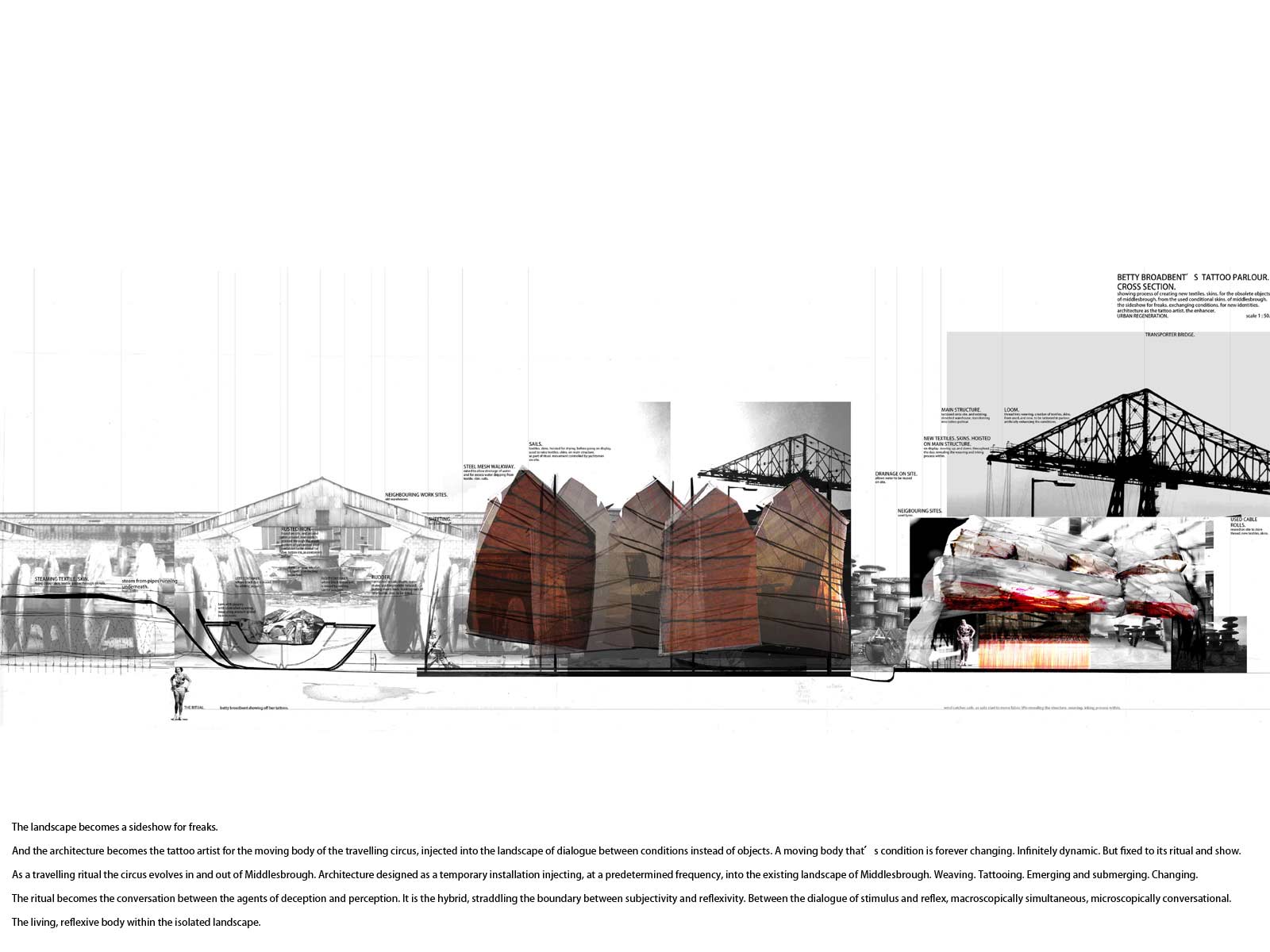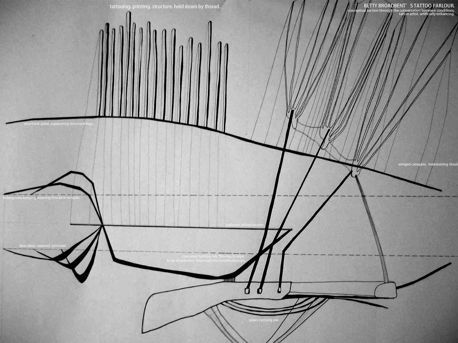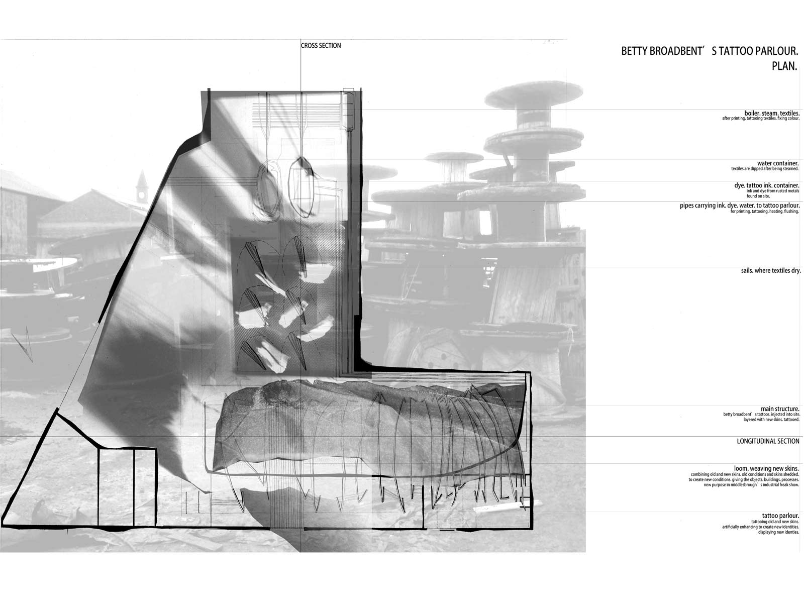 'Betty Broadbent’s Tattooing Parlour’ Part 1 Project 2005 Vanessa Vorster University of Nottingham Nottingham | UK Condition is defined as a landscape, an ephemeral, immediate context of object. Emerging as the pattern of the zebra stripe or the human fingerprint. The object becomes obsolete and the condition becomes the tattooed bodysuit of Betty Broadbent. The architecture is the tattoo artist, a travelling ritual evolving in and out of Middlesbrough, designed as a temporary installation injecting, at a predetermined frequency, into the existing landscape of Middlesbrough. Weaving. Tattooing. Uniting the debris of used conditions. Patterns emerge creating new identities. An urban regeneration of obsolete objects. Processes. Buildings. To become part of the Middlesbrough industrial circus again. The project is an enquiry derived from research into the term and philosophy of ‘human condition’ as construction.'Betty Broadbent’s Tattooing Parlour’ deals with the constant change of the condition of architecture, whereas condition is not static or descriptive, but a modus operandi. It's the main activity of a piece of architecture, context and extensions, the users. Vanessa’s project is an interactive piece in industrial Middlesbrough where peripherical structures are inhabited by Tattooing Parlours weaving and printing fabric. Project creates new questions about the relation of human, architecture, construction and last but not least ornament as function.