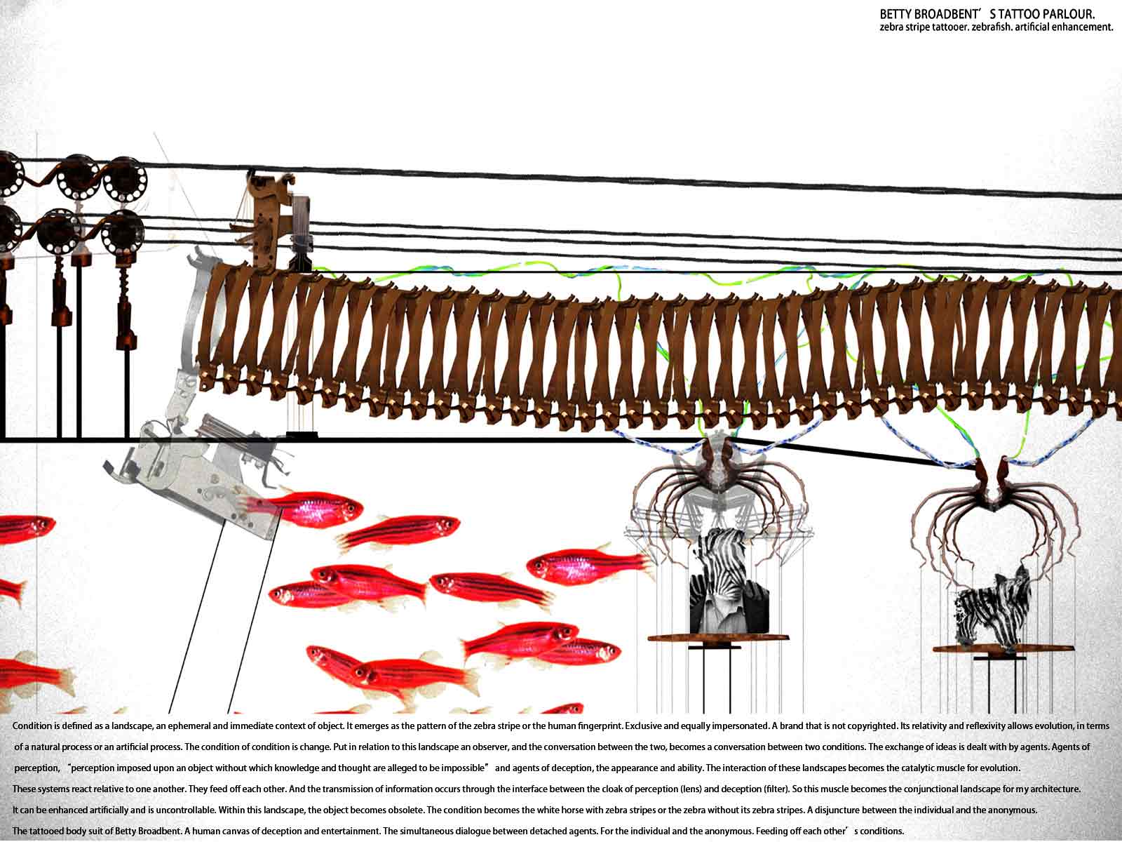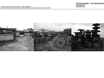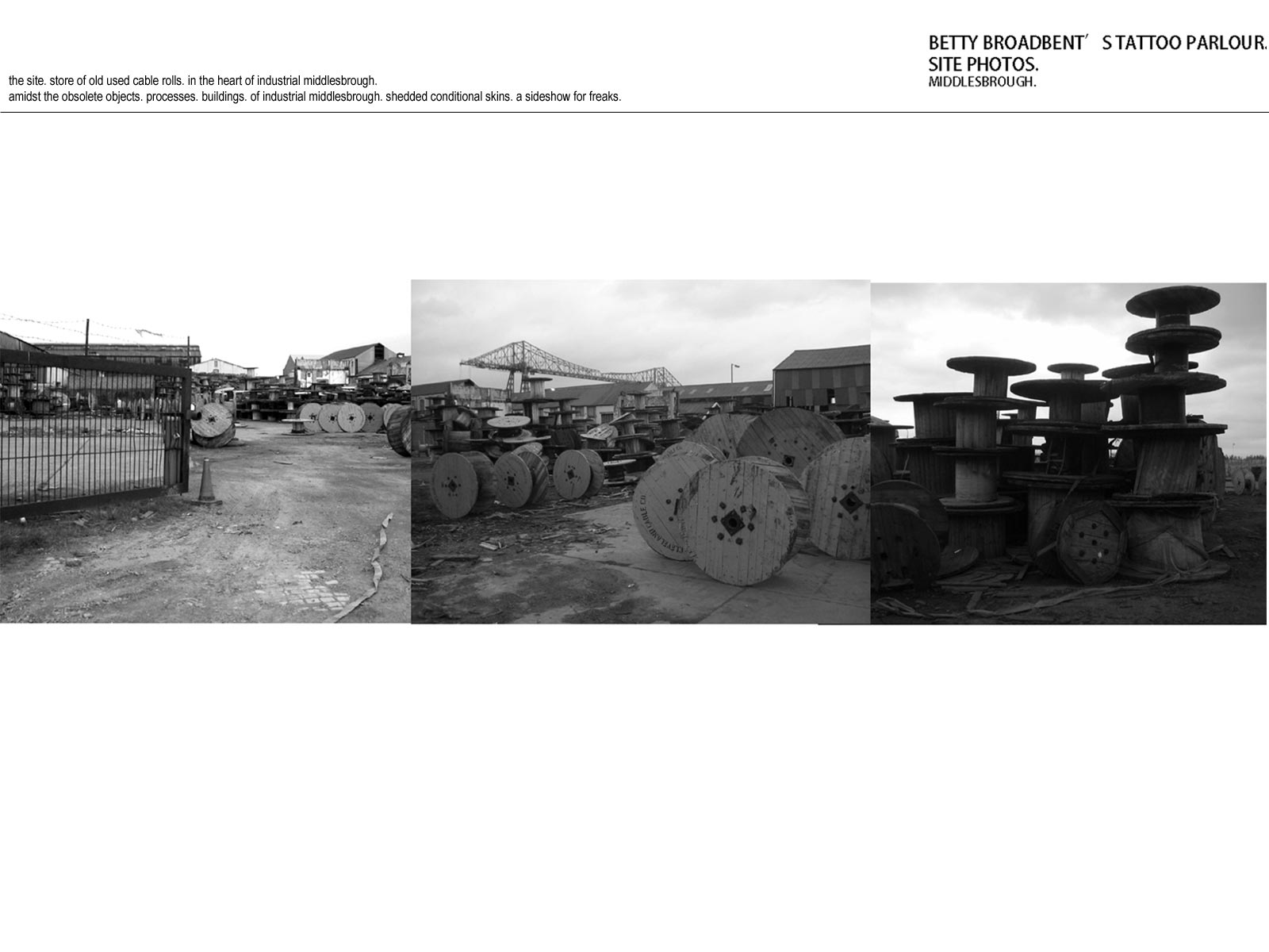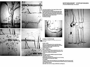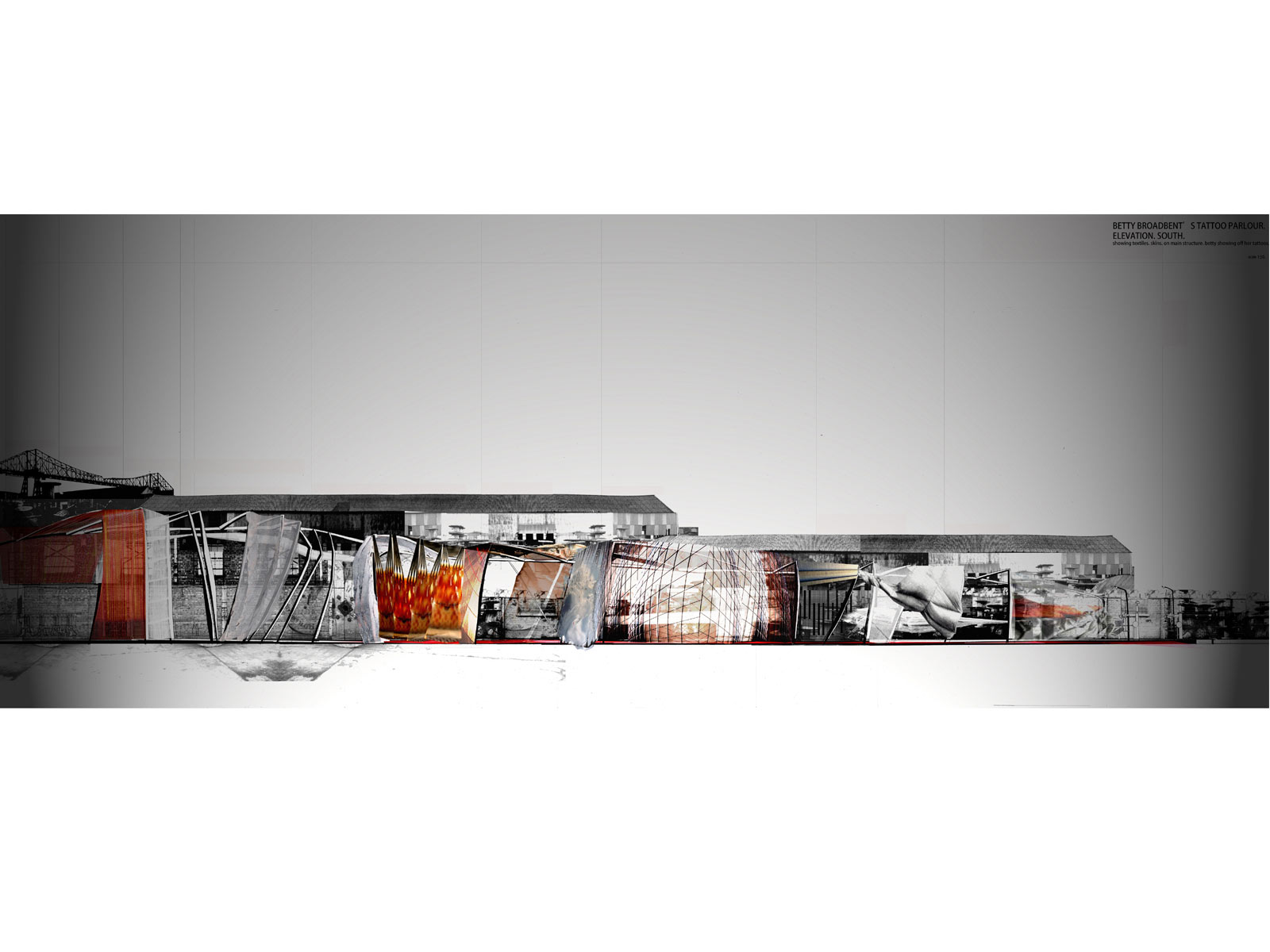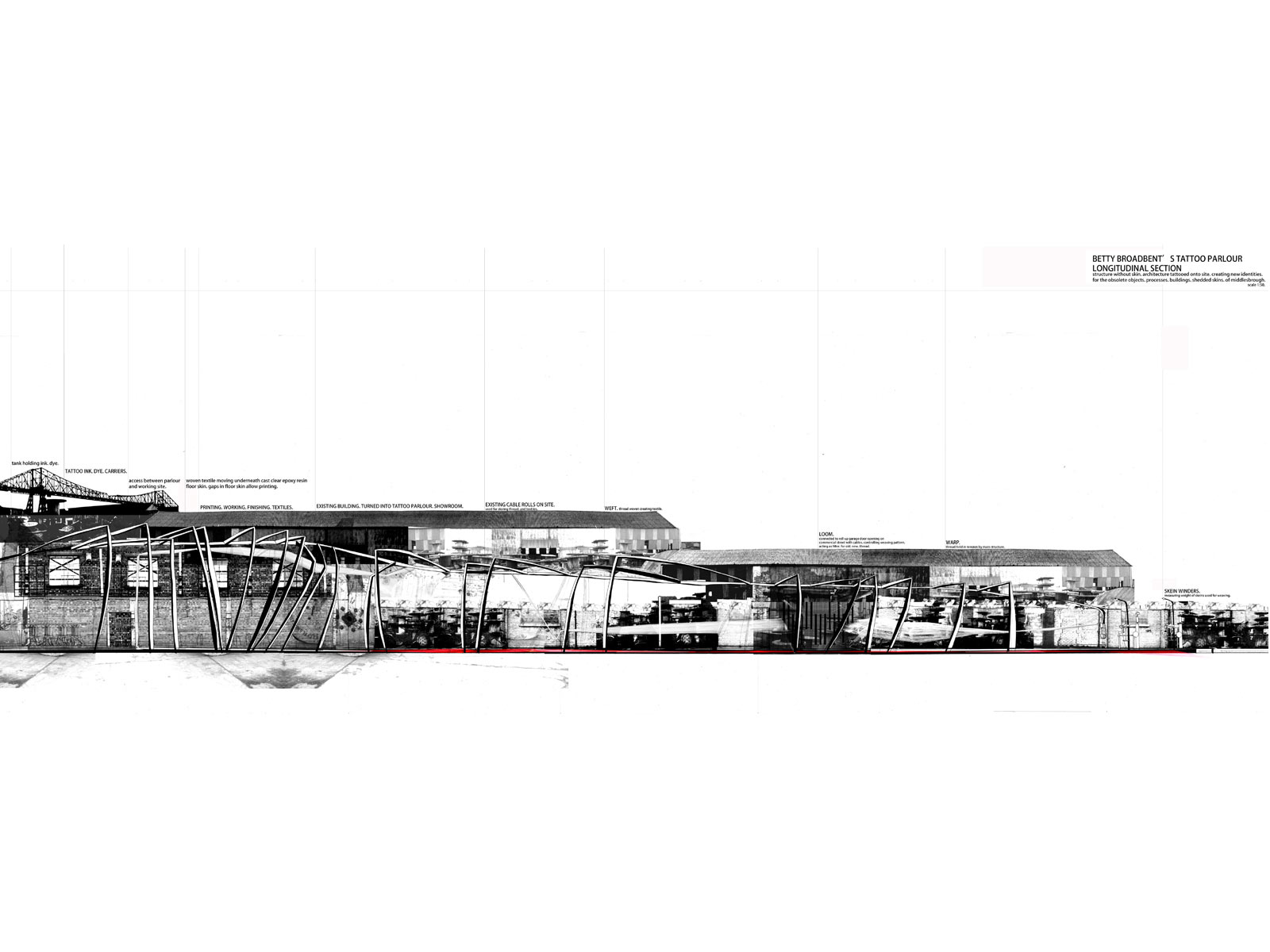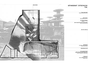 'Betty Broadbent’s Tattooing Parlour’ Part 1 Project 2005 Vanessa Vorster University of Nottingham Nottingham | UK Condition is defined as a landscape, an ephemeral, immediate context of object. Emerging as the pattern of the zebra stripe or the human fingerprint. The object becomes obsolete and the condition becomes the tattooed bodysuit of Betty Broadbent. The architecture is the tattoo artist, a travelling ritual evolving in and out of Middlesbrough, designed as a temporary installation injecting, at a predetermined frequency, into the existing landscape of Middlesbrough. Weaving. Tattooing. Uniting the debris of used conditions. Patterns emerge creating new identities. An urban regeneration of obsolete objects. Processes. Buildings. To become part of the Middlesbrough industrial circus again. The project is an enquiry derived from research into the term and philosophy of ‘human condition’ as construction.'Betty Broadbent’s Tattooing Parlour’ deals with the constant change of the condition of architecture, whereas condition is not static or descriptive, but a modus operandi. It's the main activity of a piece of architecture, context and extensions, the users. Vanessa’s project is an interactive piece in industrial Middlesbrough where peripherical structures are inhabited by Tattooing Parlours weaving and printing fabric. Project creates new questions about the relation of human, architecture, construction and last but not least ornament as function.