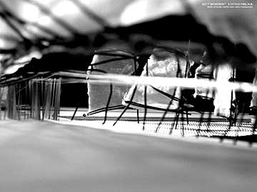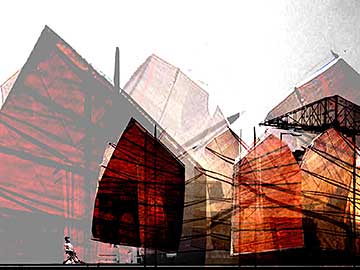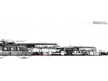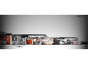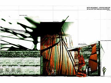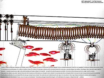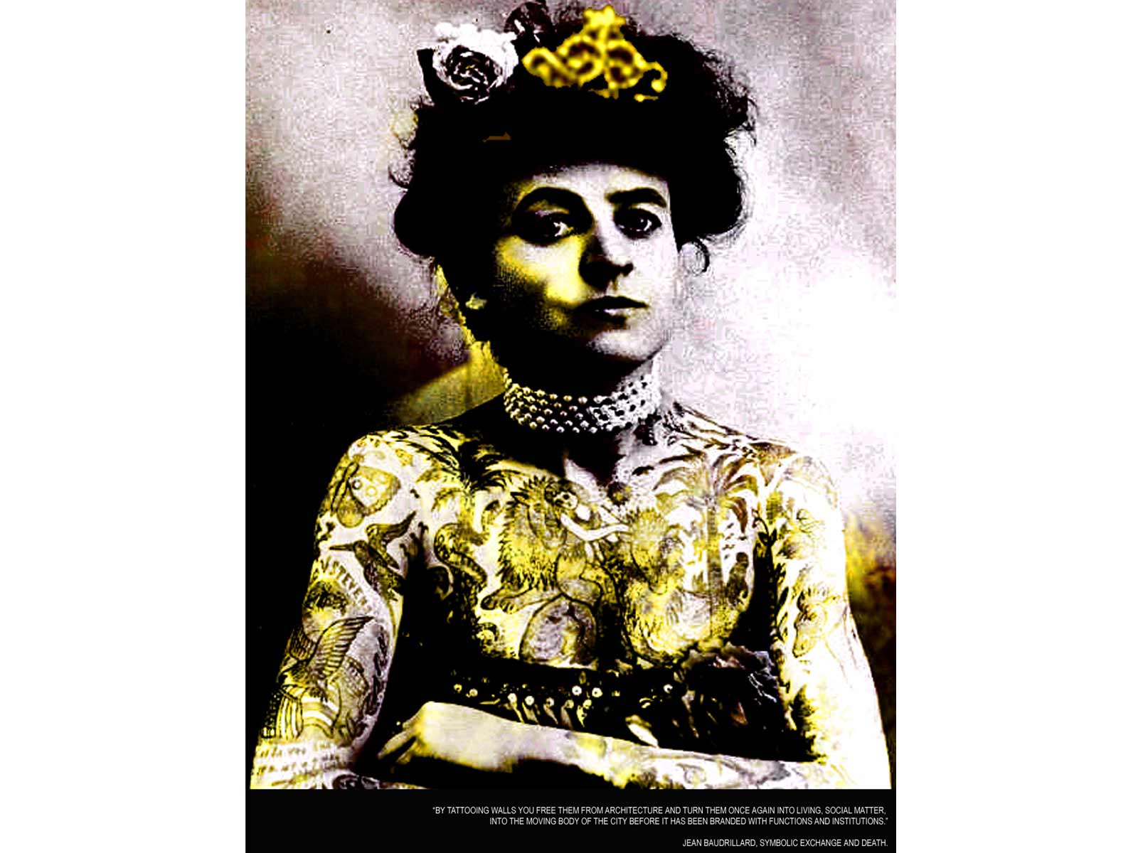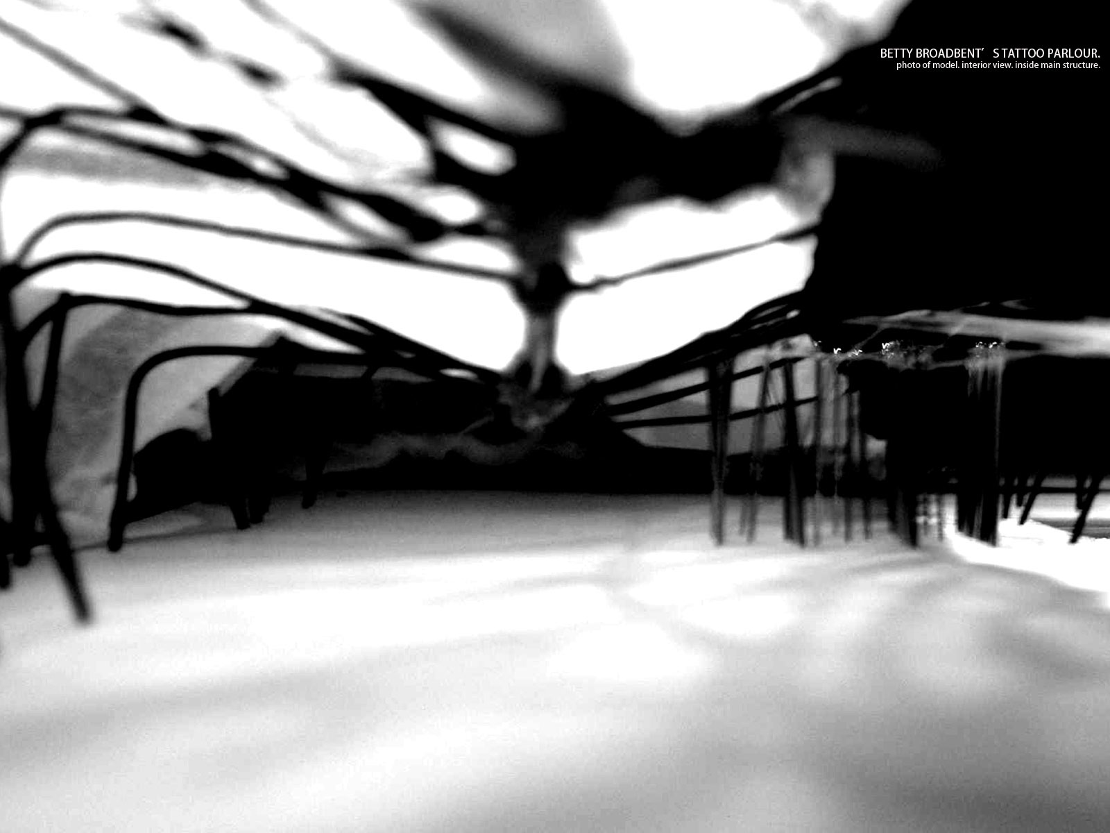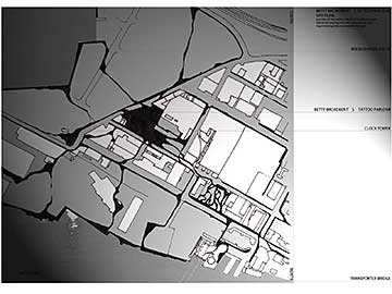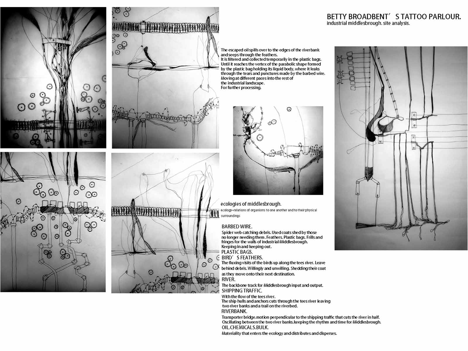 'Betty Broadbent’s Tattooing Parlour’ Part 1 Project 2005 Vanessa Vorster University of Nottingham Nottingham | UK Condition is defined as a landscape, an ephemeral, immediate context of object. Emerging as the pattern of the zebra stripe or the human fingerprint. The object becomes obsolete and the condition becomes the tattooed bodysuit of Betty Broadbent. The architecture is the tattoo artist, a travelling ritual evolving in and out of Middlesbrough, designed as a temporary installation injecting, at a predetermined frequency, into the existing landscape of Middlesbrough. Weaving. Tattooing. Uniting the debris of used conditions. Patterns emerge creating new identities. An urban regeneration of obsolete objects. Processes. Buildings. To become part of the Middlesbrough industrial circus again. The project is an enquiry derived from research into the term and philosophy of ‘human condition’ as construction.'Betty Broadbent’s Tattooing Parlour’ deals with the constant change of the condition of architecture, whereas condition is not static or descriptive, but a modus operandi. It's the main activity of a piece of architecture, context and extensions, the users. Vanessa’s project is an interactive piece in industrial Middlesbrough where peripherical structures are inhabited by Tattooing Parlours weaving and printing fabric. Project creates new questions about the relation of human, architecture, construction and last but not least ornament as function.