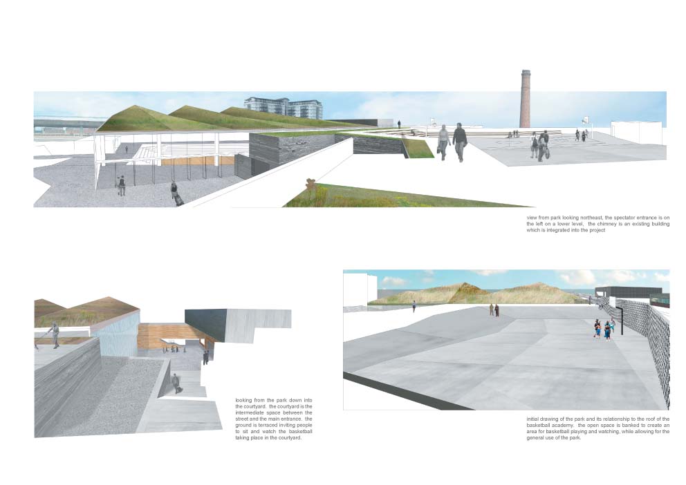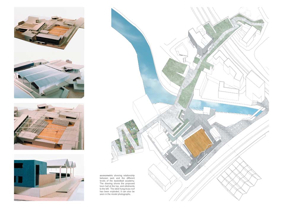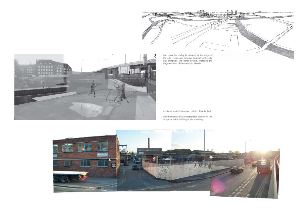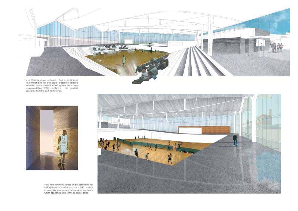Beyond the Games Part 2 Project 2005 Tim Weeden Kingston University Kingston | UK The Basketball Academy houses the London Towers Basketball Team and a number of community basketball organisations. It provides a permanent base for sport in the Lower Lea Valley. The scheme is an exploration of the way people participate in sport, how a building can adjust to differing requirements and changing inhabitation. Basketball is played in a number of situations, ranging from formal to informal. The Academy is situated under a new park which forms a bridge between fragmented communities and also links to other public amenities. The scheme mediates between the existing industrial landscape and the new public space. The site falls to the South of the Mile End Road on the fringes of the ground of the London Olympic bid. The land currently remains cut off from the surrounding area in both programme and content. The studio first looked at the infrastructure and included a new flyover and raised park - which forms a part of this proposal. Tim’s Project for a basketball academy developed the idea of a sports academy which could thrive amidst the communities of East London and integrate the administration and viewing of basketball at its highest level with other activities in the area.