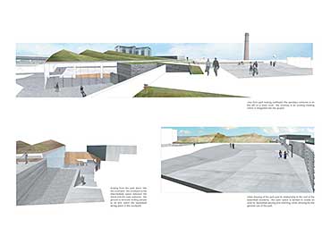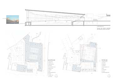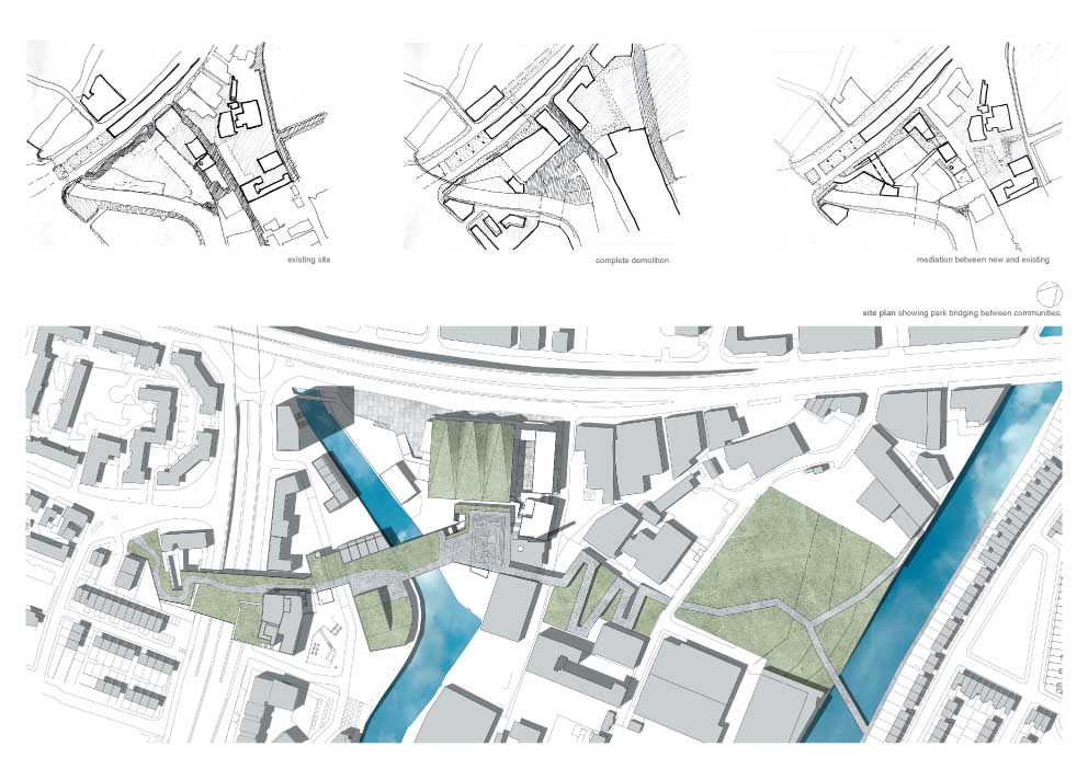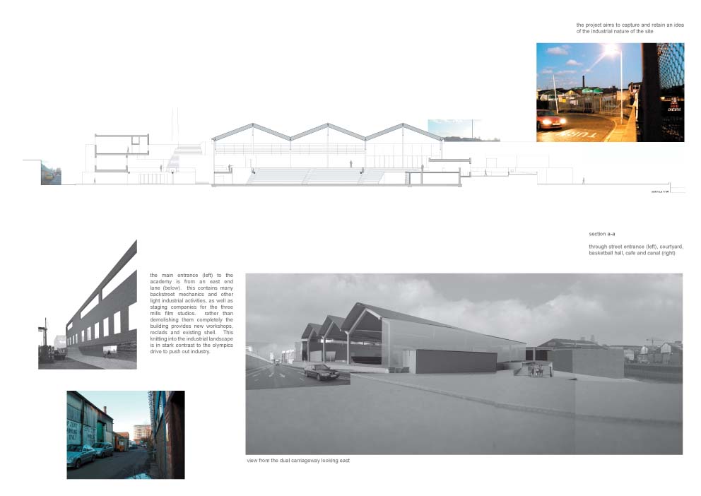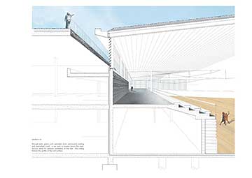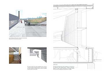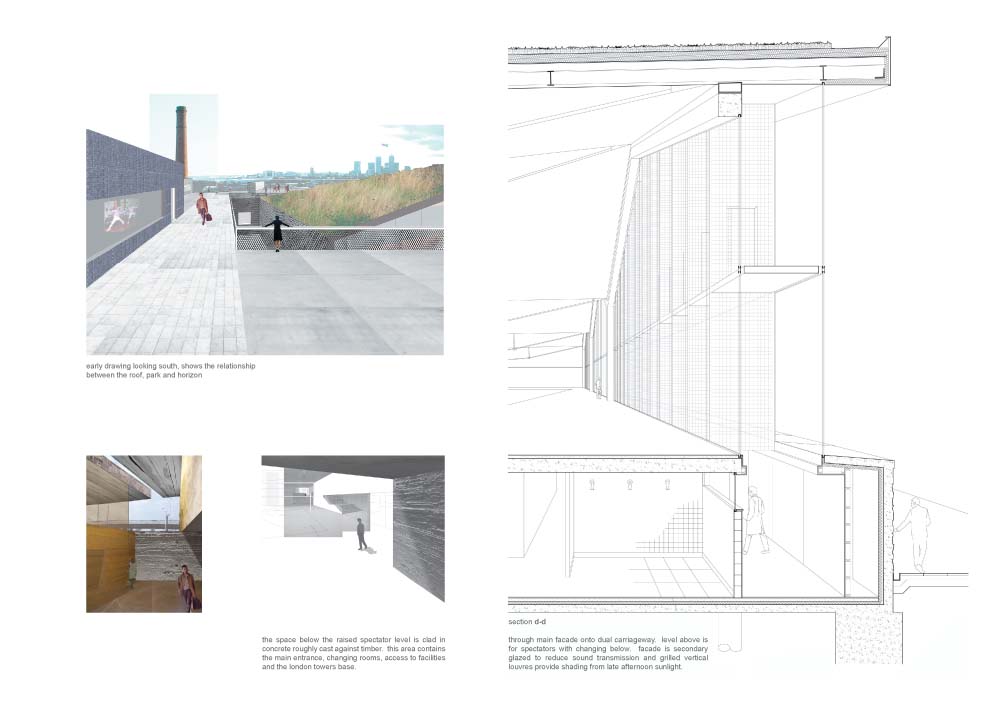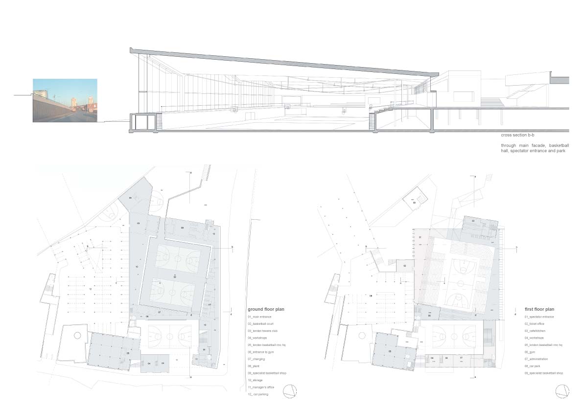Beyond the Games Part 2 Project 2005 Tim Weeden Kingston University Kingston | UK The Basketball Academy houses the London Towers Basketball Team and a number of community basketball organisations. It provides a permanent base for sport in the Lower Lea Valley. The scheme is an exploration of the way people participate in sport, how a building can adjust to differing requirements and changing inhabitation. Basketball is played in a number of situations, ranging from formal to informal. The Academy is situated under a new park which forms a bridge between fragmented communities and also links to other public amenities. The scheme mediates between the existing industrial landscape and the new public space. The site falls to the South of the Mile End Road on the fringes of the ground of the London Olympic bid. The land currently remains cut off from the surrounding area in both programme and content. The studio first looked at the infrastructure and included a new flyover and raised park - which forms a part of this proposal. Tim’s Project for a basketball academy developed the idea of a sports academy which could thrive amidst the communities of East London and integrate the administration and viewing of basketball at its highest level with other activities in the area.