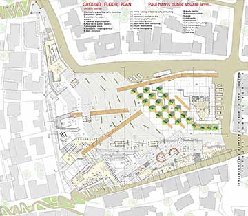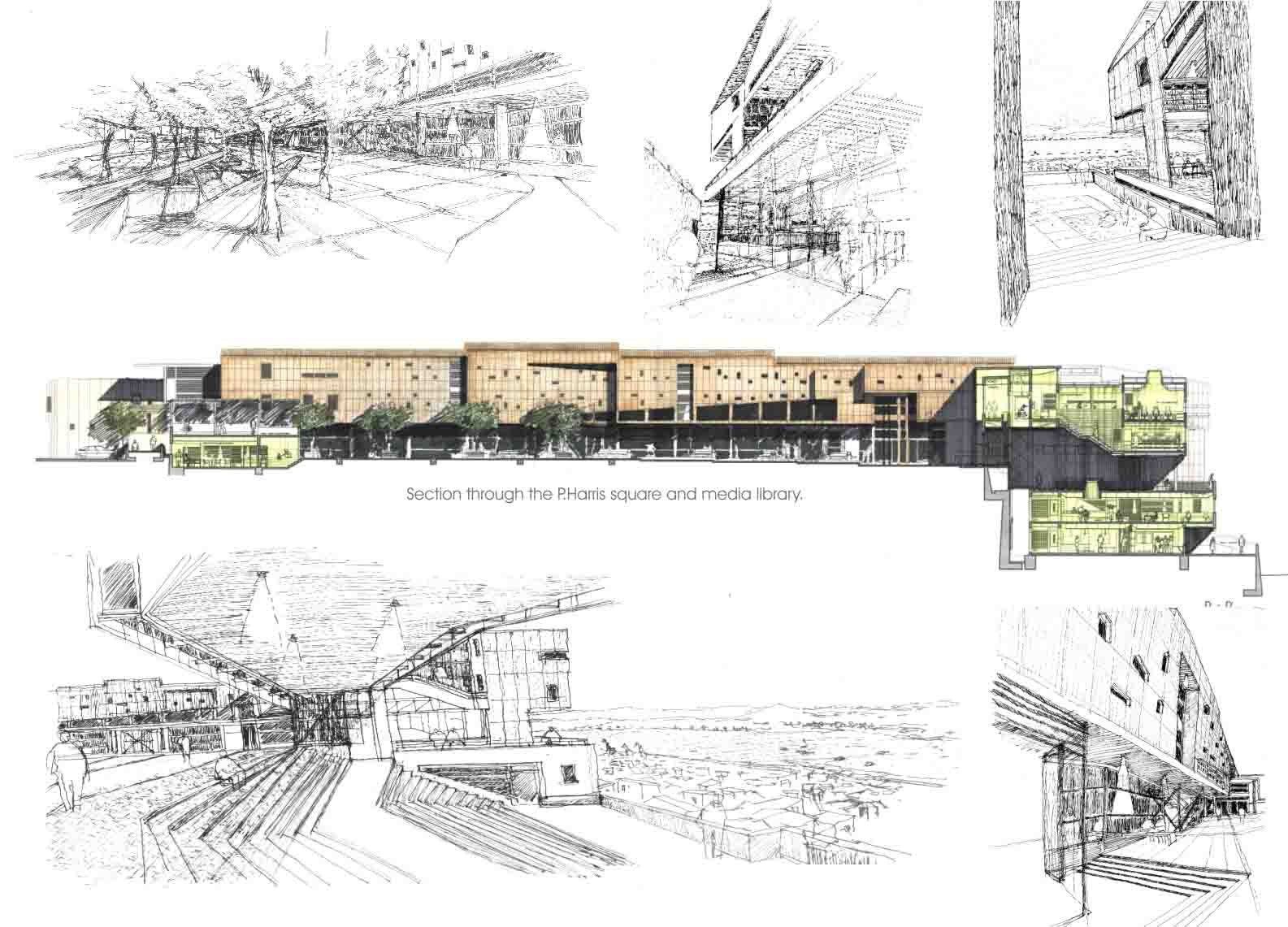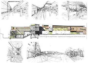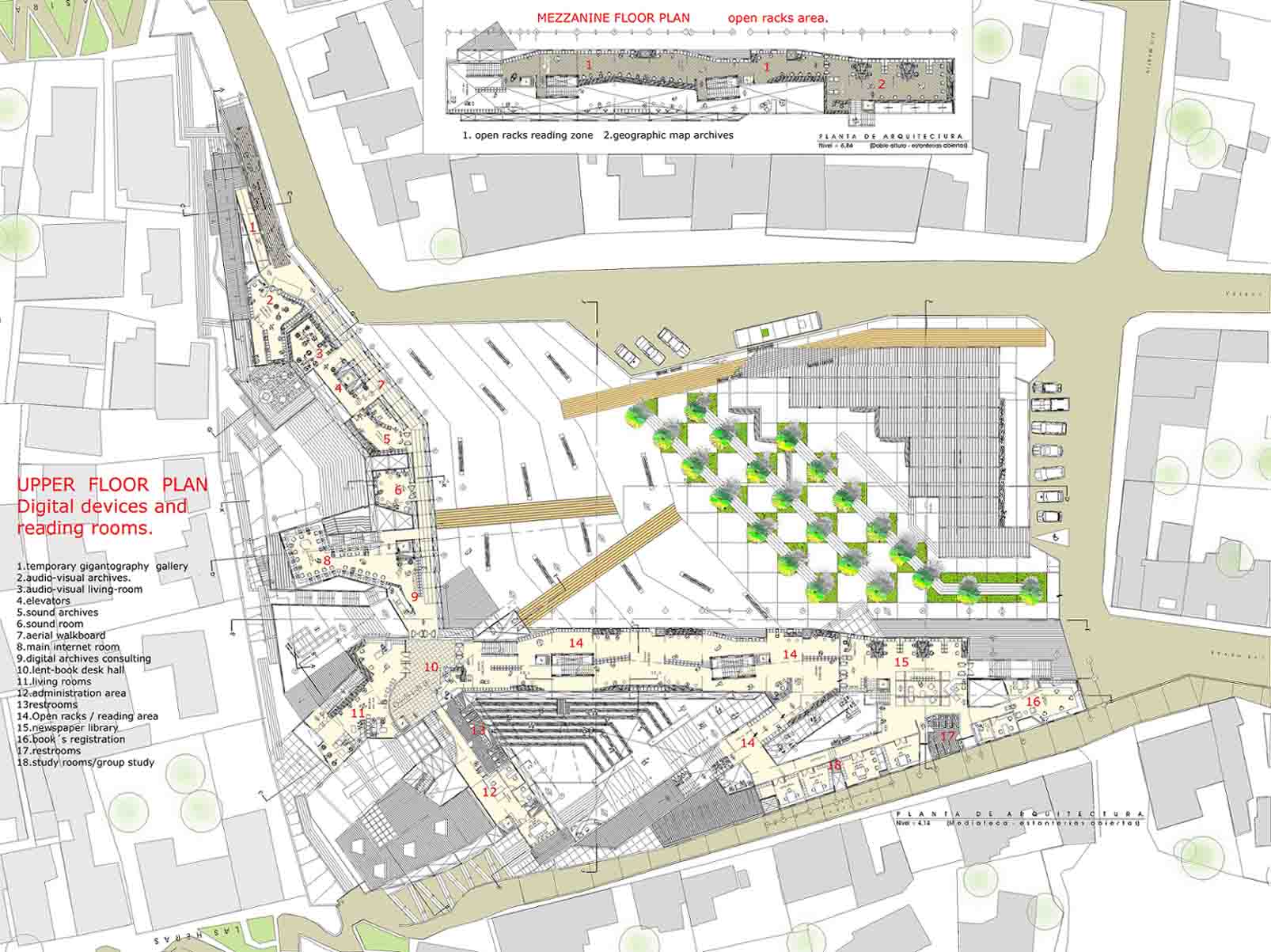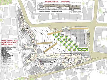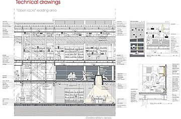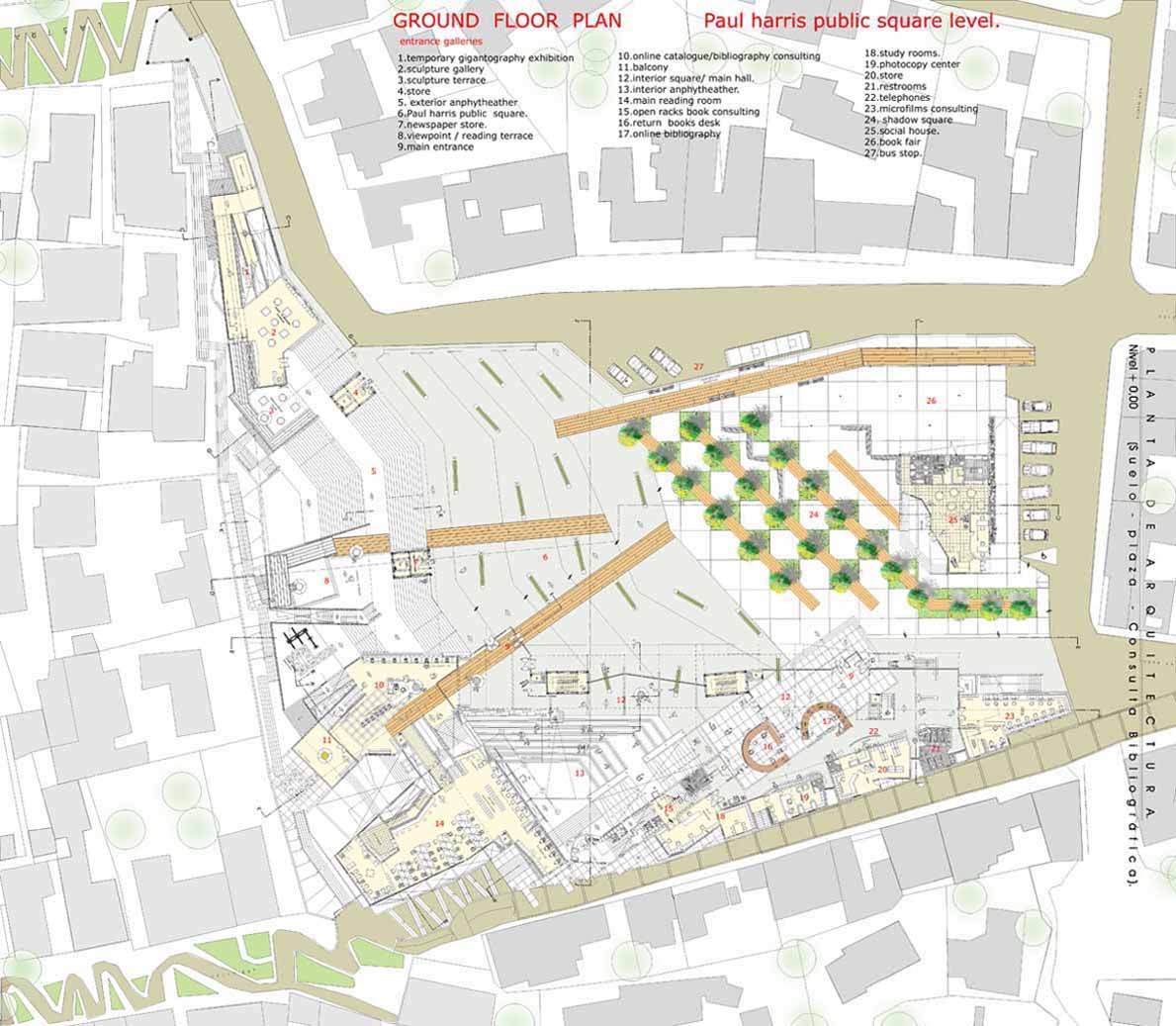 The library could be like a connection between the information places and the streets, also an existing square pass trough the building to create a new interior public space , which are all the catalog information , and the reading rooms.