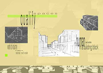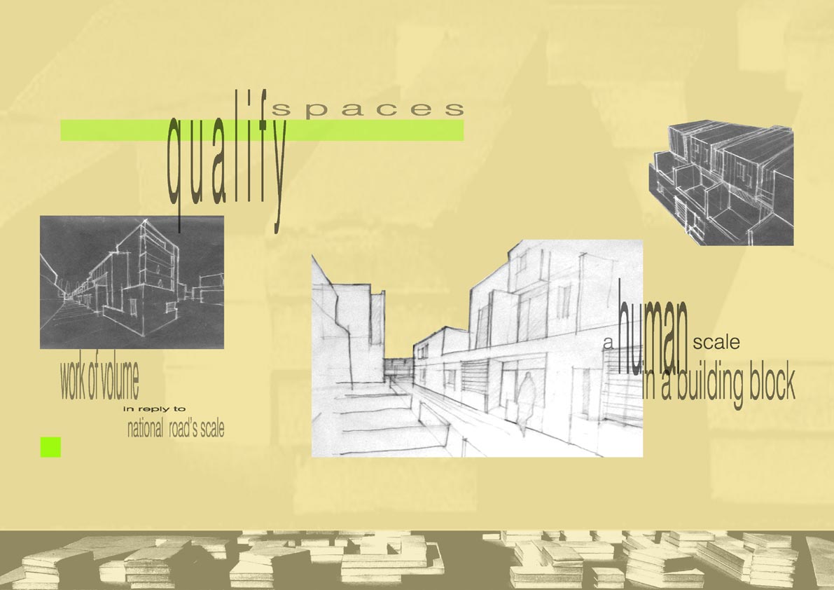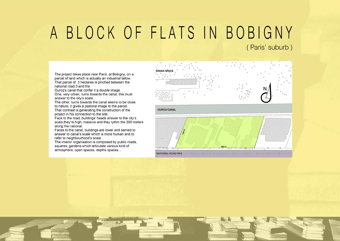 The principal objective is to acqire a urban and architectural learning. By the existant city’s observation, the student could develop a critical think in order to applicate it in his project. This method is more rich than all the abstract urban theorie. The personal sensitive experience of the site guides the formal realisation. The challenge is to translate in space all the originals volunteers. Identifying a piece of land, the student had to project both architectural and urban preoccupation.