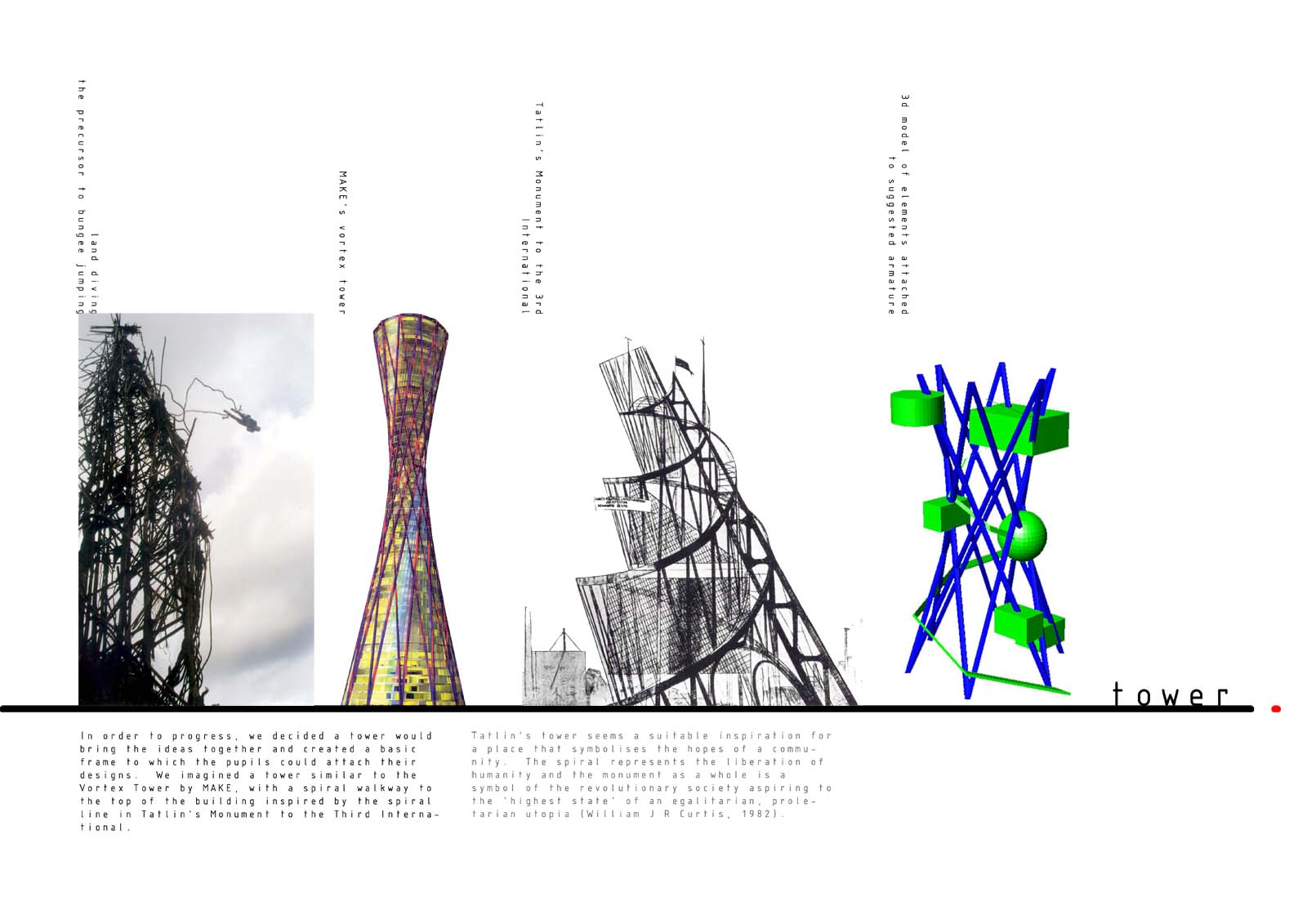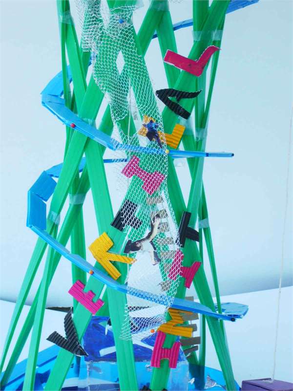 In a three day workshop, we collaborated with 13 year-old pupils from Castlebrae High School to design a community facility for an ideal vision of Craigmillar, an area undergoing extensive regeneration. After our conversations, it became clear that they need a place to socialise with people their own age. Whilst initial projects allowed pupils to explore their ideas for their new place, the tower armature allowed ideas to come together. We learnt a fresh perspective of the built environment and the pupils began thinking about the spaces they inhabit, each colourful model presenting an idea for a more optimistic Craigmillar.