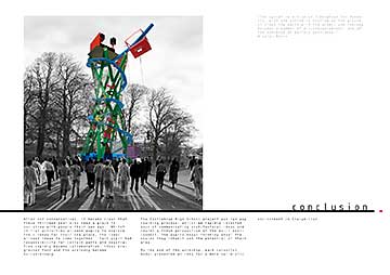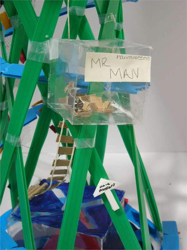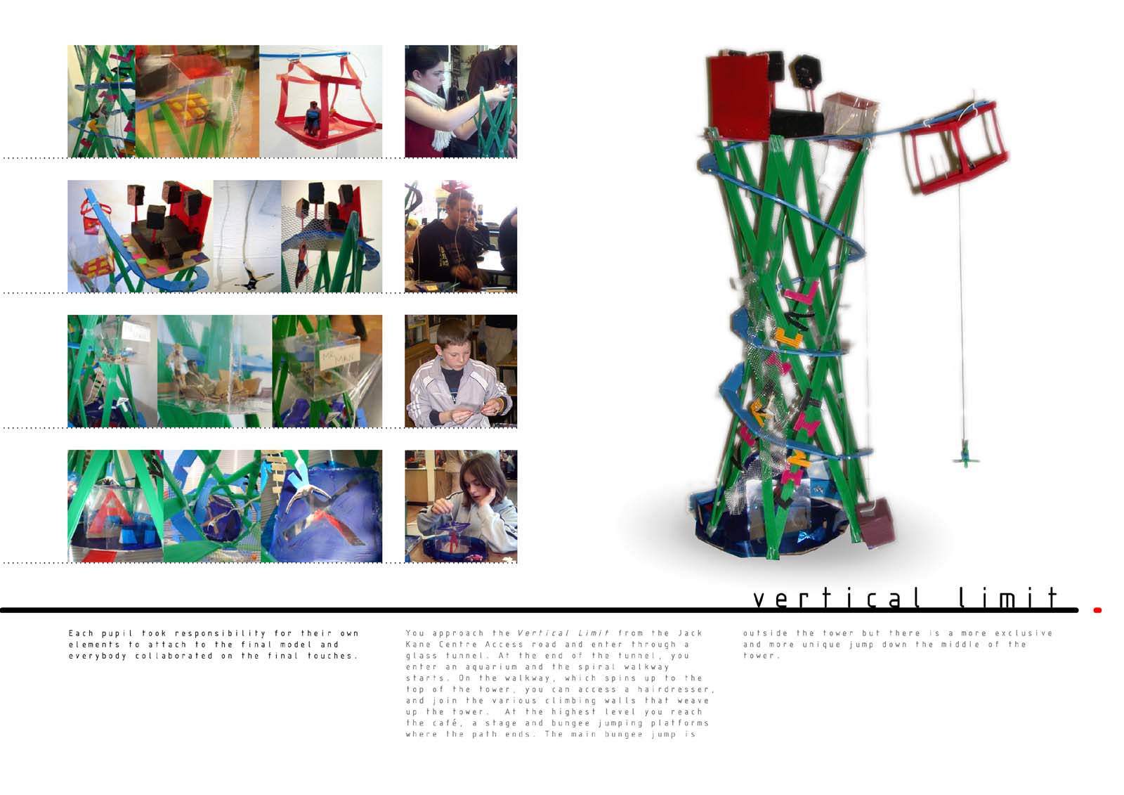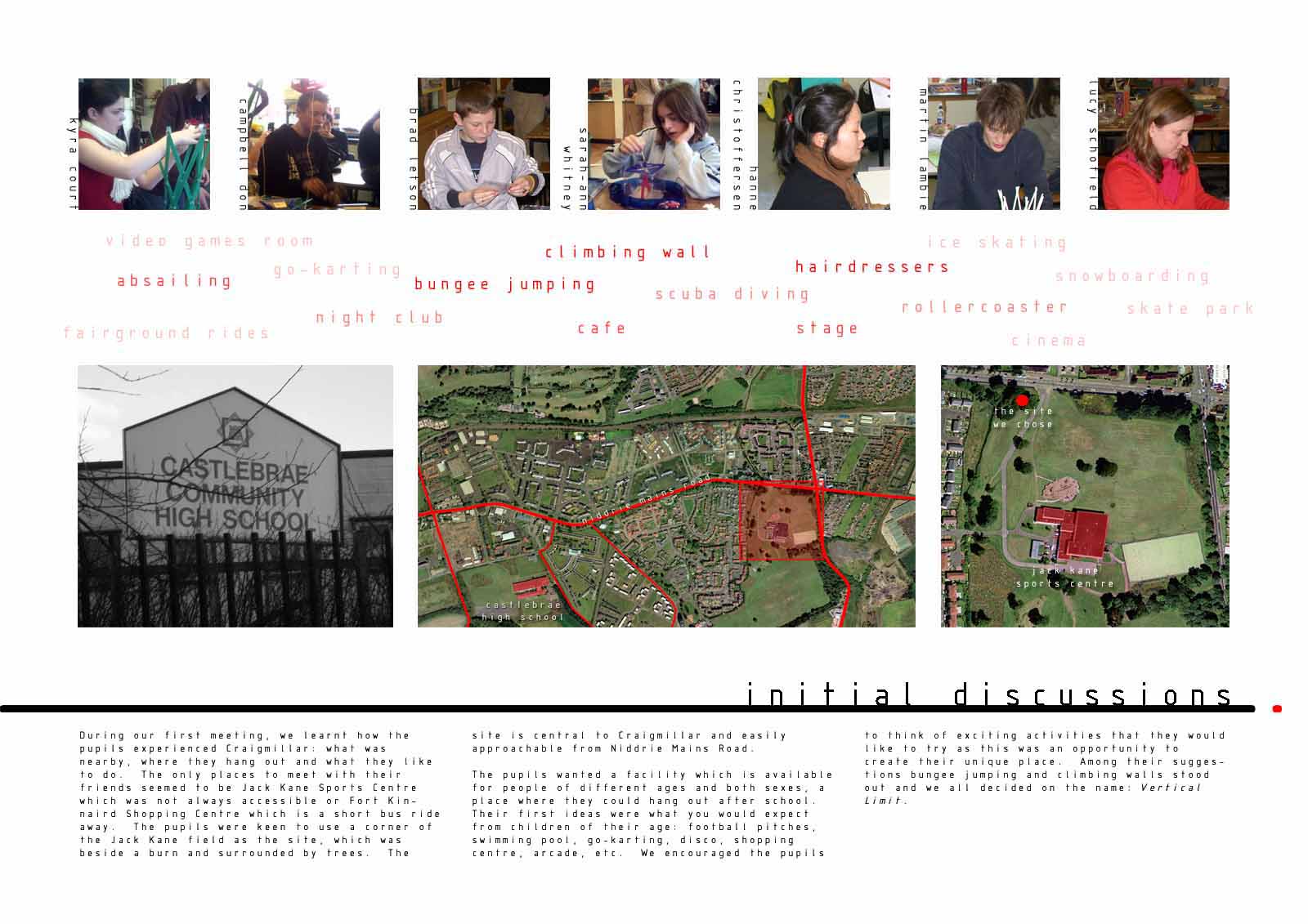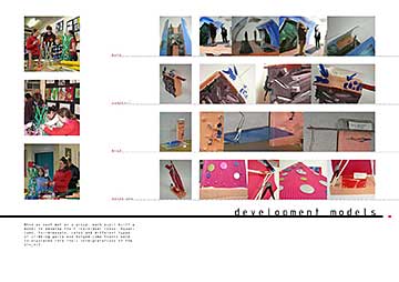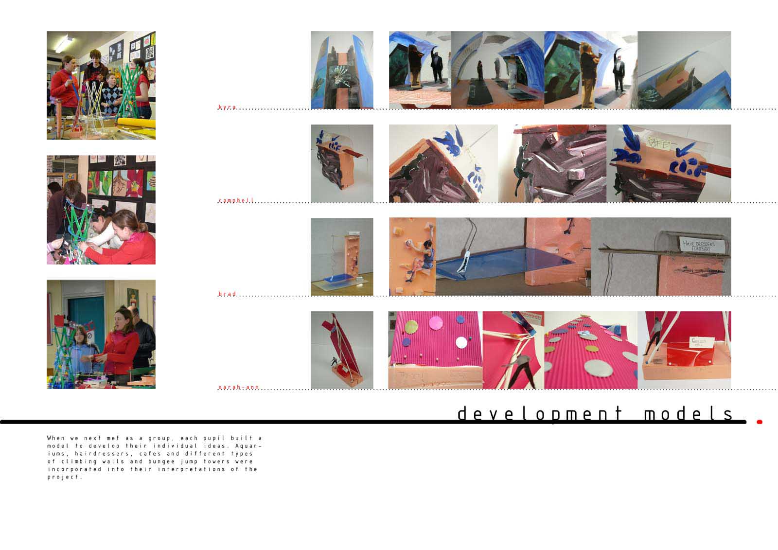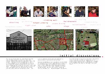 The pupils revealed their unanimous desire for additional community facilities at specific locations focused on teenagers, which would make a difference. They communicated their ideas through drawings and words. This formed the content of a two day workshop where small models of these provocative facilities were located on a big site model. Larger models were then made to explore the internal and external nature of these facilities. The students recorded events as they unfolded and published a catalogue..