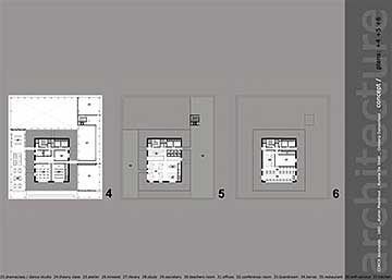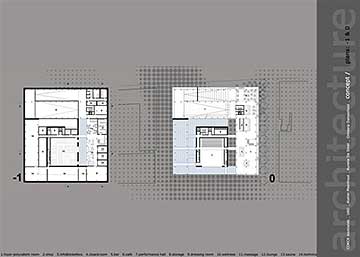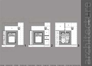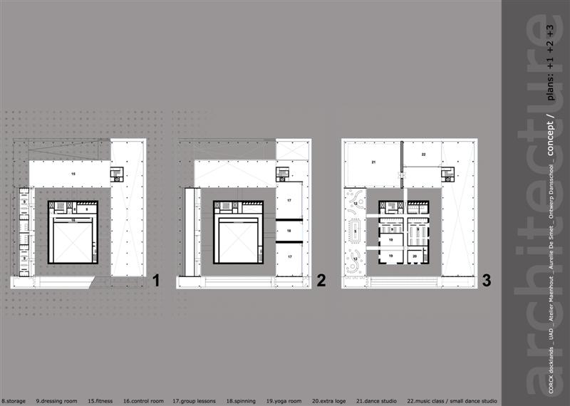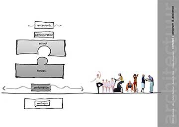 The ground floor, housing the performance hall is a truly public space. The wellness centre and fitness school are open to everybody, above, the professional dancing school is more private. The lounge provides a link between both; where ballerina and bodybuilder meet.