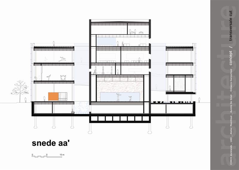 The opposition between dance and architecture is translated into a massive core and a transparent shell. The building seems to be floating out of balance, the slow circulation parades along the riverside façade.