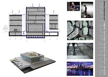The solid concept was translated into a context related project, containing multiple compositional and spatial qualities. The design process was supported by an elaborate technical study and thorough detailing, to end up in an intriguing ‘promenade architecturale’. In the comprehensive graphical presentation the perception of the building is represented by the visualization of day-and-night sequences of the interior and exterior of the building in relation to its harbor environment.