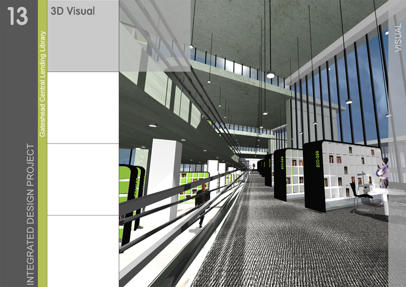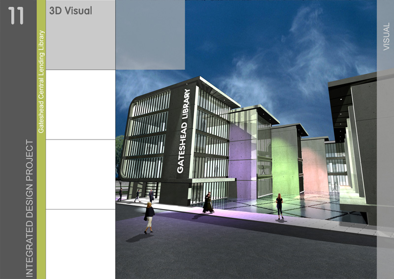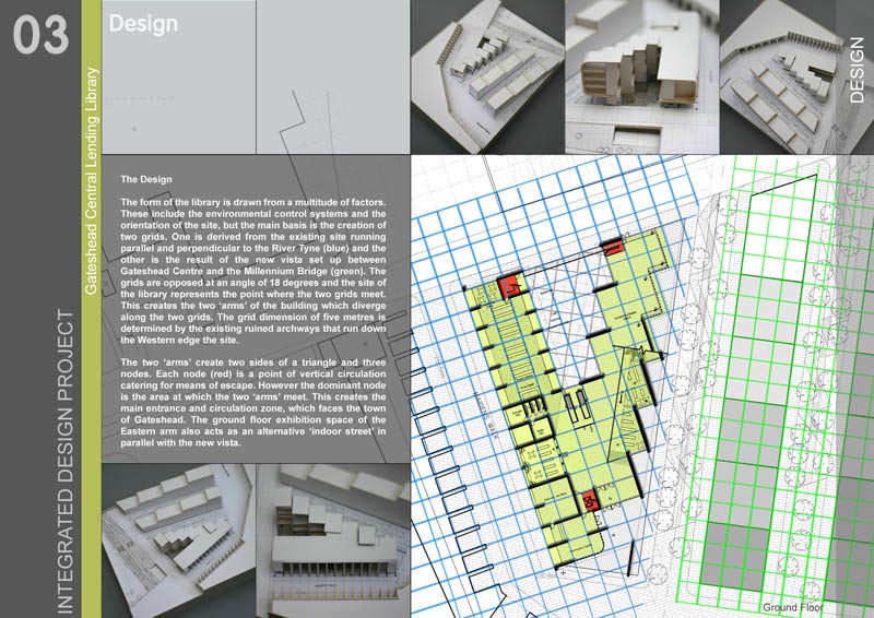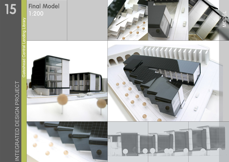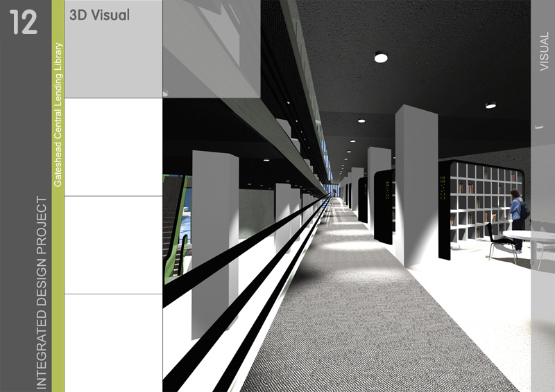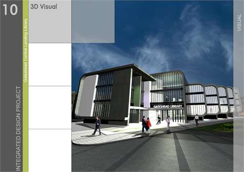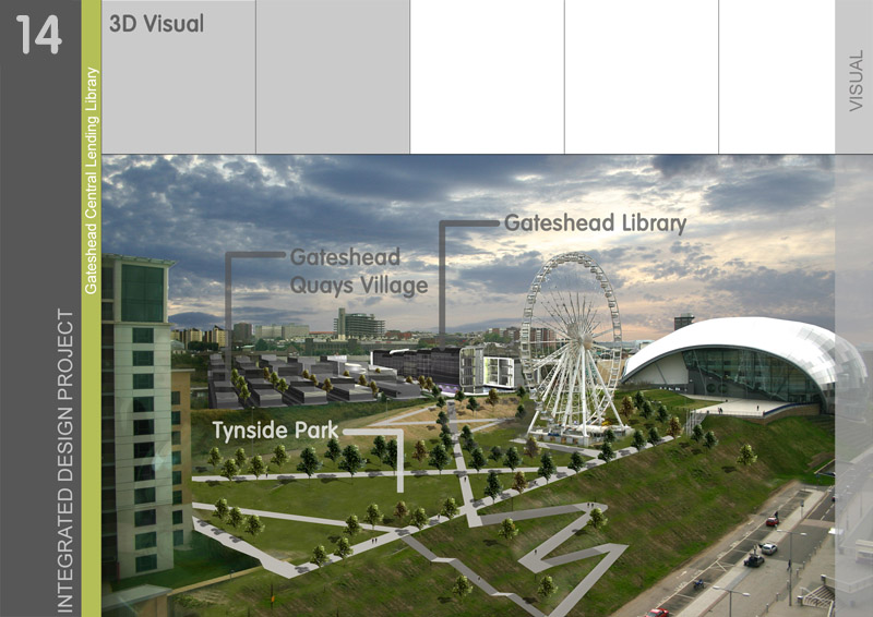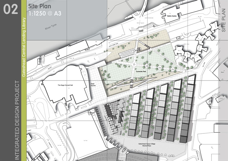 Library, Gateshead Part 2 Project 2006 Simon Cretney De Montfort University | UK Gateshead and Newcastle face one another across the River Tyne, showing rivalry and diversity through history. Today, Newcastle’s grand classical architecture stands in contrast with the rundown 1960s and 70s structures that dominate Gateshead, one of Britain’s poorest areas.Regeneration of Gateshead Quays has produced fine buildings and facilities. However they also display severe contrast and separation from the town and its population. This is addressed in an urban design plan encouraging links between the town and the Quays, providing a facility for the population; a vibrant, fun and technologically advanced library as part of a new urban village. Sited at the meeting of three axis, the proposal works with the Gateshead Sage and the River Tyne to make a place of resolution. The site profile is echoed in the section and the ramped journey through the book stacks is punctuated with reminders of these axis and the location of the building in all its contexts. The language of the exterior has the precision of a musical instrument and evokes an older modernism while looking forward to a new era.