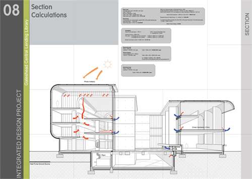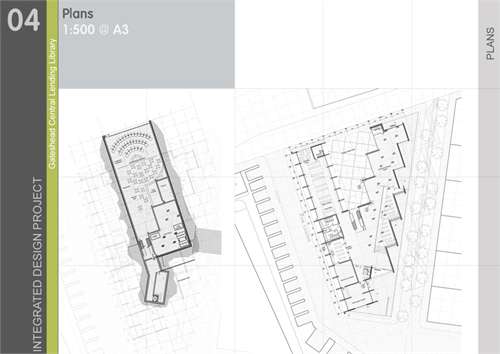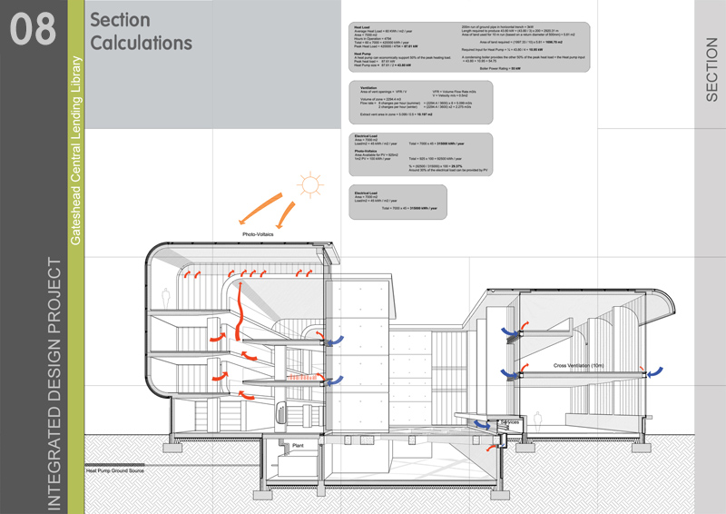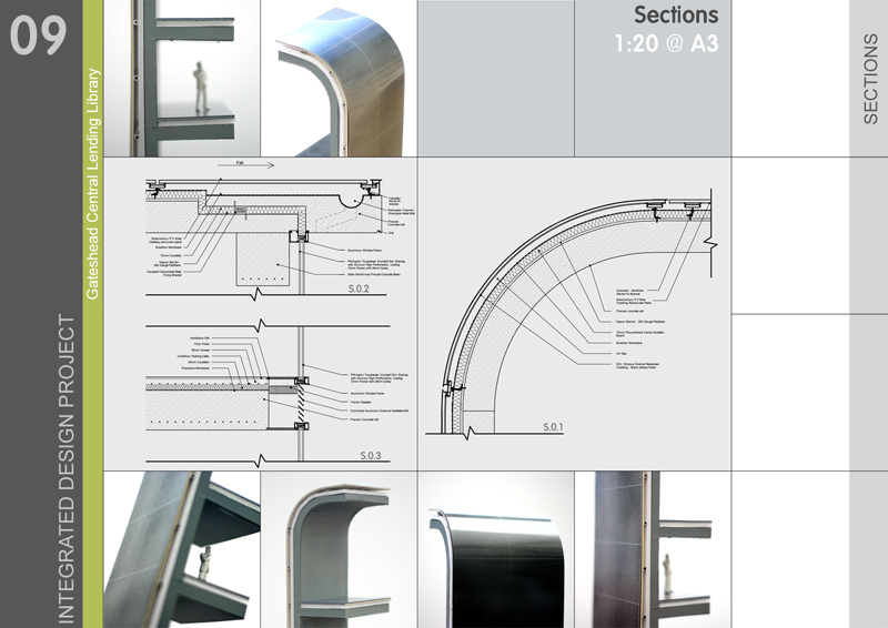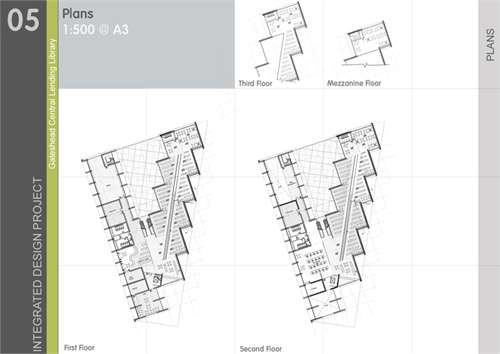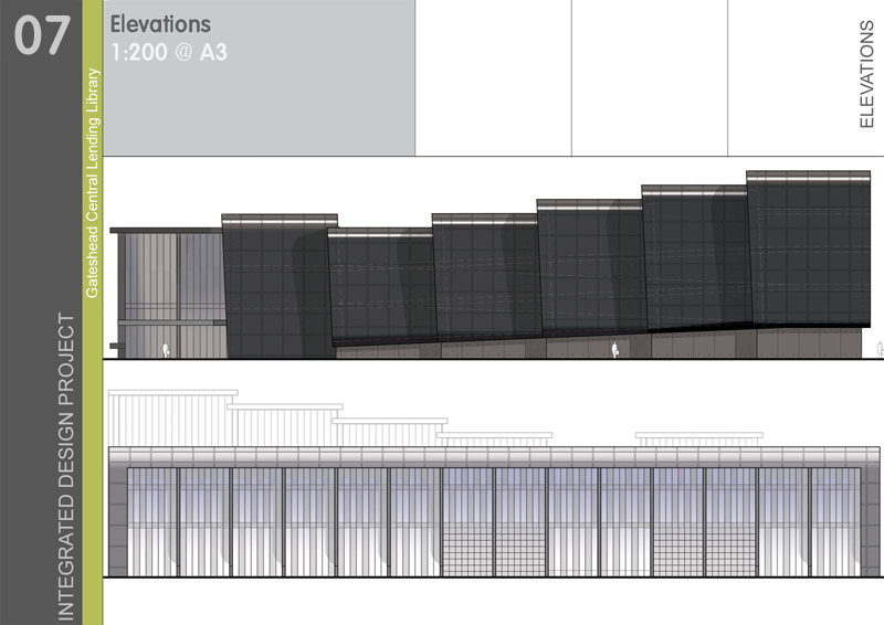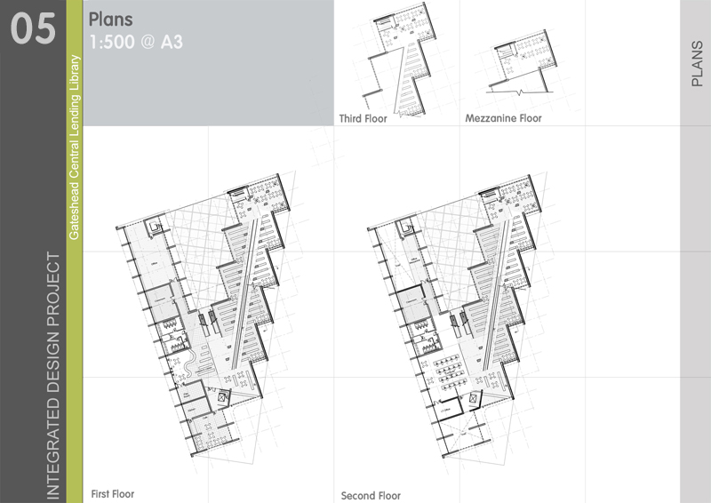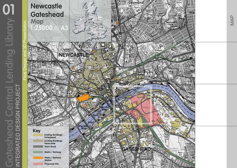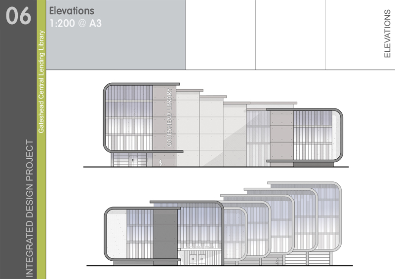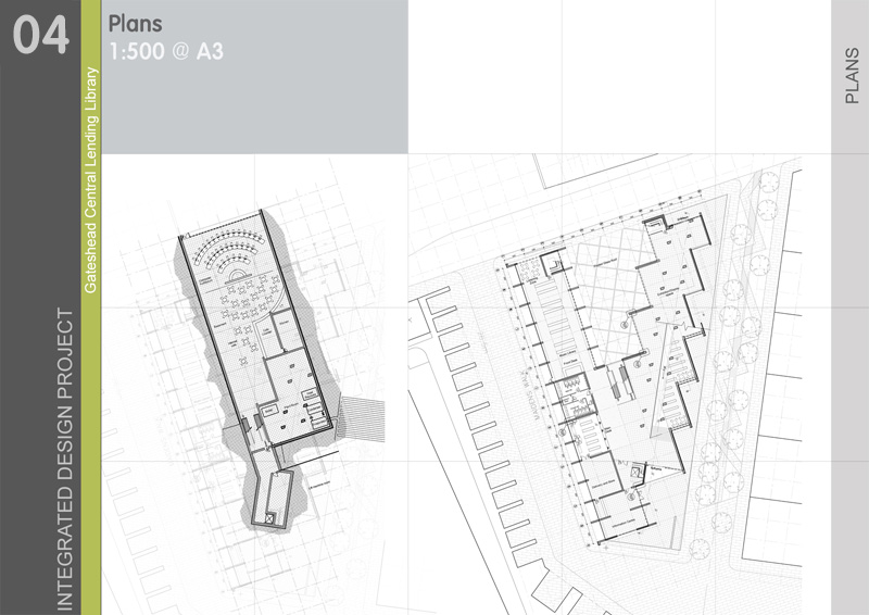 Library, Gateshead Part 2 Project 2006 Simon Cretney De Montfort University | UK Gateshead and Newcastle face one another across the River Tyne, showing rivalry and diversity through history. Today, Newcastle’s grand classical architecture stands in contrast with the rundown 1960s and 70s structures that dominate Gateshead, one of Britain’s poorest areas.Regeneration of Gateshead Quays has produced fine buildings and facilities. However they also display severe contrast and separation from the town and its population. This is addressed in an urban design plan encouraging links between the town and the Quays, providing a facility for the population; a vibrant, fun and technologically advanced library as part of a new urban village. Sited at the meeting of three axis, the proposal works with the Gateshead Sage and the River Tyne to make a place of resolution. The site profile is echoed in the section and the ramped journey through the book stacks is punctuated with reminders of these axis and the location of the building in all its contexts. The language of the exterior has the precision of a musical instrument and evokes an older modernism while looking forward to a new era.