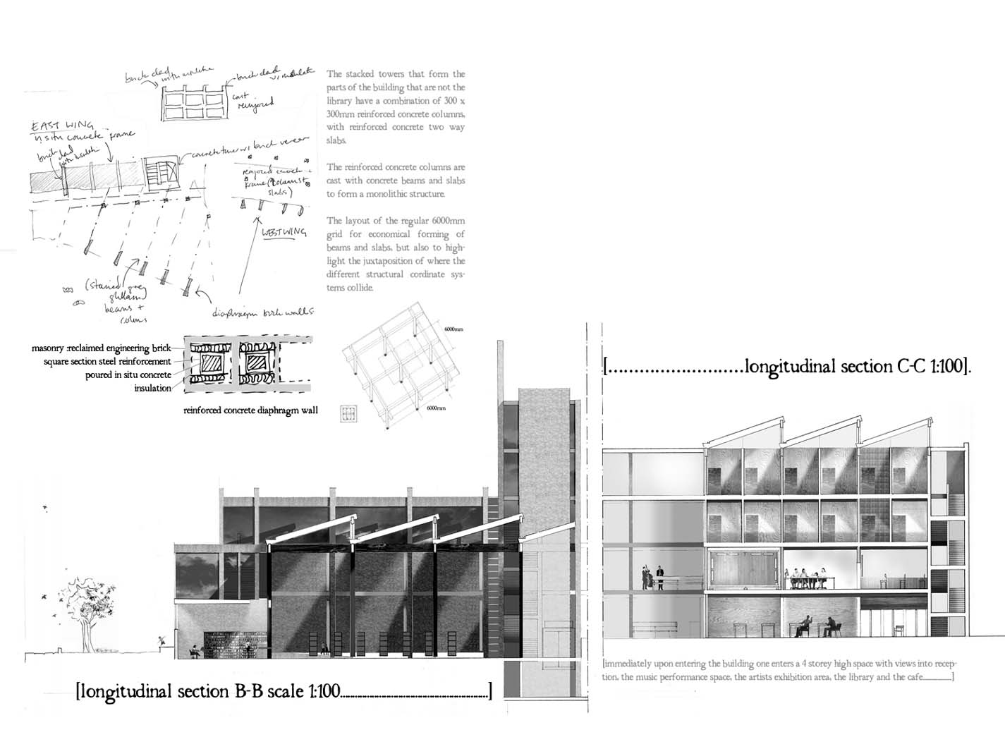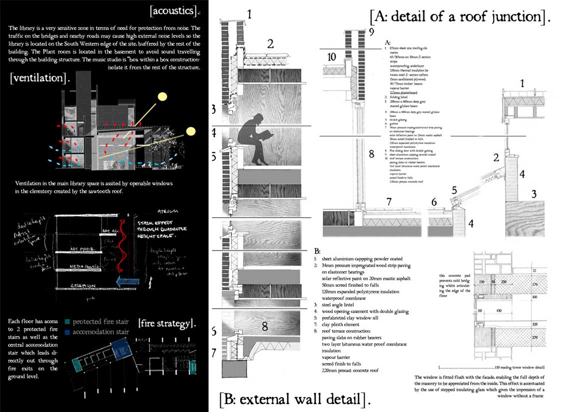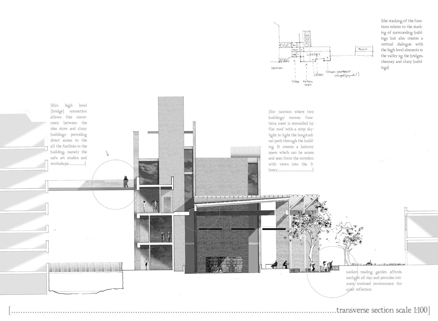 Erin Byrne’s design for an Ideas Store in Ouseburn Valley, Newcastle-upon-Tyne is based on a very close reading of the context using Barthes' theories and applying the semiotics of urban space to the site and design . The result is an amazingly rich, spatially brilliant design which connects the adjacent buildings and successfully emphasizes the verticality of the Valley. Erin’s study of the precedents is intellectually convincing and mature. The inner circulation patterns and spaces are developed in a way which is exceptional and subtle. Concepts in Erin's case are never tied to abstract notions, but based on urban sensitiveness.