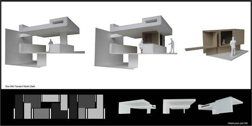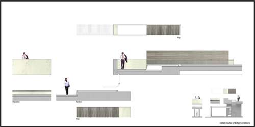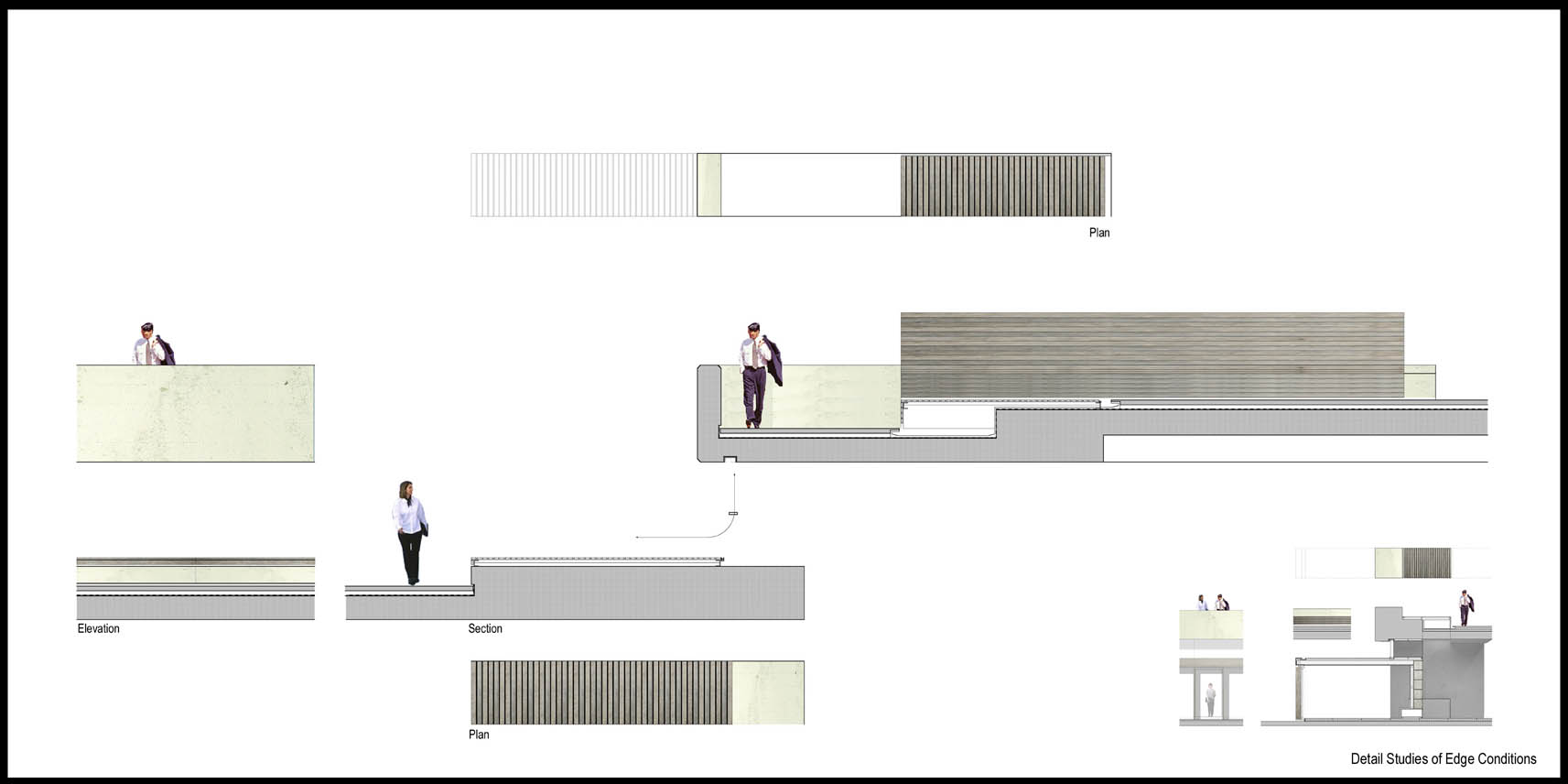 The variety and intensity of uses proposed within the square has resulted in several edge conditions where there is an overlap of public and private space. These were studied in terms of detail and materiality
