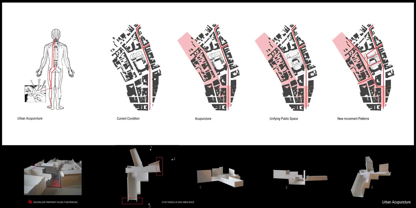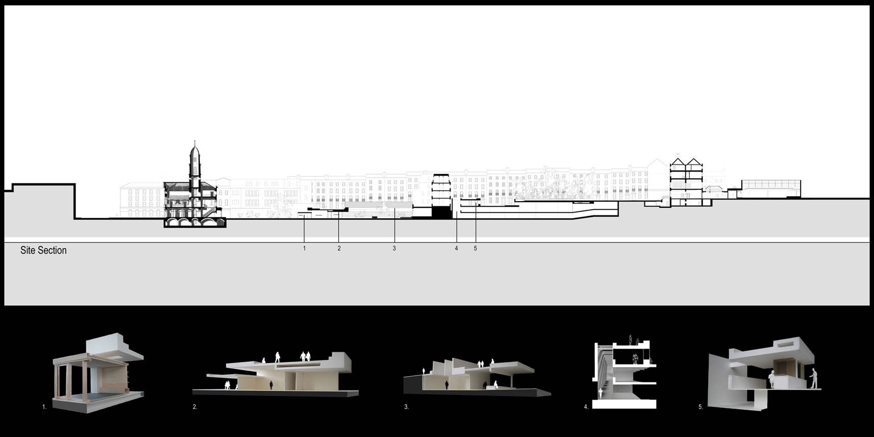 Taking account of site and programme a structure is proposed that is stitched into the urban fabric providing long term stability and coherent civic form, allowing other elements to be more adaptive and ephemeral