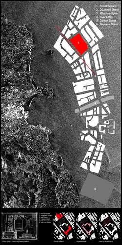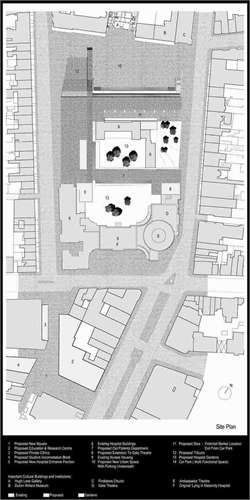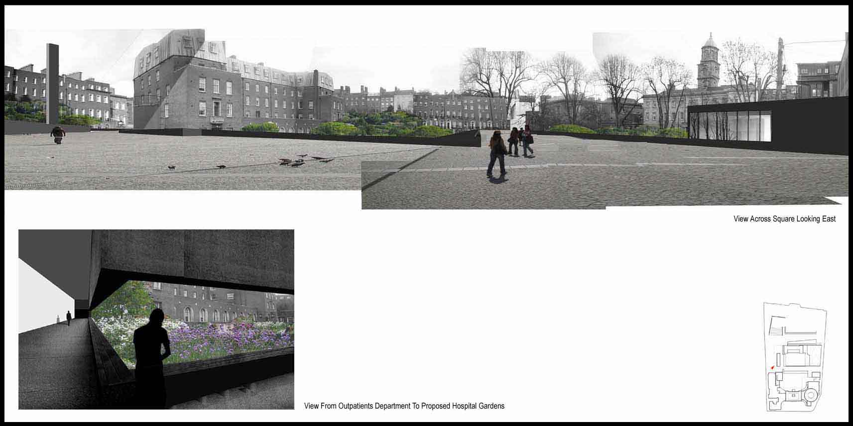 The original thesis diagram is transferred to Parnell Square. Obsolete hospital buildings are removed and replaced by a new structure which acts as artificial ground