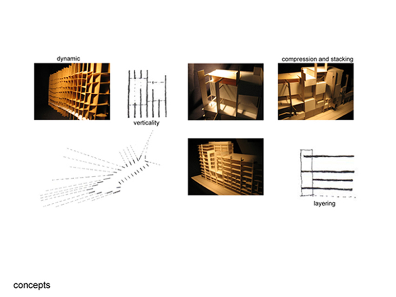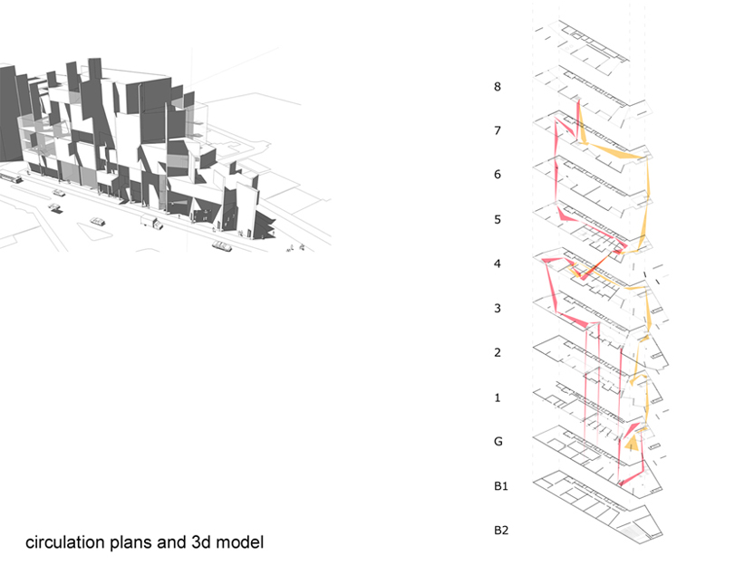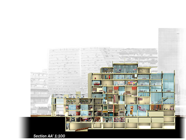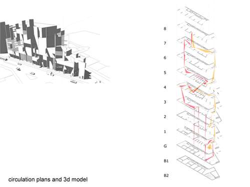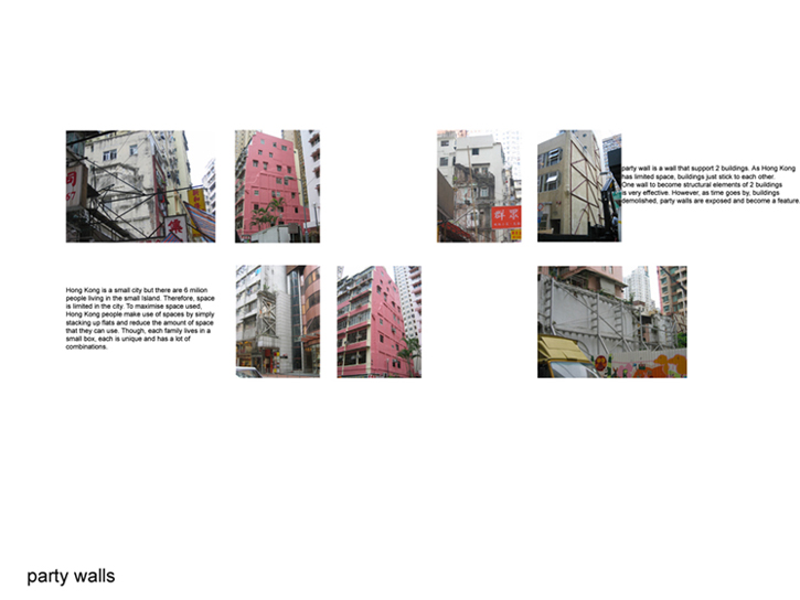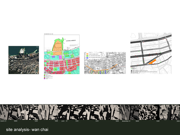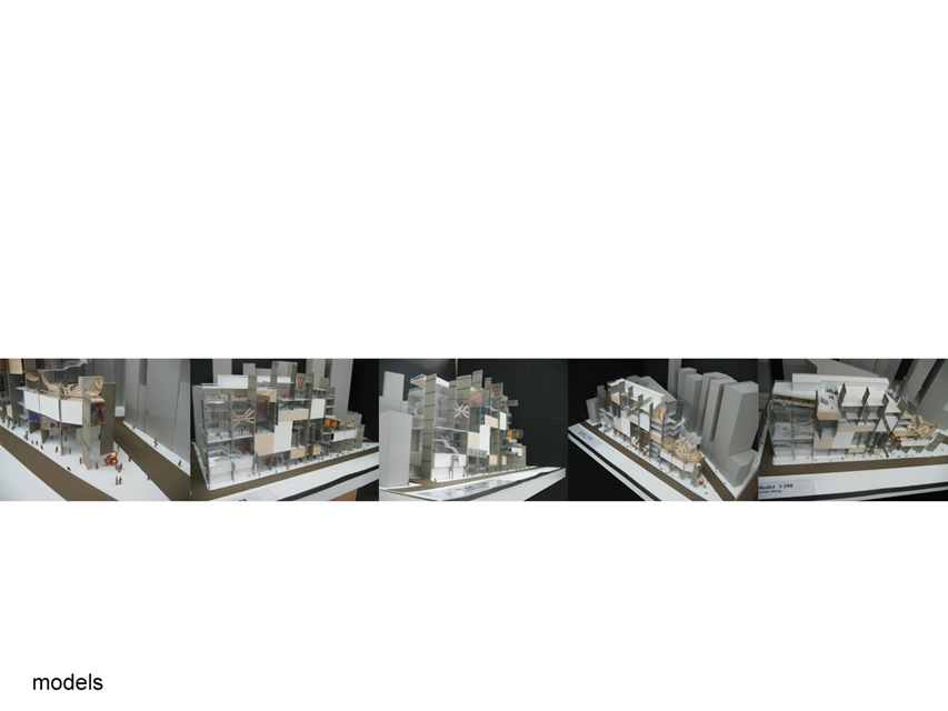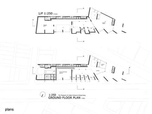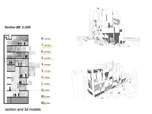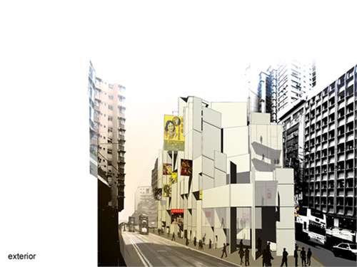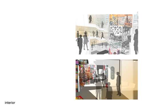 Museum of Hong Kong Culture in Wan Chai Part 1 Project 2006 Wong Wing Kwan Karina University of Hong Kong | China The proposed Culture Museum is situated in a bustling intersection between two main roads in Wan Chai District, a region of intermingling old and new buildings. Though visitors would understand the culture of Hong Kong more by walking on streets and communicating with locals, the Culture Museum serves as a window to the culture of Hong Kong by presenting the past in retrospect and putting the present in its proper context. Hong Kong is densely populated and lacks space. Various activities from commercial to residential can be observed in the same area. This leads to the development of interesting architectural elements e.g. party walls, illegal structures etc. My scheme focuses on party walls which separate such hybrid activities and form a framework of display units in the Museum. The programme asks for a cultural solution in the complex old urban fabric of Hong Kong. The basic causal element employed by the student is the “party wall” that builds up the tenement houses which are the vernacular building type at the start of the colony. The scale and character of the tenement house was adapted and articulated to create the museum spaces, which is a good intention to serve for the background of local cultural exhibits. The triangular corner of the site was also skillfully addressed by the student, again using the “party wall” configuration. The overall result is excellent.