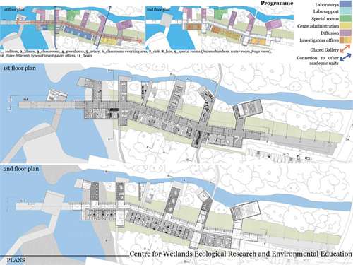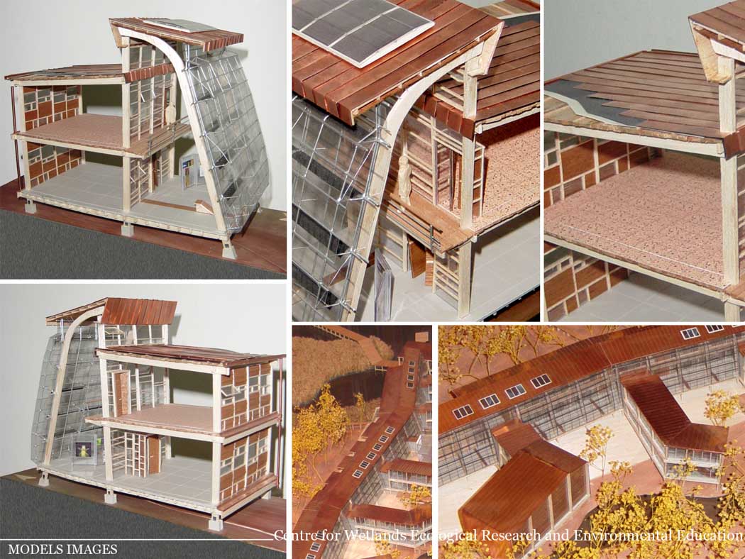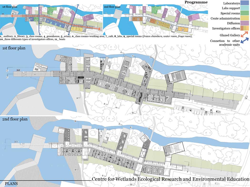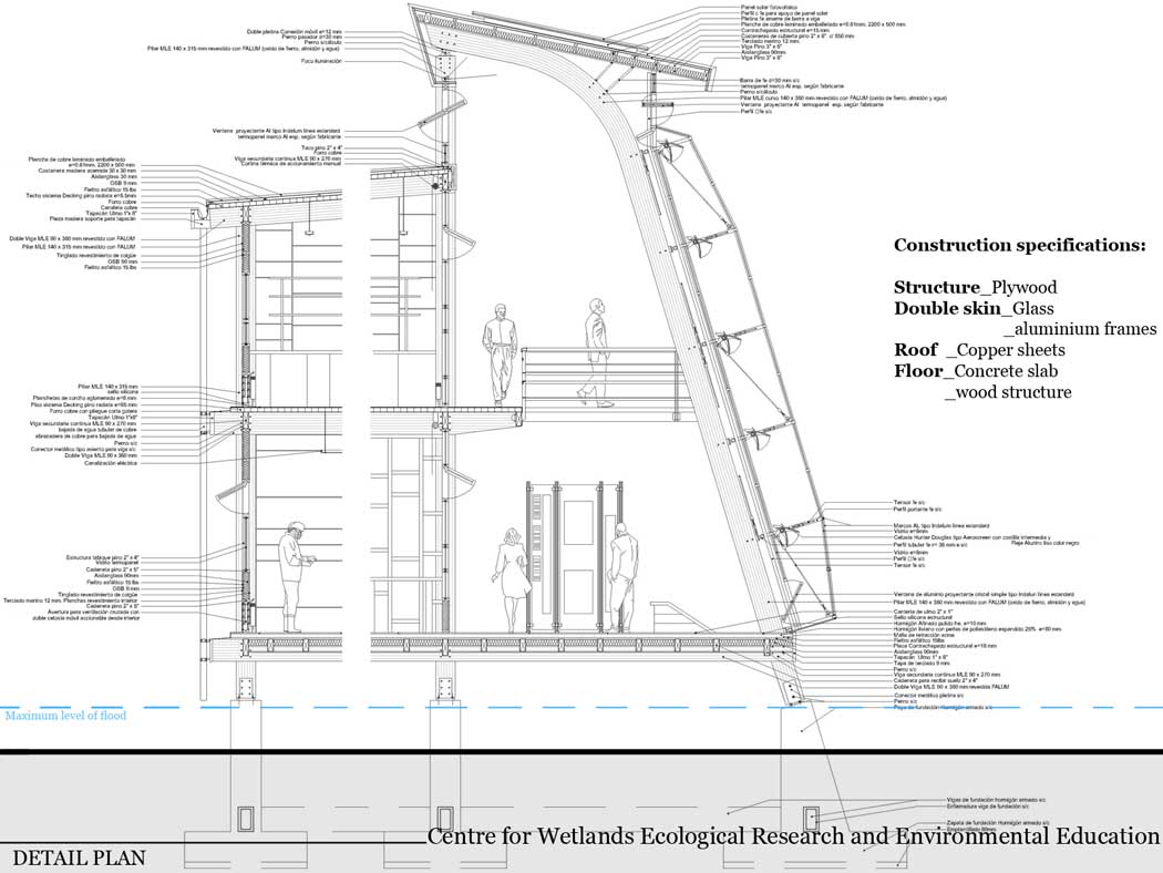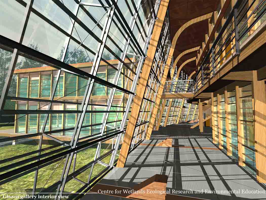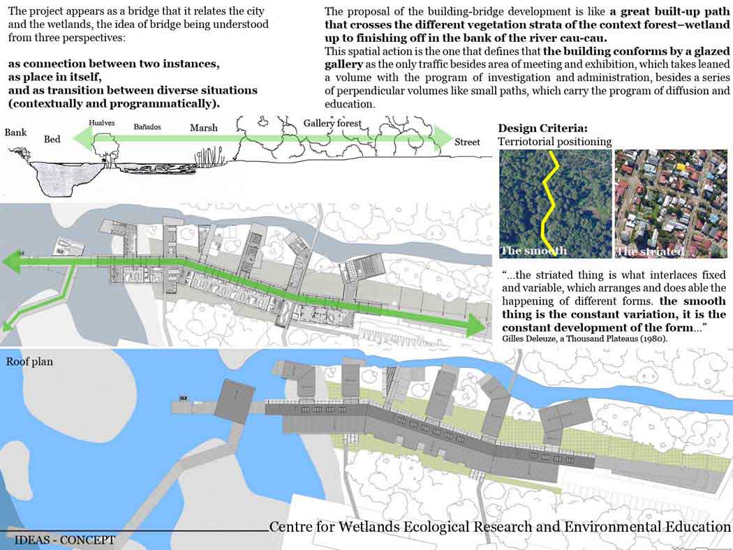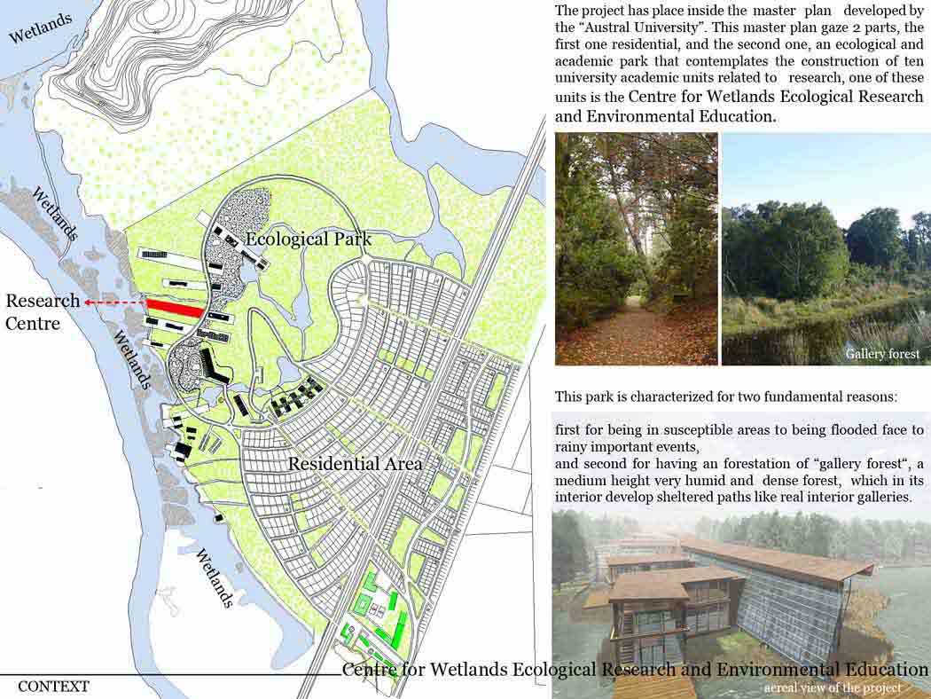 Centre for Wetlands Ecological Research and Environmental Education Part 2 Project 2006 Drago Vodanovic U University of Chile | Chile The project was motivated by the incipient national interest to protect and to investigate natural significant areas, as the wetlands are.Its architectural structure -conceptual, spatial, constructive- implies an important valuation and adjustment to its environment, looking for specific answers for the complex relation nature-edification.The project’s path shape recognizes the different natural strata by it pass and generate the main connector space; the glazed gallery which permits the relation between programmes, users and mainly between architecture and nature. This gallery makes possible the use of natural renewable resources, creating a symbiotic relation between the building and its environment. The project stands out for several reasons; the first one is that it responds to a theme with international importance as the ecological disaster of the Chilean wetlands. That’s why a building of such characteristics supplies needs that the student discovered and designed in a remarkable visionary way.The proposal has a very interesting way to be placed in the landscape, respecting its particular characteristics as well as taking advantage of its potential; which not only stands out in the spatial-form concept, but also in the intelligent development of the constructive design, going further by creating echo-conscious technological systems.