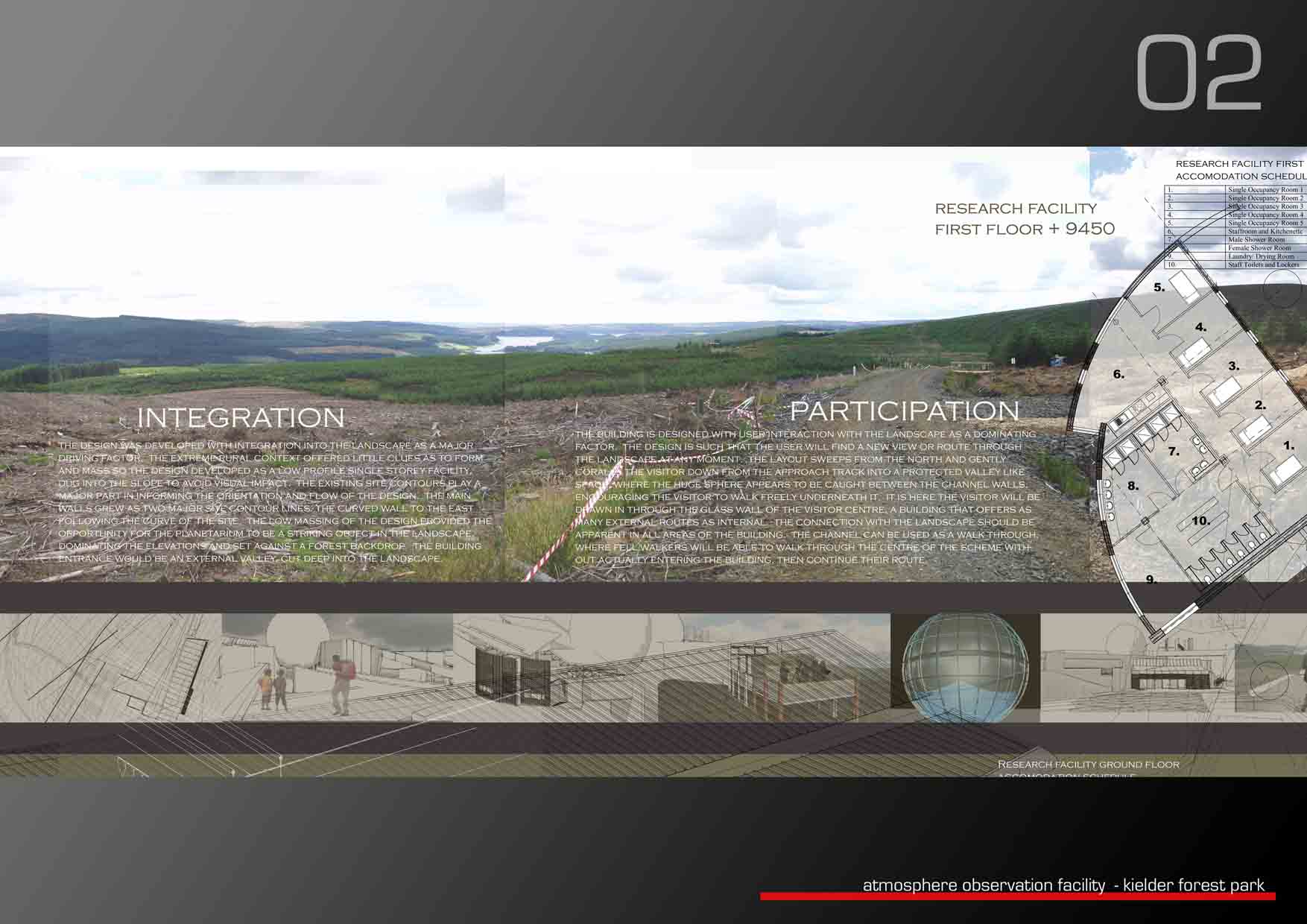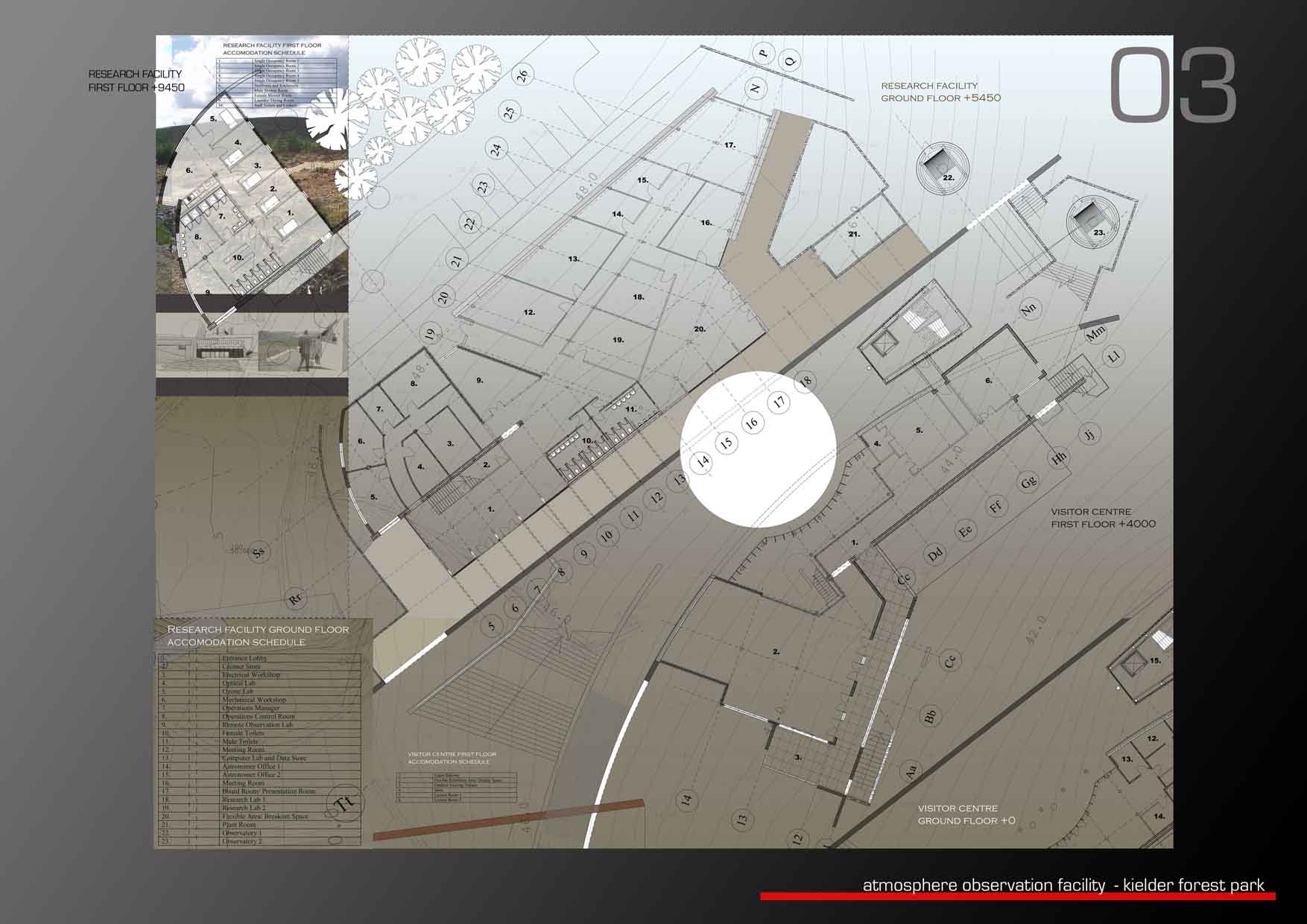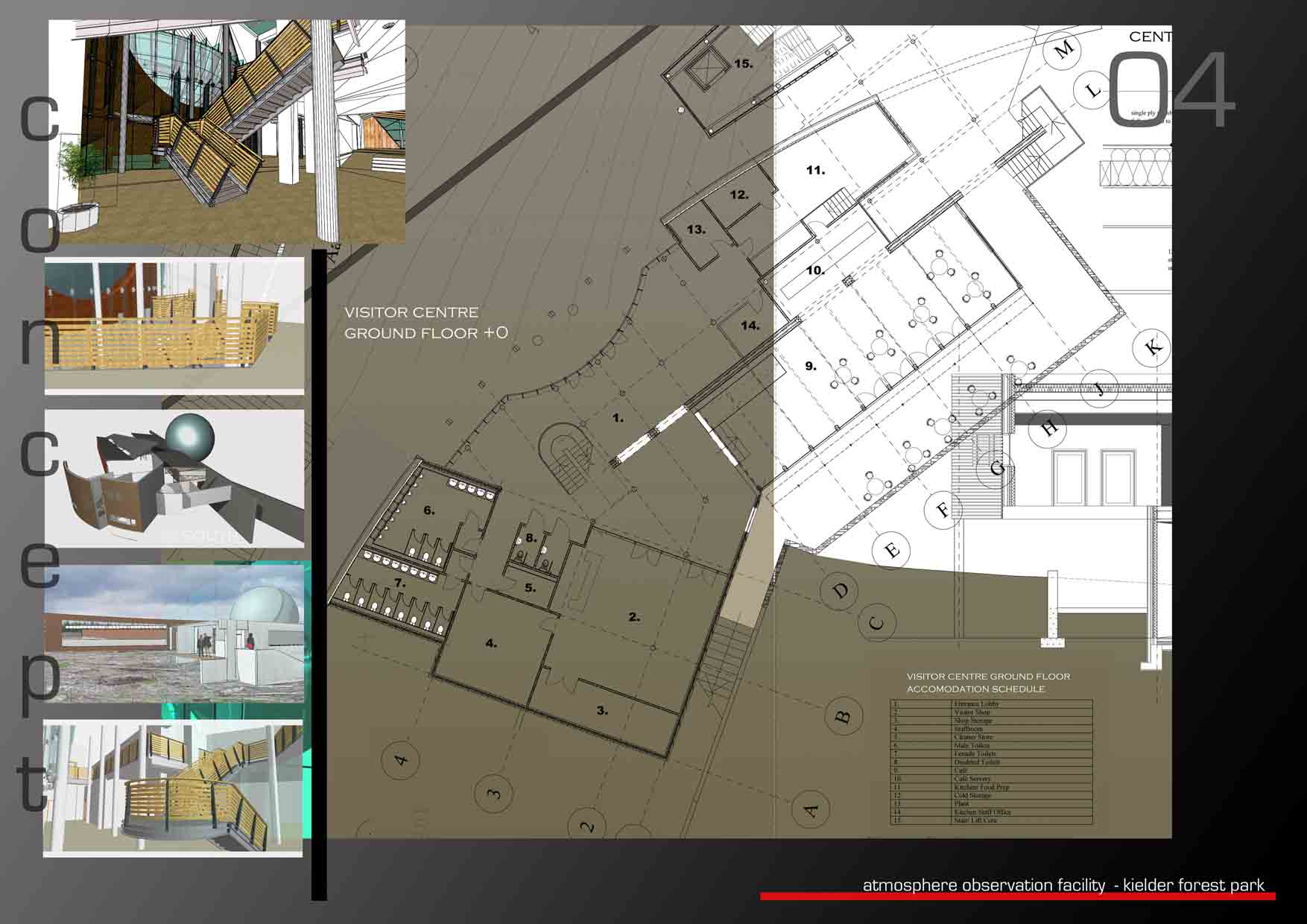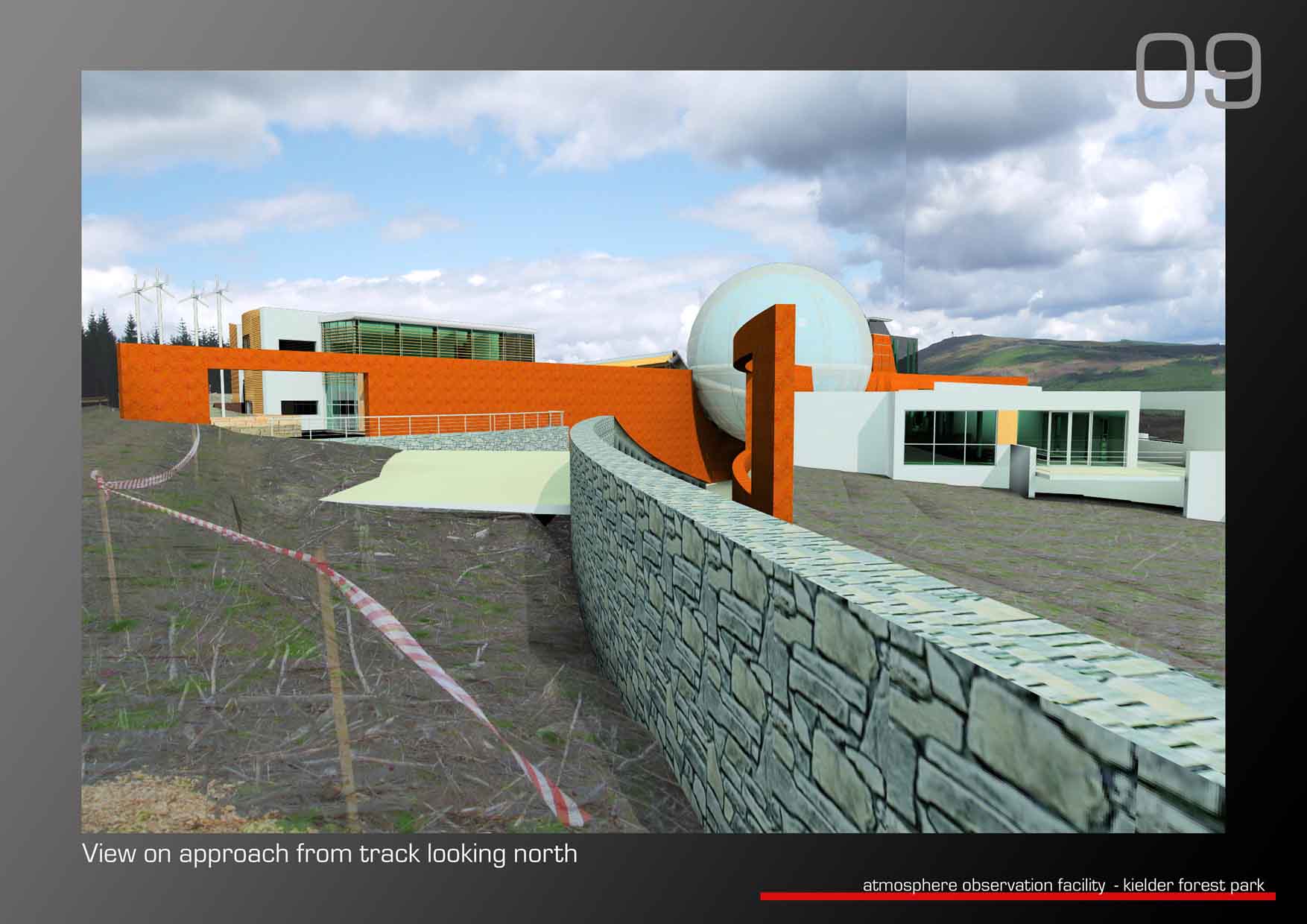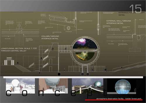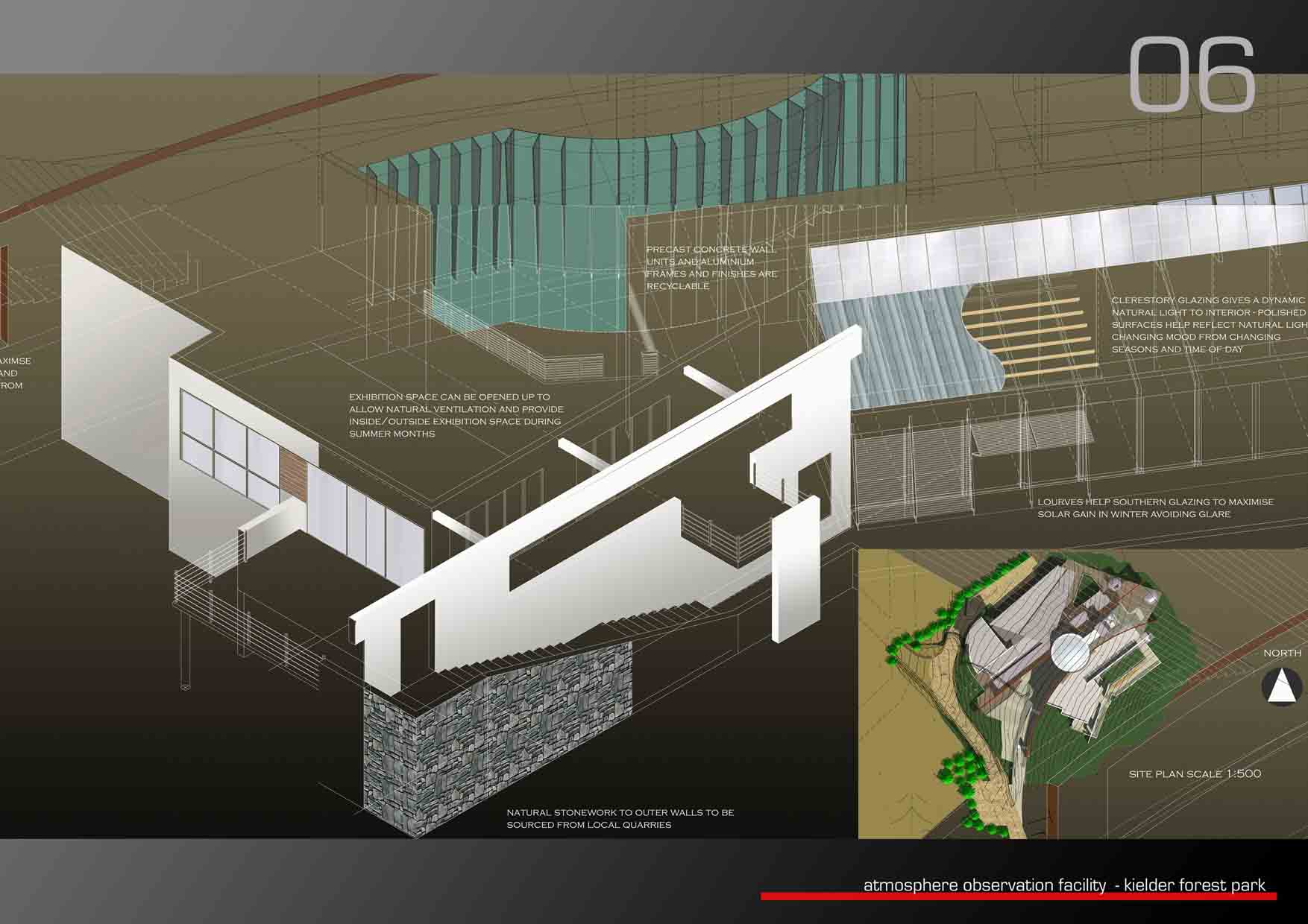 Atmosphere & Climate Research Centre, Keilder Part 2 Project 2006 Kevin Fraser University of Huddersfield | UK The Atmospheric Observation Facility is designed to explore new relationships between architecture and the landscape, as well as being a base to educate, inform and analyse the effects of our changing climate. Split into two distinct uses, the buildings sweeping central ‘chasm’ flows into and out of the hillside, encouraging user movement through the scheme. The central giant sphere, a hub for education, becomes the focal point against the forest backdrop; the intense space created beneath marks the point of entry into the visitor spaces. The architecture mediates between new public space and existing rural landscape; the relationship between internal and external space is constantly explored as one circulates through the building. Melding Architecture and Landscape, forged from furrowed lines, and revealing objects as celebratory archaeological finds. The design distincts the realms of research from the visitor facilities, organised along a architectural promenade heightening the experience of discovery of within its remote location.Kevin's work is comprehensively researched, highly sophisticated, contextual, narrative, and both strident and sensitive. Kevin achieved a Diploma in Architecture with Distinction, being Commended in both his Dissertation and Design Thesis work.