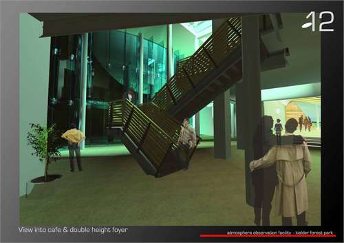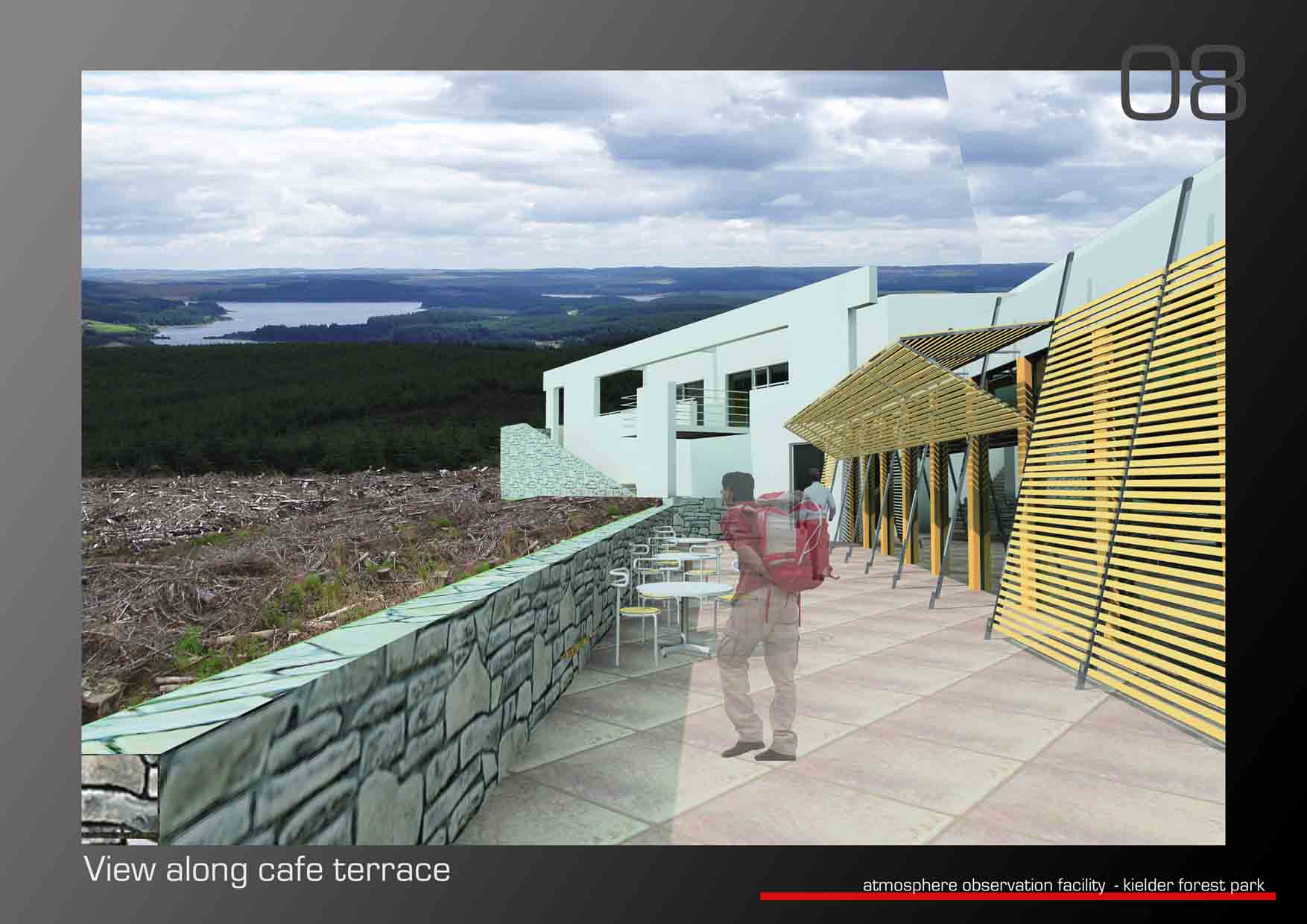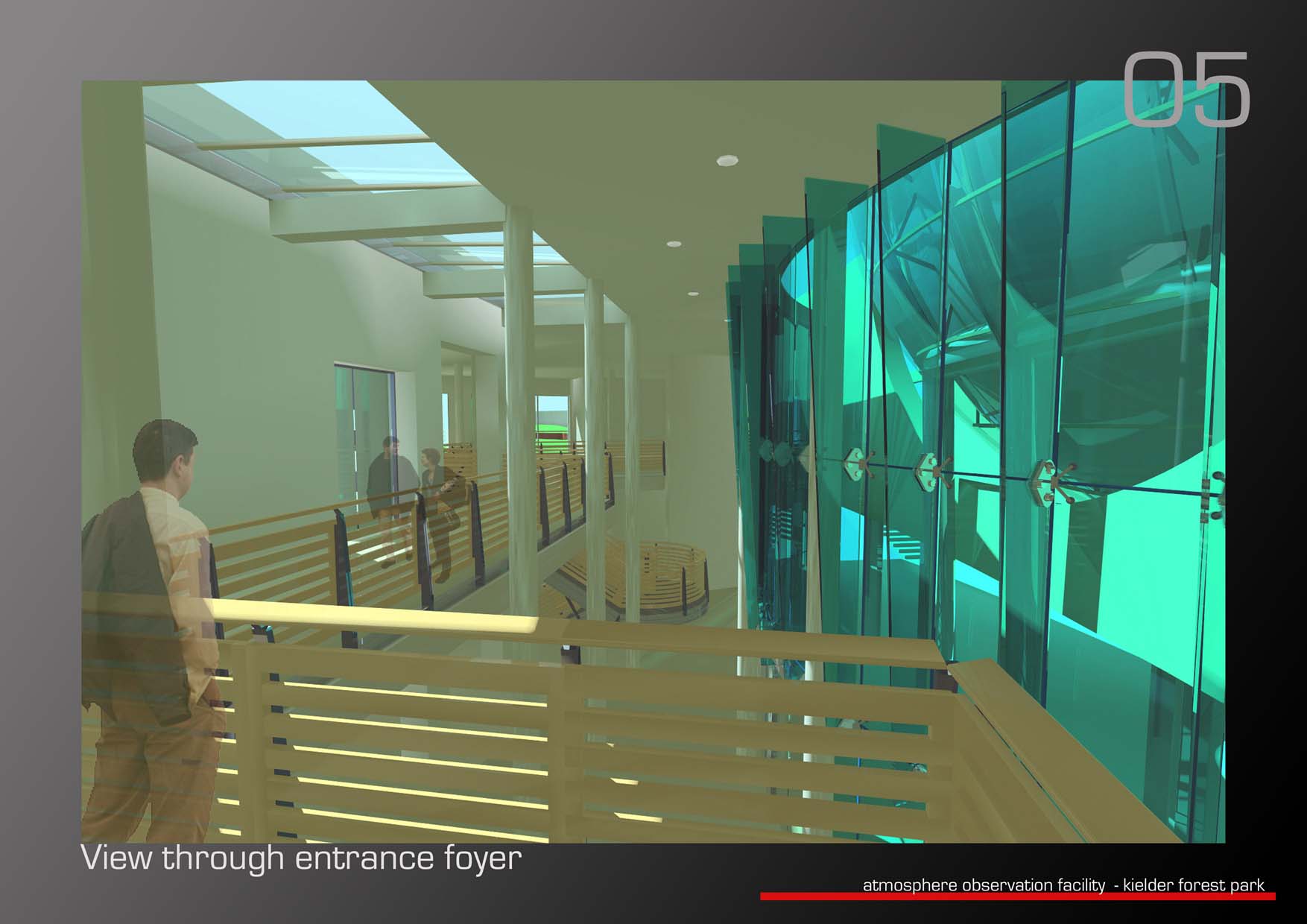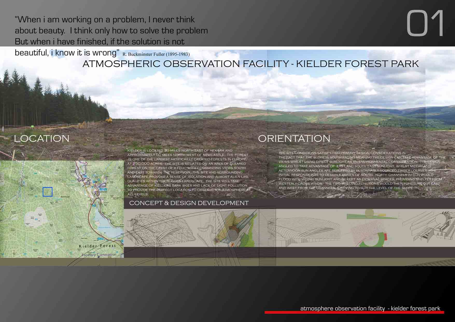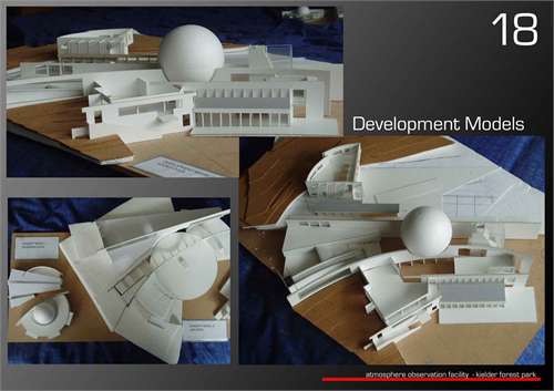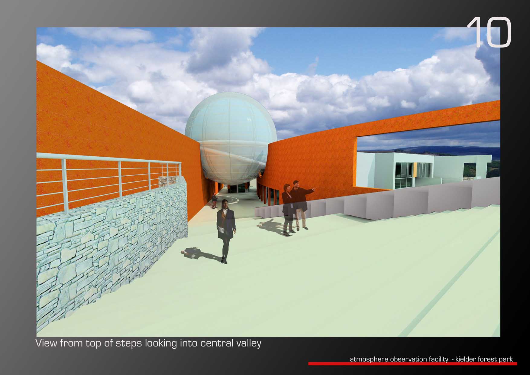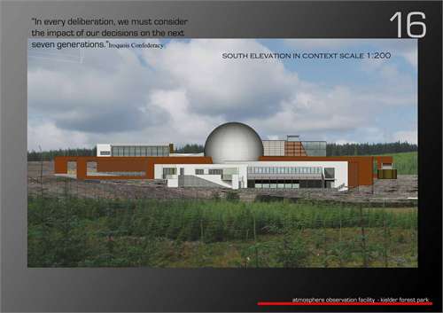 Atmosphere & Climate Research Centre, Keilder Part 2 Project 2006 Kevin Fraser University of Huddersfield | UK The Atmospheric Observation Facility is designed to explore new relationships between architecture and the landscape, as well as being a base to educate, inform and analyse the effects of our changing climate. Split into two distinct uses, the buildings sweeping central ‘chasm’ flows into and out of the hillside, encouraging user movement through the scheme. The central giant sphere, a hub for education, becomes the focal point against the forest backdrop; the intense space created beneath marks the point of entry into the visitor spaces. The architecture mediates between new public space and existing rural landscape; the relationship between internal and external space is constantly explored as one circulates through the building. Melding Architecture and Landscape, forged from furrowed lines, and revealing objects as celebratory archaeological finds. The design distincts the realms of research from the visitor facilities, organised along a architectural promenade heightening the experience of discovery of within its remote location.Kevin's work is comprehensively researched, highly sophisticated, contextual, narrative, and both strident and sensitive. Kevin achieved a Diploma in Architecture with Distinction, being Commended in both his Dissertation and Design Thesis work.