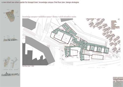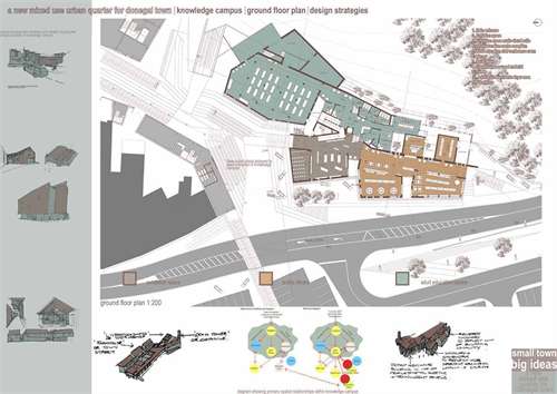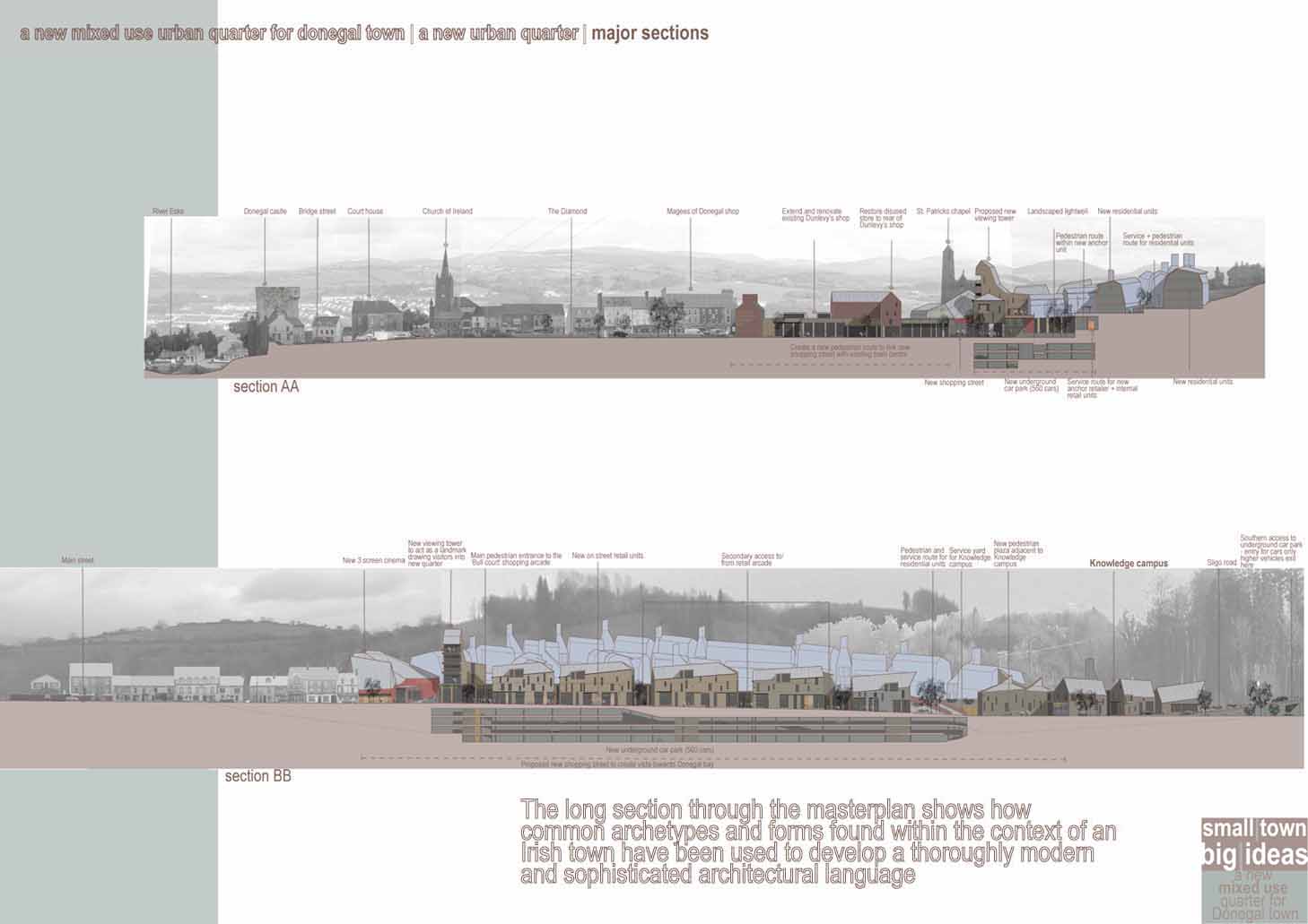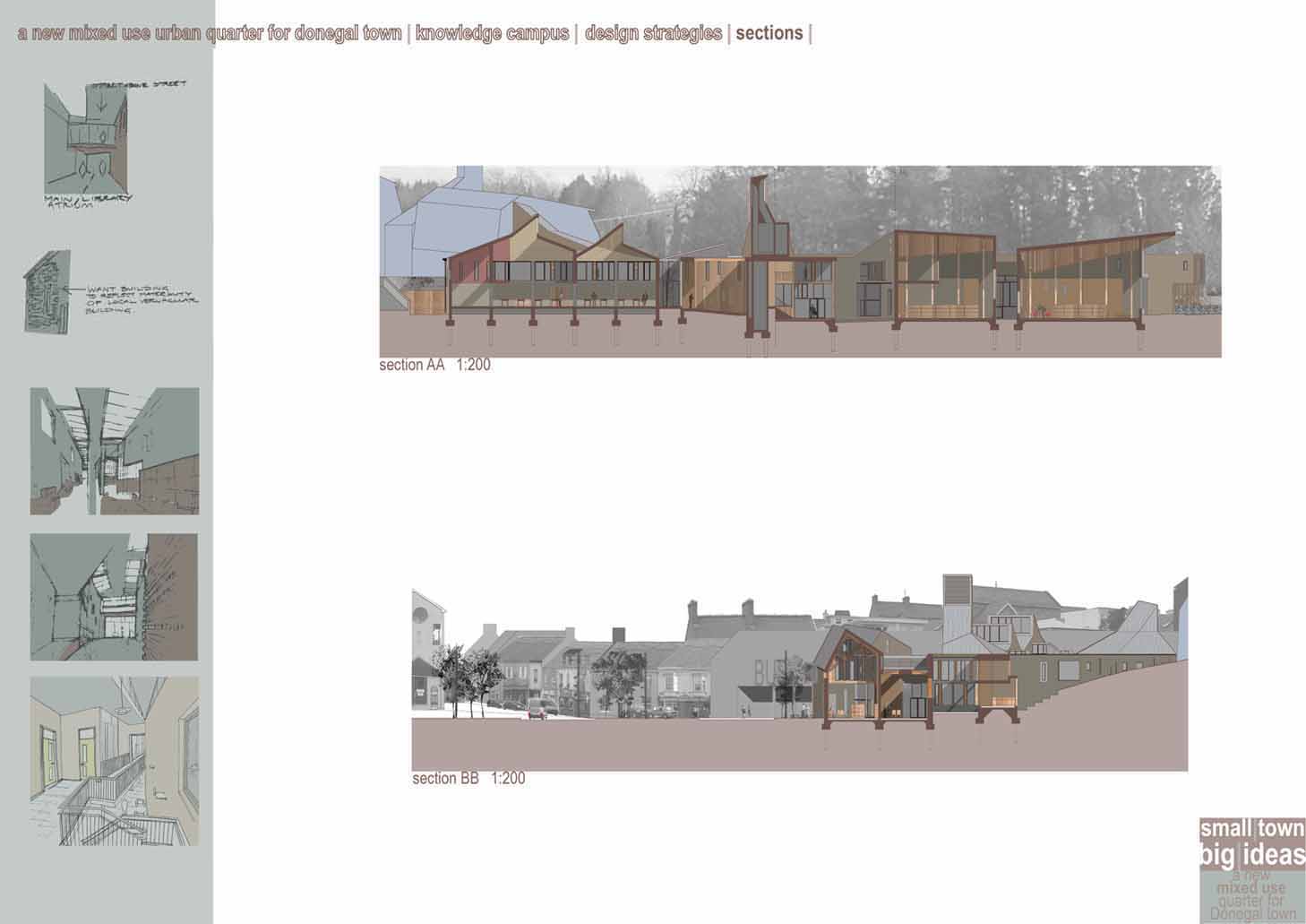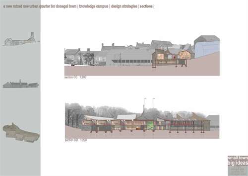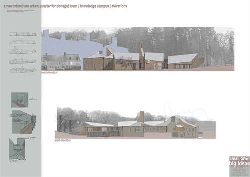 The Knowledge campus - Selected elevations showing how new dynamic and modern forms correlate with the existing traditional fabric of an Irish town