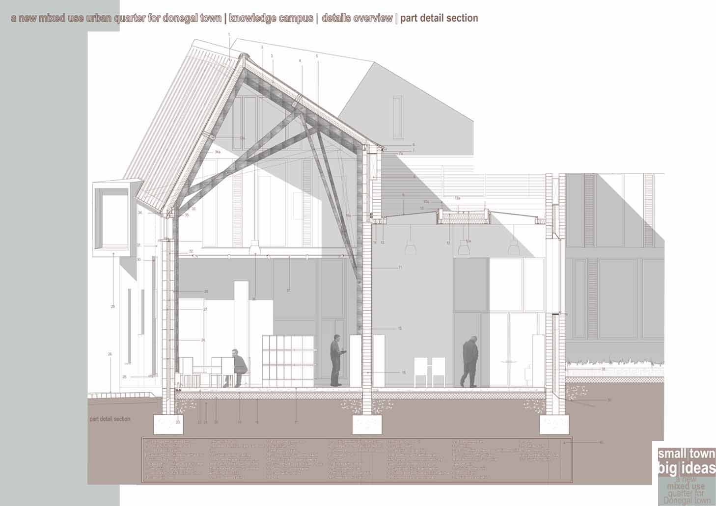 The Knowledge campus - Detailed partial section through library showing internal timber truss and abstract 'pitched roof' form of proposal