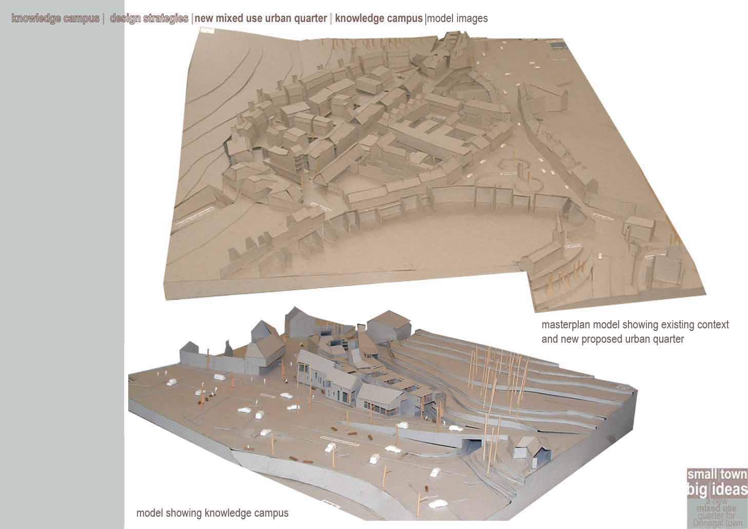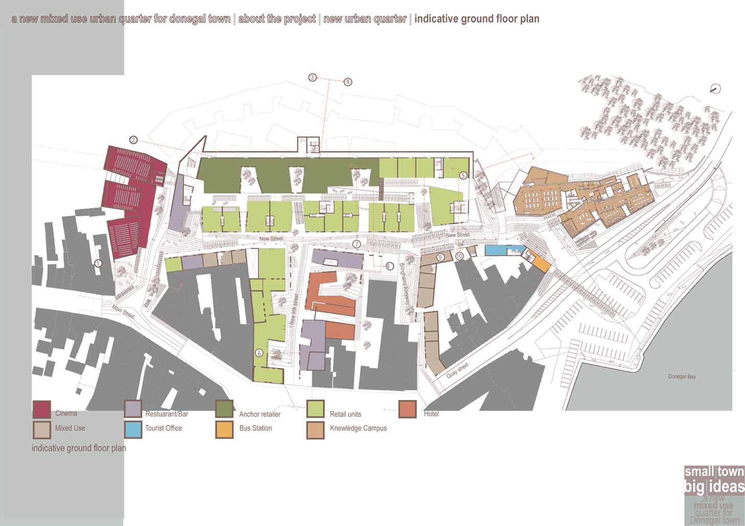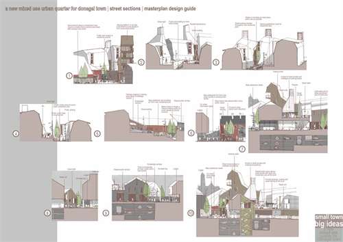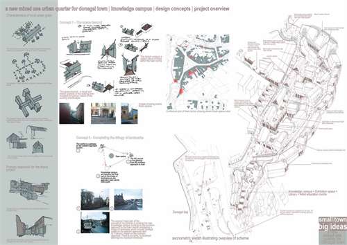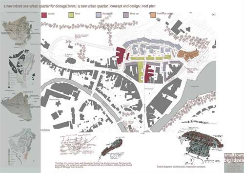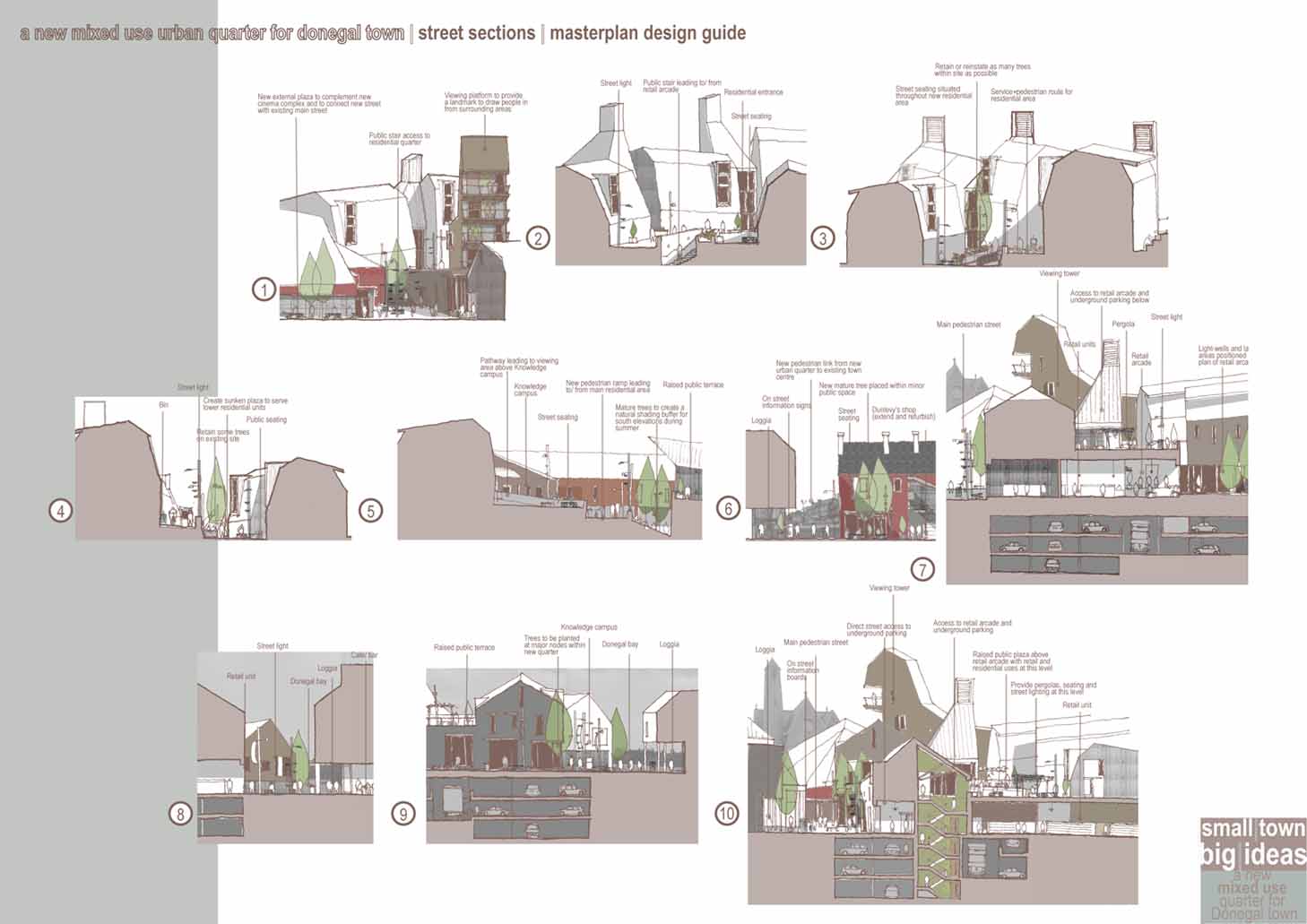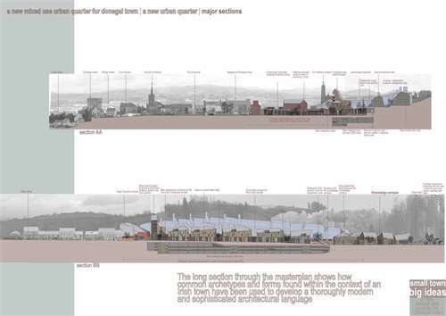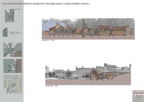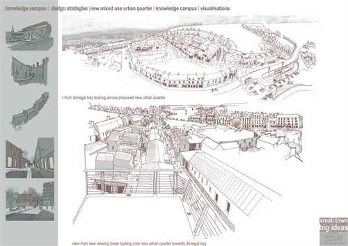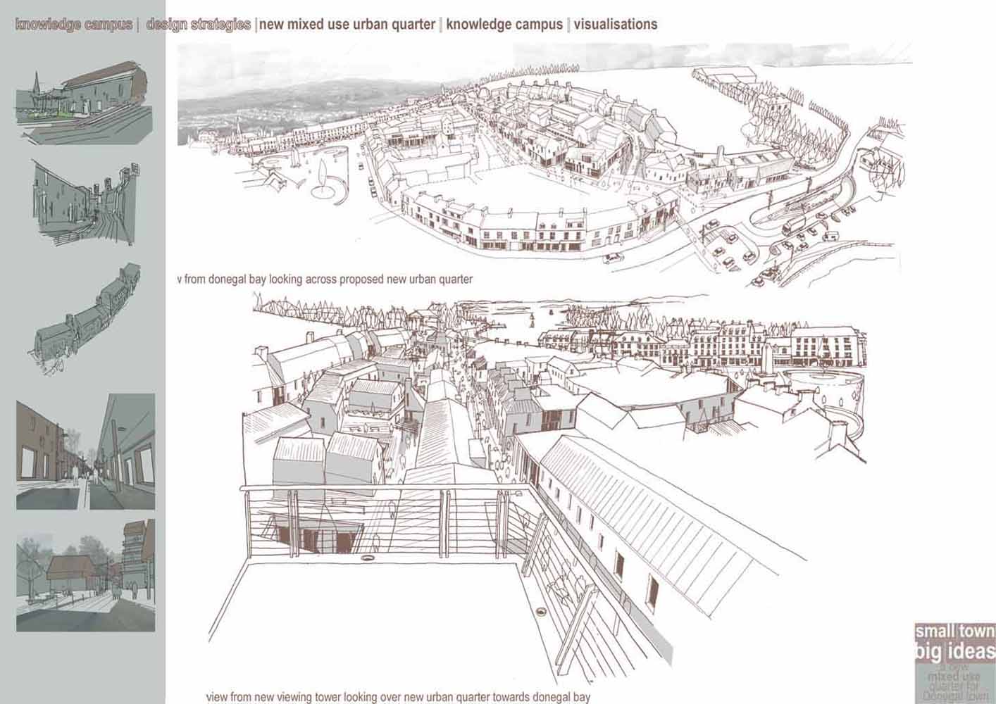 New urban quarter - Sketches showing overview of proposal and the sympathetic massing of the new buildings in relation to historic centre of Donegal