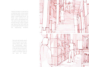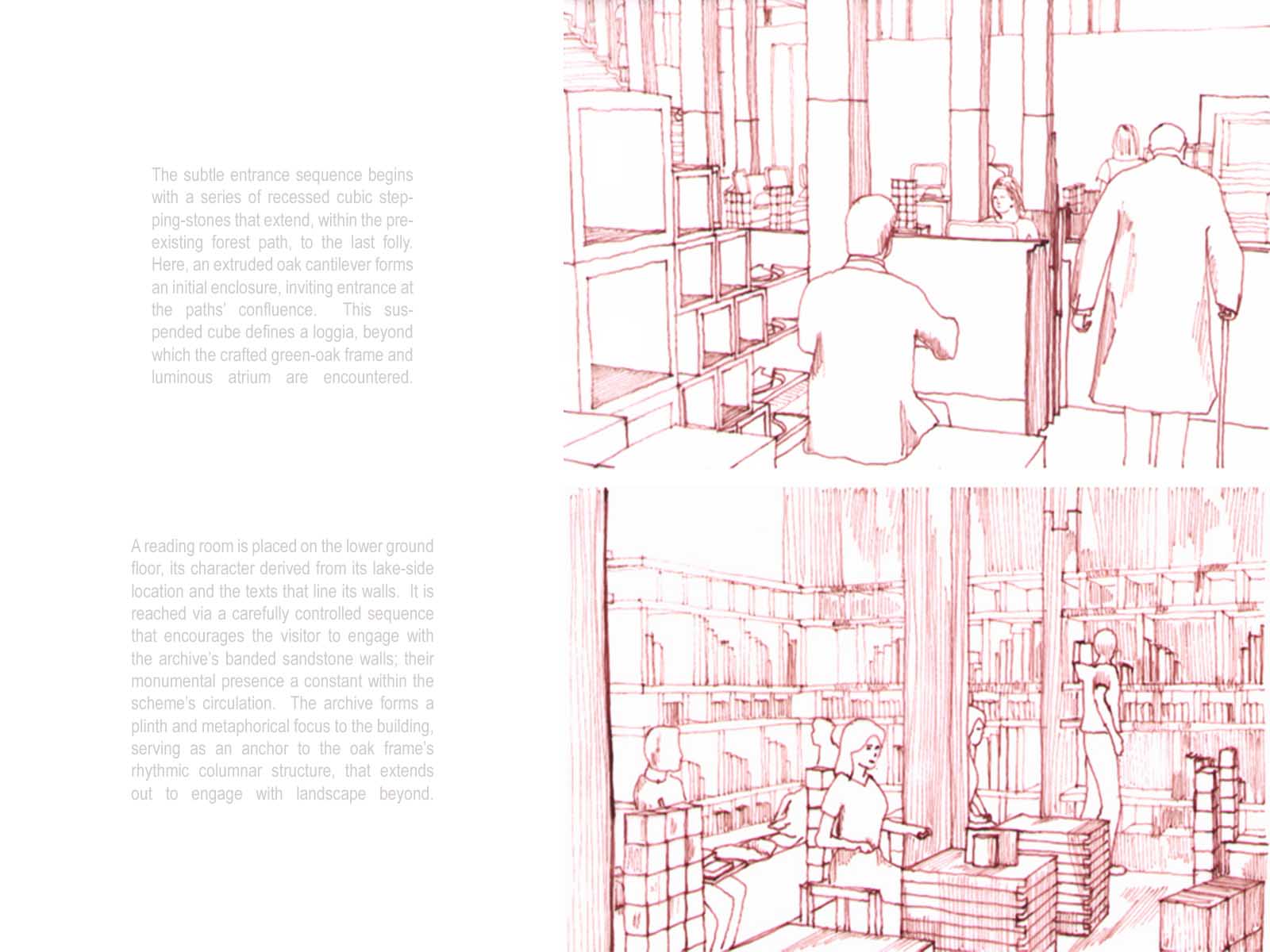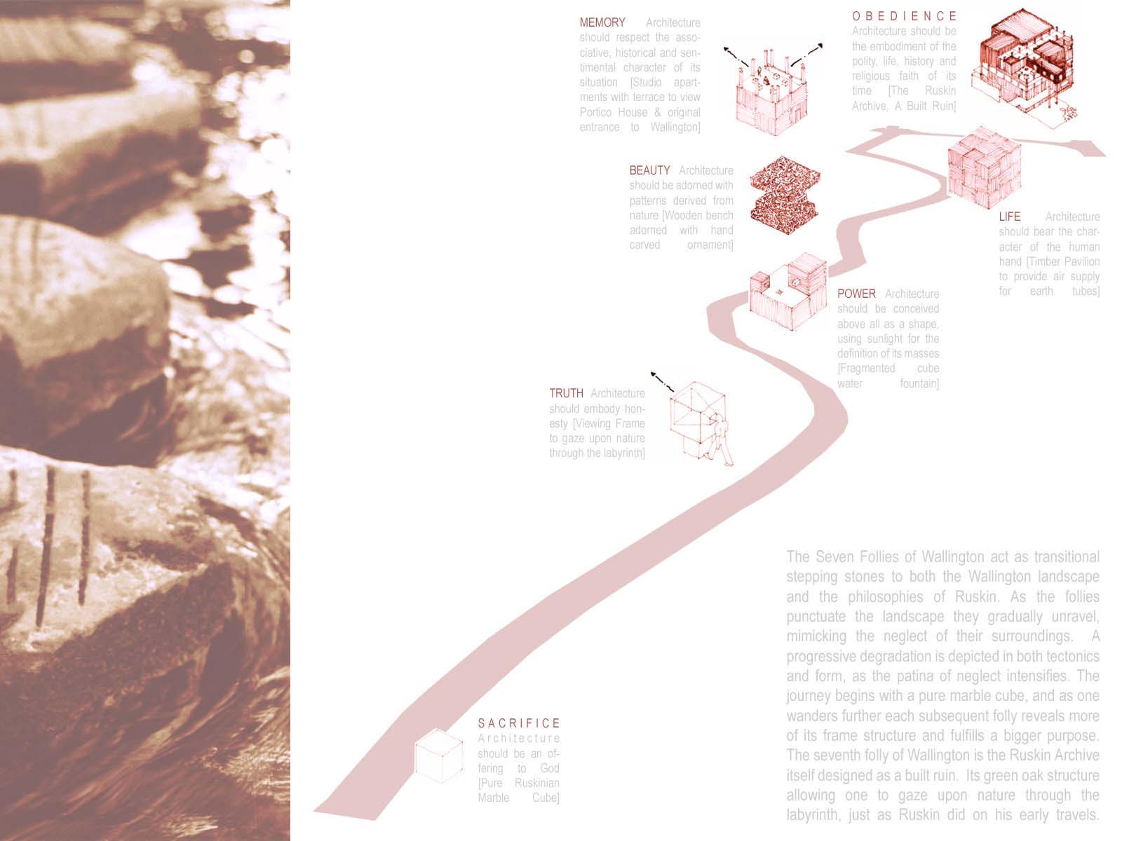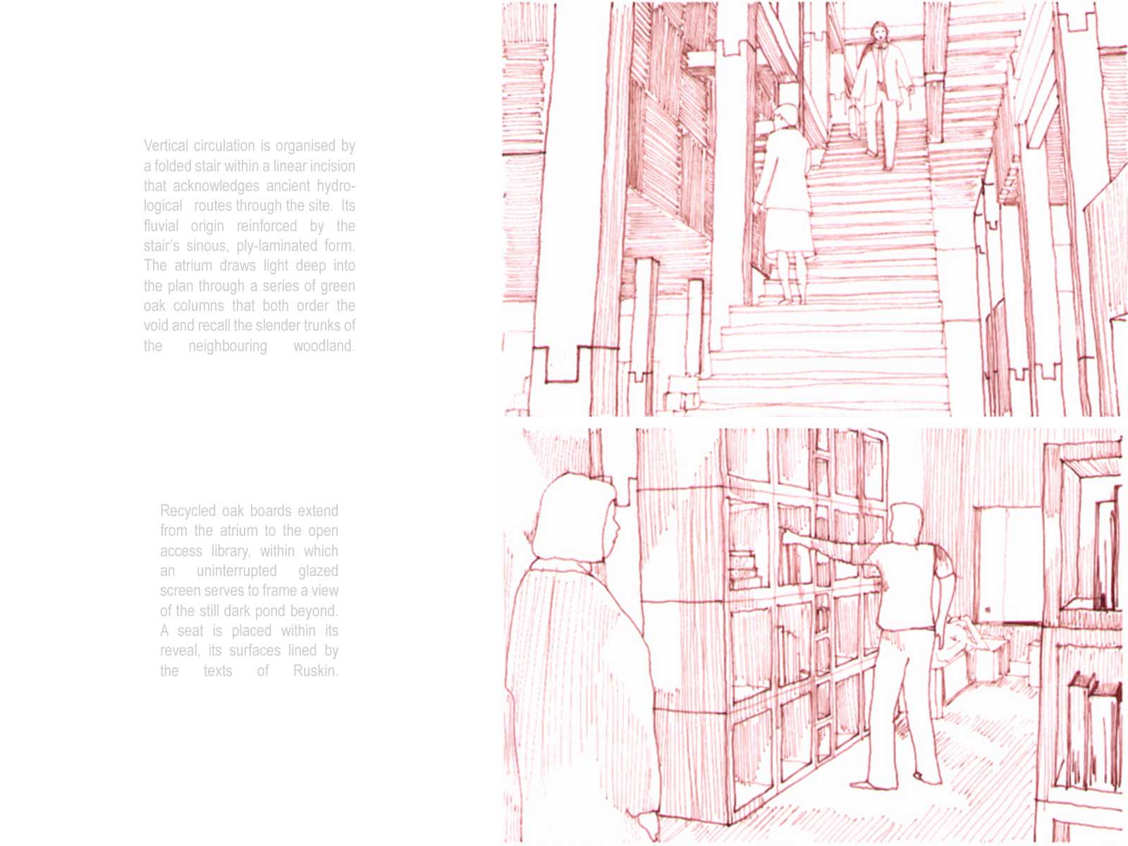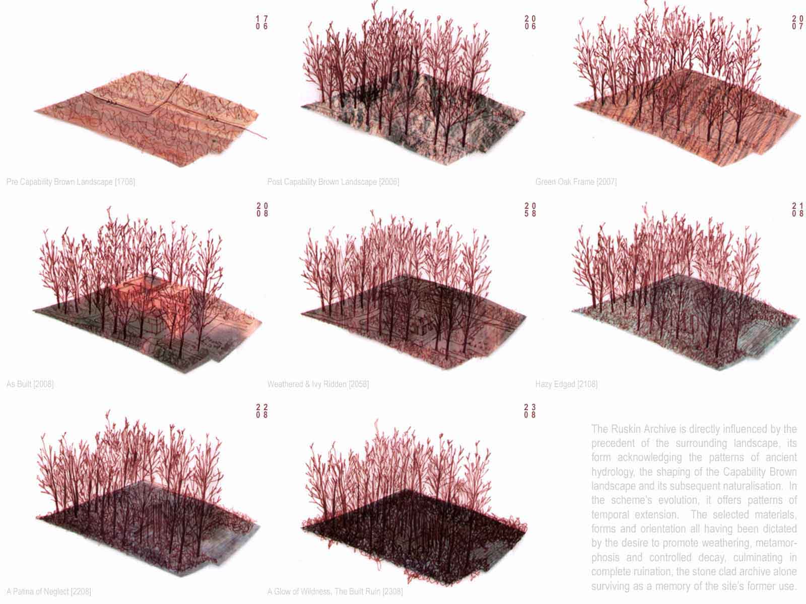 The Seven Follies of Wallington - Ruskin Archive Part 1 Project 2007 Elizabeth Makinson Newcastle University | UK The Seven Follies of Wallington act as transitional stepping-stones to the Wallington landscape and to the philosophies of John Ruskin; they portray the evolution of the cube as it fragments, mimicking the neglect of its landscape. As the follies punctuate the landscape they gradually unravel, exposing more of their deepening textures and complexities. The material palette chosen reveals through weathering the temporality of nature. The detailing, orientation and choice of cladding is designed to finally disintegrate into a built ruin, the stone clad archive monumentalised, by a developing patina of neglect… The project sought to explore the powerful themes of Metaphor and Material in John Ruskin’s work and thought: it proposed an archive to house the vast collection of Ruskin’s drawings, paintings, daguerrotypes and library. The evocative setting was Wallington House in the Northumberland countryside - a place with strong Ruskinian associations. This scheme resonantly imbricated readings of Ruskin and the English landscape, adopting for example, the themes of fragment and folly (reflecting Ruskin’s fragmentary vision) to realise an eroded lakeside cubic pavilion, sustainably crafted in English oak, and finely represented with a concern for freehand draughtsmanship analogous to Ruskin’s own.