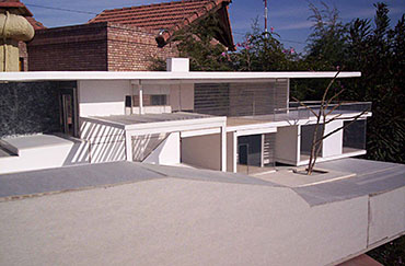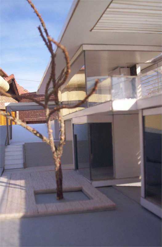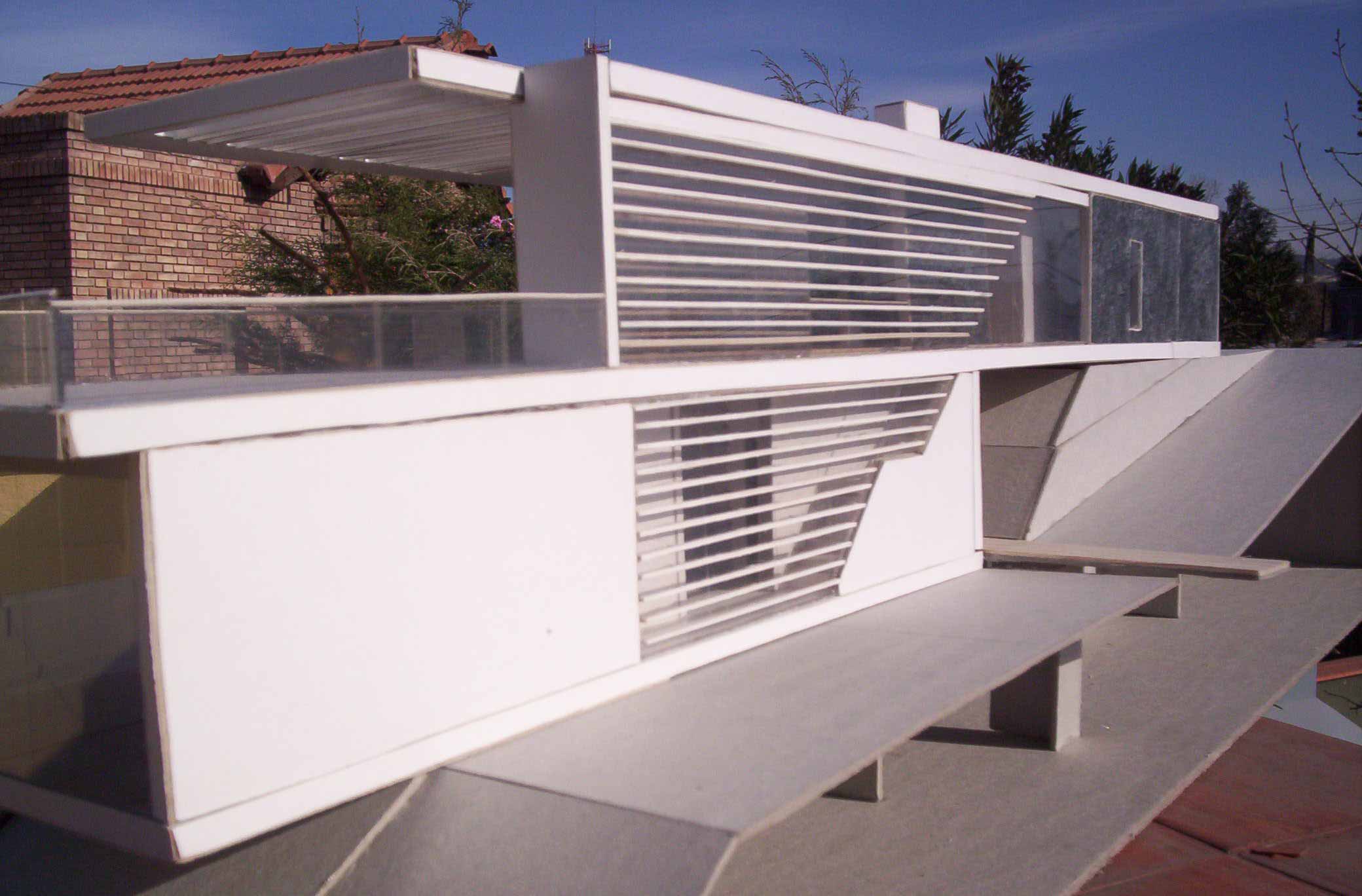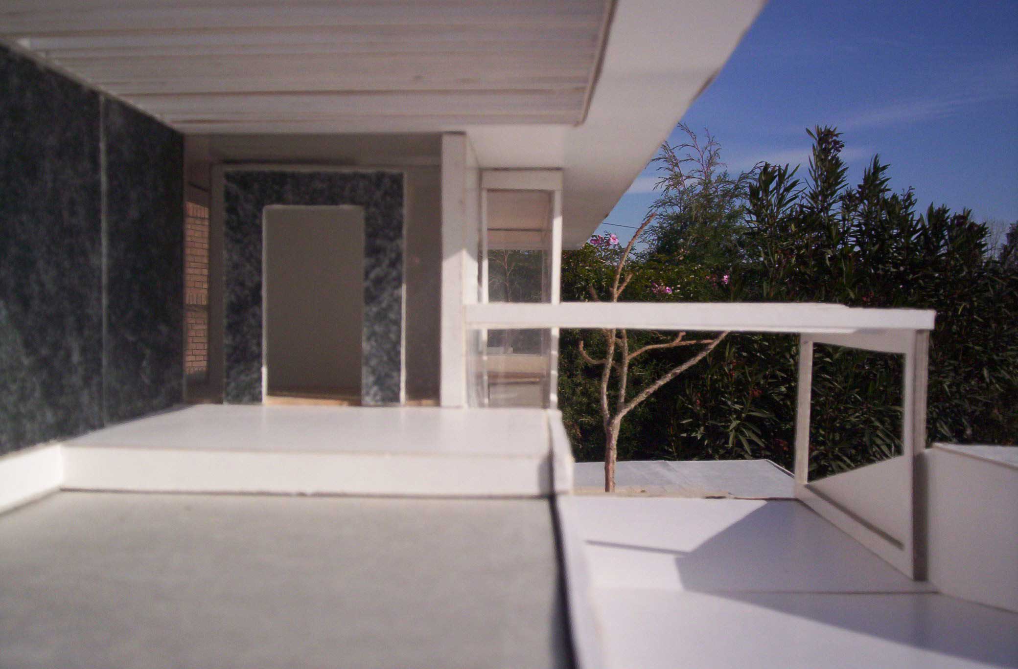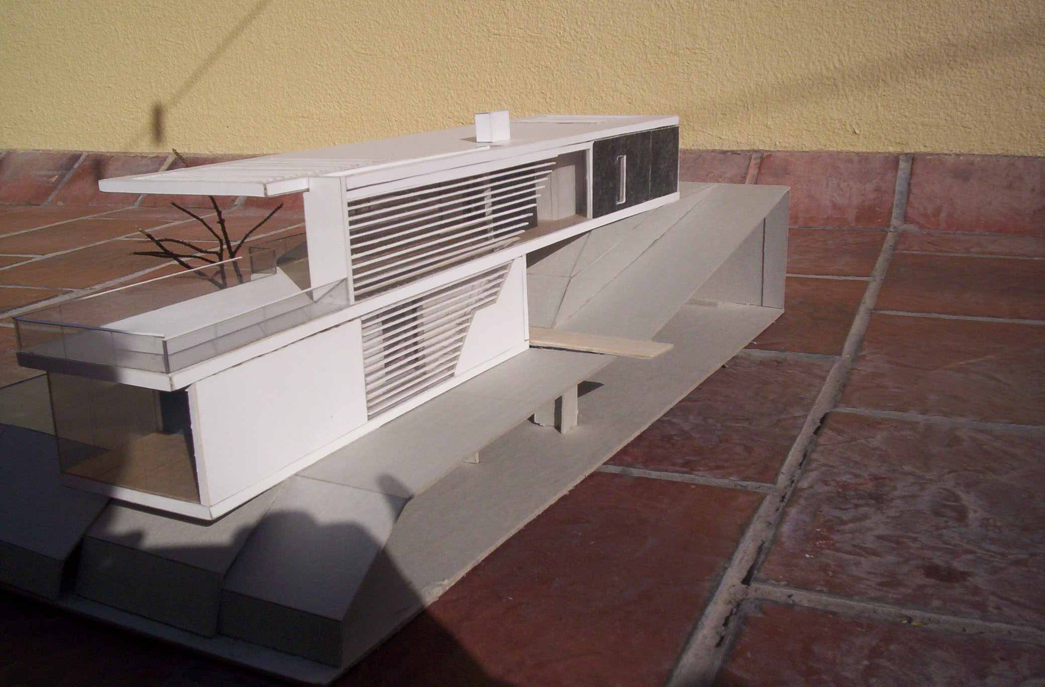 HORIZONTALY SHAPED HOUSE Part 1 Project 2007 María Cecilia Coll University of Mendoza | Argentina The house emerges from the earth and with incredible horizontal strenght approaches the water,creating a shape that outstands and at the same time mingles with its surroundings.Situated in a sloped site a white horizontal shape rests lightly on the terrain. The reinforced concrete generates a plain roofing that developes into a ‘pergolla’ (open gallery), wich reinforces the horizontal idea of the house, also enhaced by ‘bris soleils’ that produce lights and shadows in the interior spaces. The house's internal distribution is in direct relation with its shape, creating a lineal tour that ends in the water. Troughout the year the students develope two houses: one, horizontally shaped in a sloped site, and an other, completelly opposite to the previous, vertically shaped. Both of them have very specific programs and determined goals to achieve. This forces the students to use all their creativity and all the resources available to solve the problems that they face concerning function, space, site relation, materials and structure. The product of this creative process is marvelous, producing excellent architectural designs, such as the ones chosen from this student.