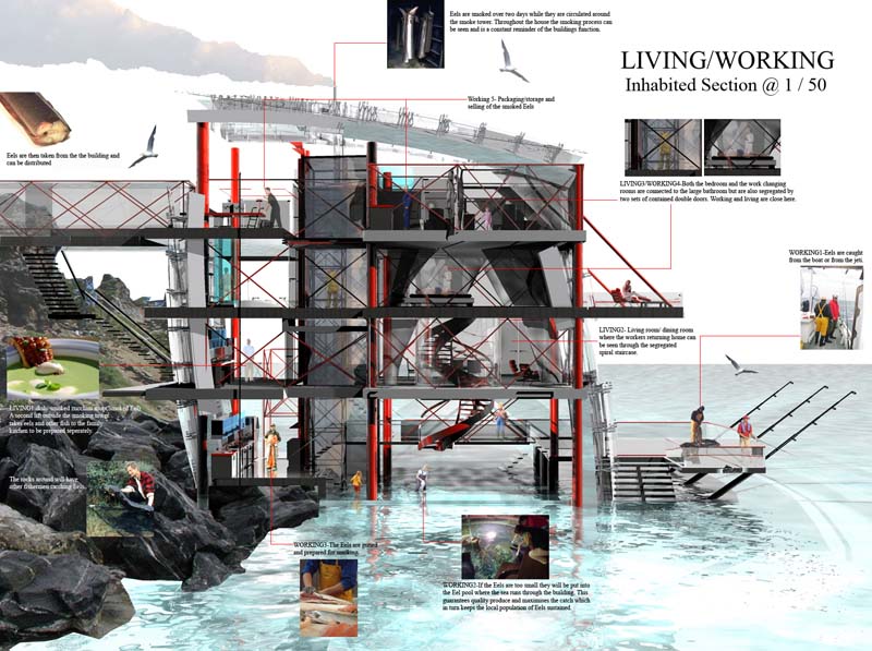 The largest eel ever caught from a land line was hooked from Devils Point. The 'Eel House', positioned where this eel was caught, explores ephemeral moments between working spaces and living spaces and in turn how the users of those spaces interact. The commercial process of fishing, farming and preparing eels flows in and out of the family living spaces creating a constant reminder of the primary house function. Through this industrial process, the next generation of users have an added respect for a sustainable eel population and a sustainable lifestyle.